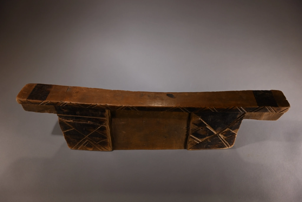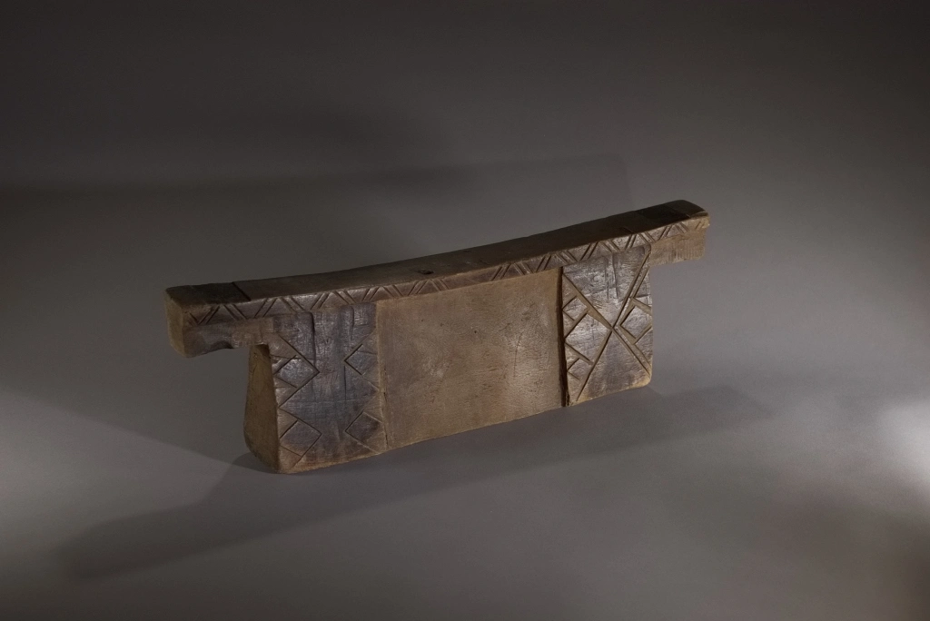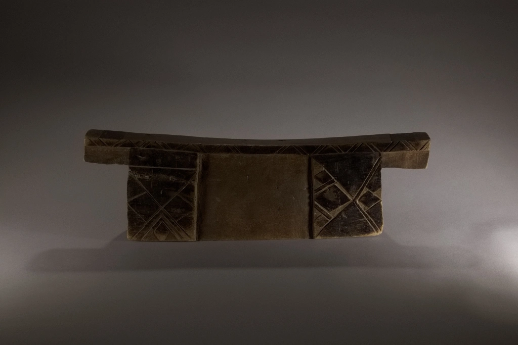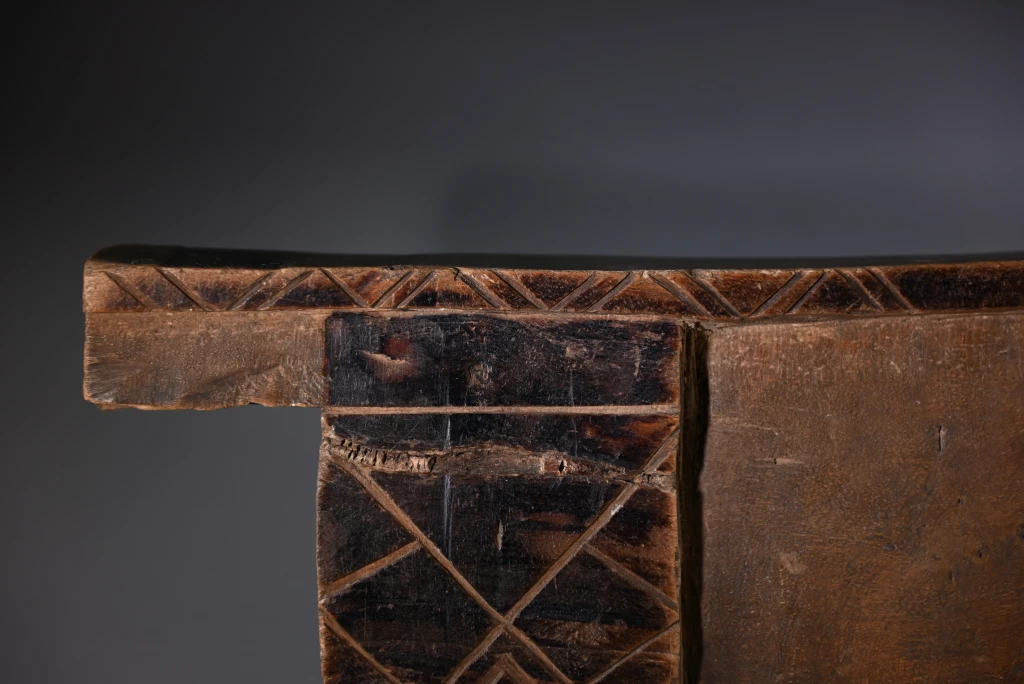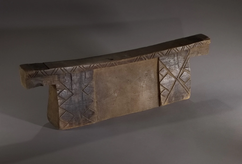 Un bloc Msinga, de forme traditionnelle aux dimensions imposantes. Sur les deux faces, apparaissent, aux extrémités, de larges pieds saillants décorés de triangles et de rectangles noirs délimités par des rainures claires.