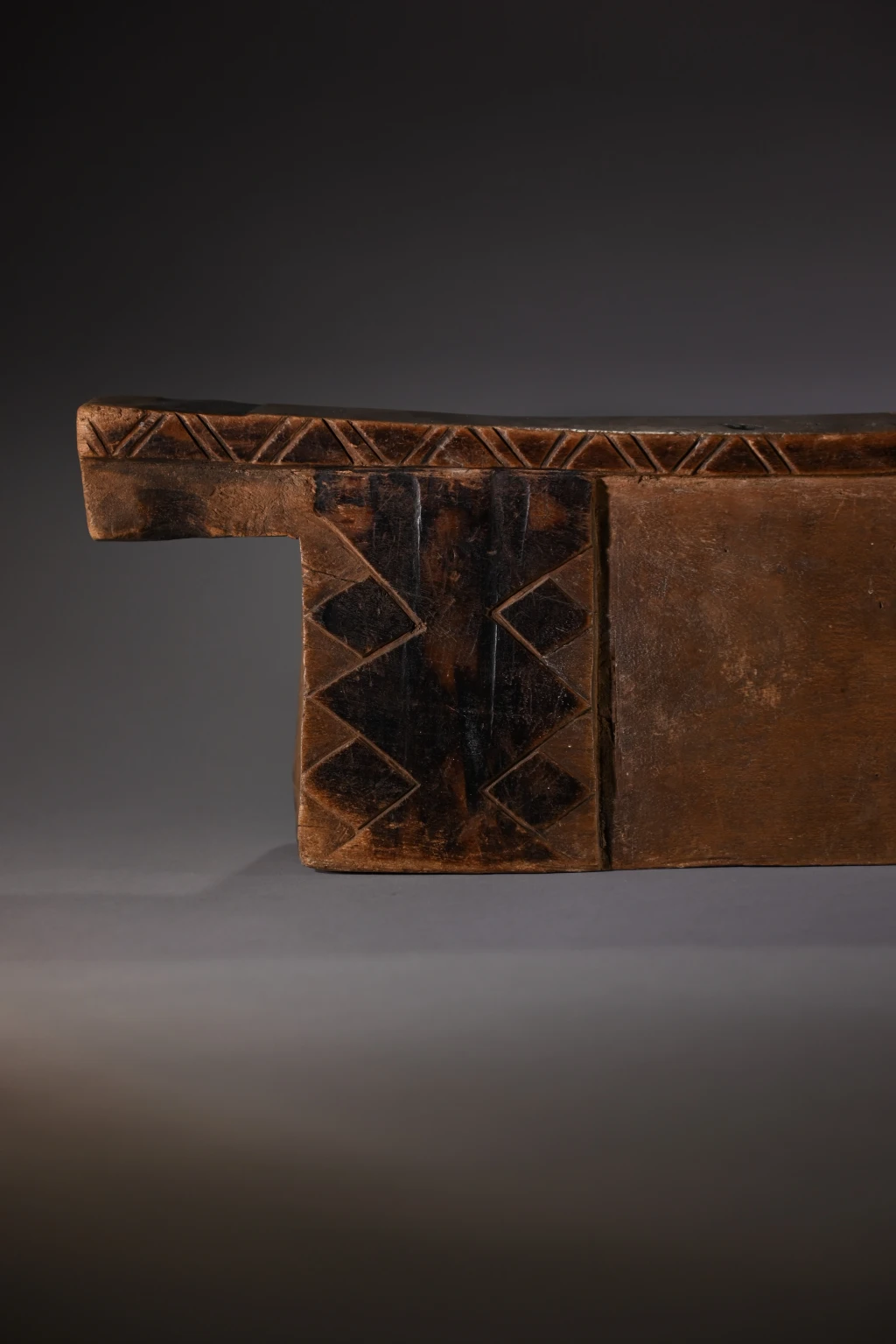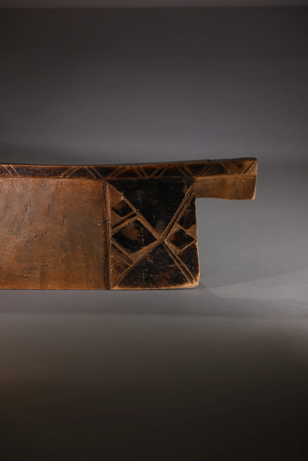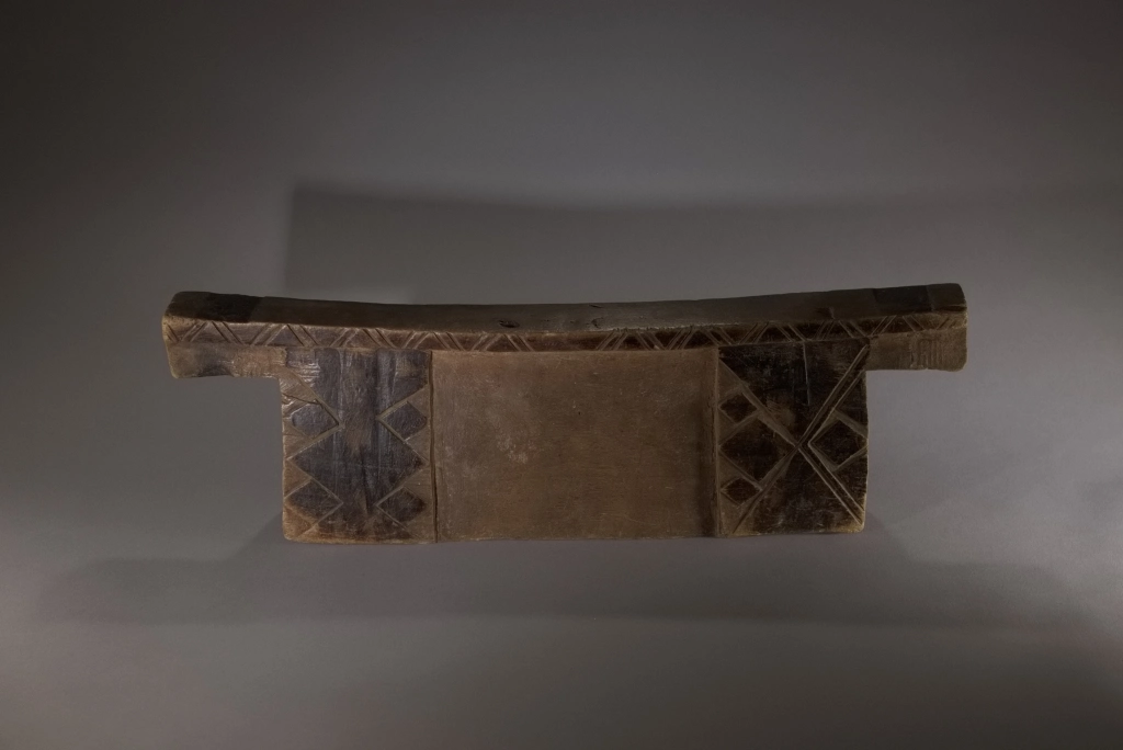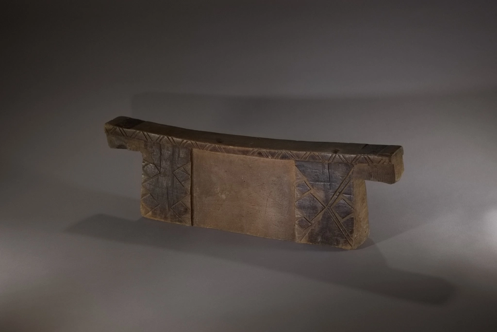 Un bloc Msinga, de forme traditionnelle aux dimensions imposantes. Sur les deux faces, apparaissent, aux extrémités, de larges pieds saillants décorés de triangles et de rectangles noirs délimités par des rainures claires.