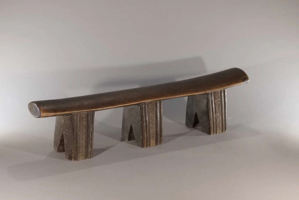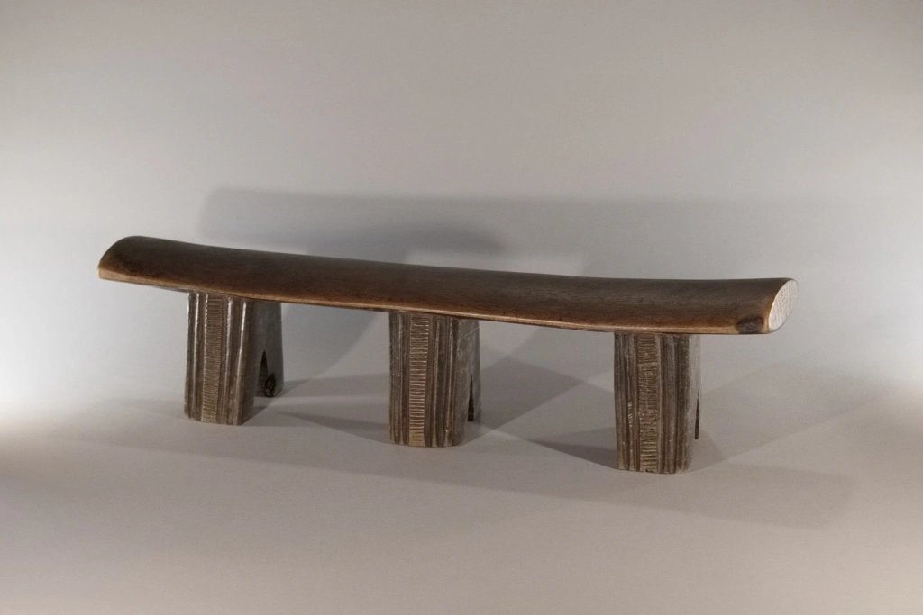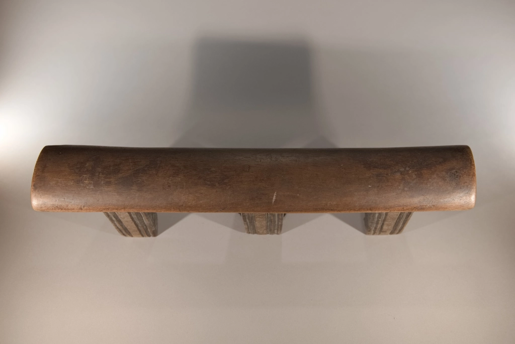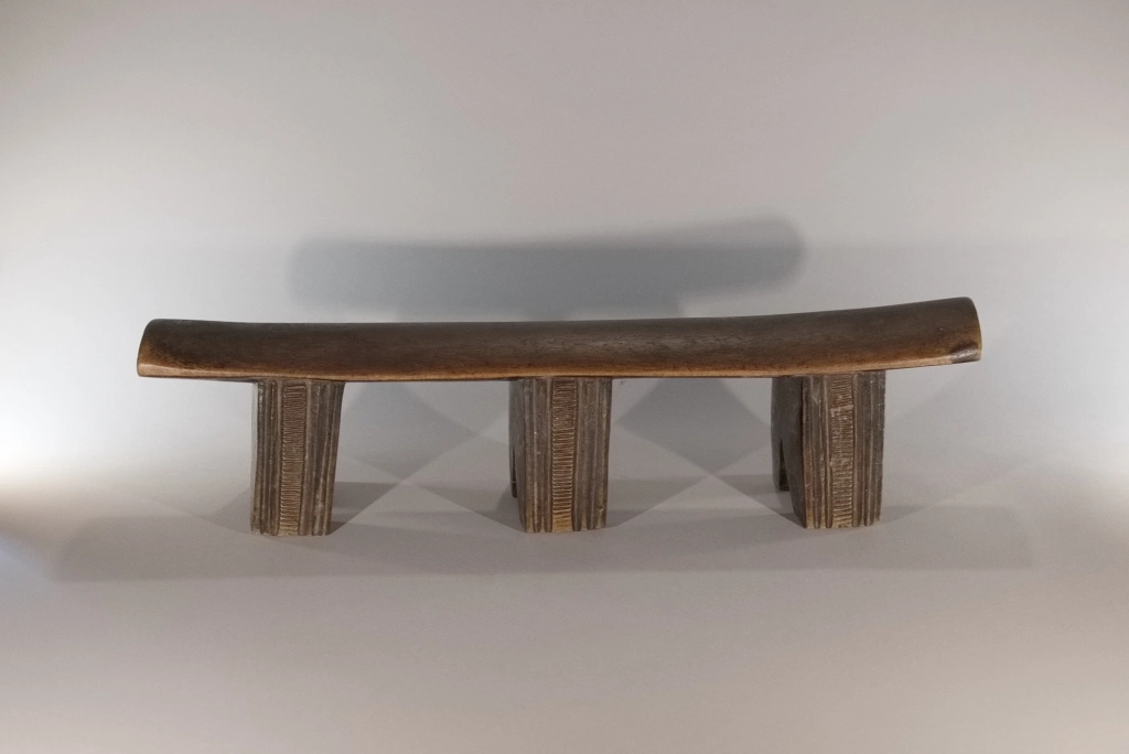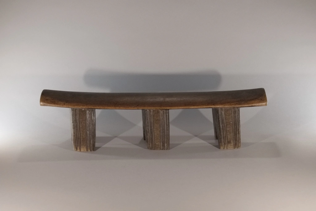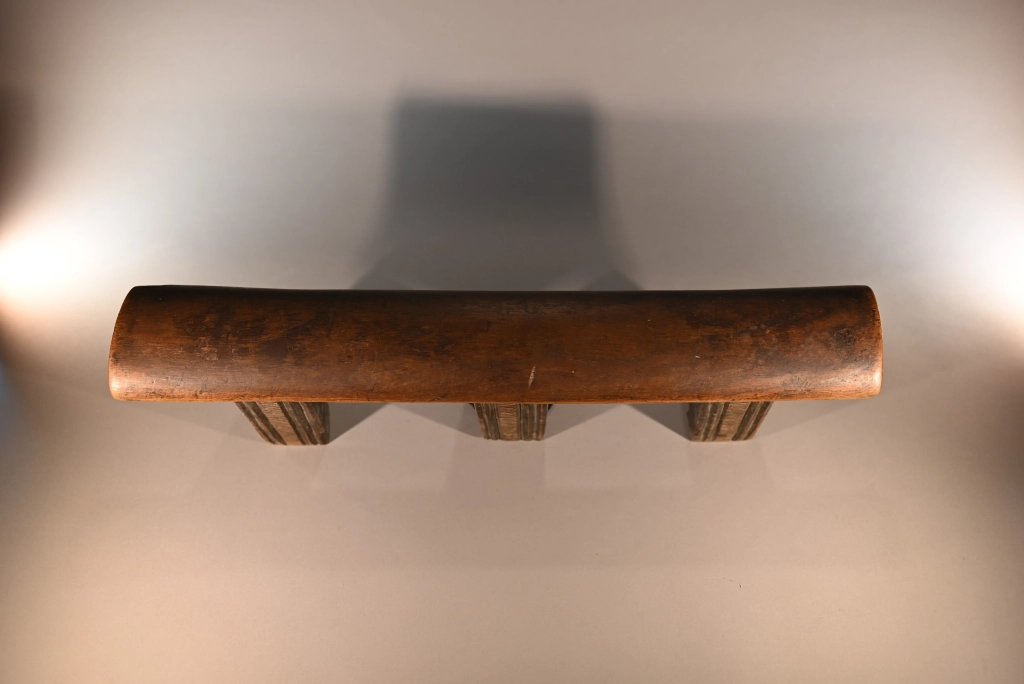 Un classique de l’art des appuis-tête zoulou : une œuvre du sculpteur DLADLACe design de Dladla semble avoir été populaire mais inégalable. D’autres exemples se trouvent dans les collections de la Standard Bank Foundation de l’Université du Witwatersrand et du Museum of Africa à Johannesburg. Dladla était considéré par beaucoup dans sa région comme le meilleur sculpteur sur bois de sa génération. Il est décédé à l’âge de 80 ans en 1997. Cet appui-tête à trois paires de pieds-droits est finement décoré de cannelures verticales séparées par une rangée de courtes stries horizontales. Chaque paire de pieds est légèrement décentrée et très éloignée l’une de l’autre, donnant l’impression qu’elles semblent marcher à l’unisson.Légèrement incurvée, sa plate-forme de couchage est arrondie et son bois dur présente une patine rouge profonde.