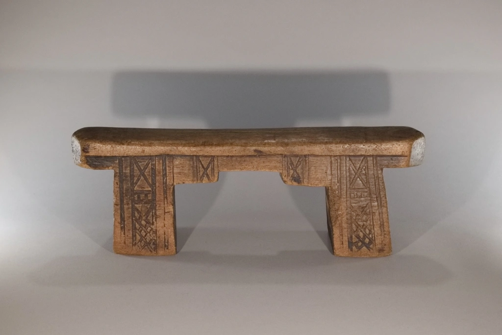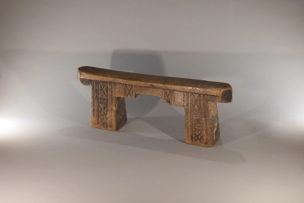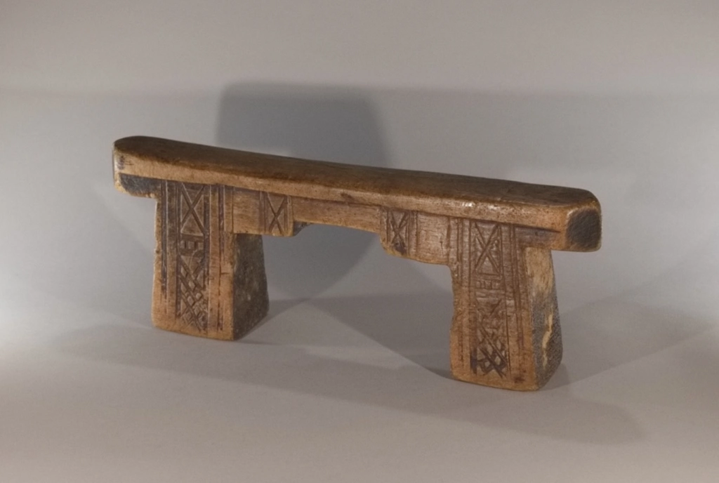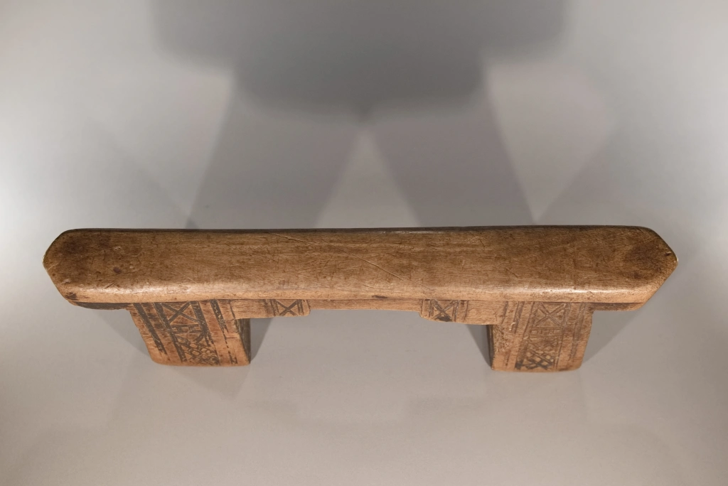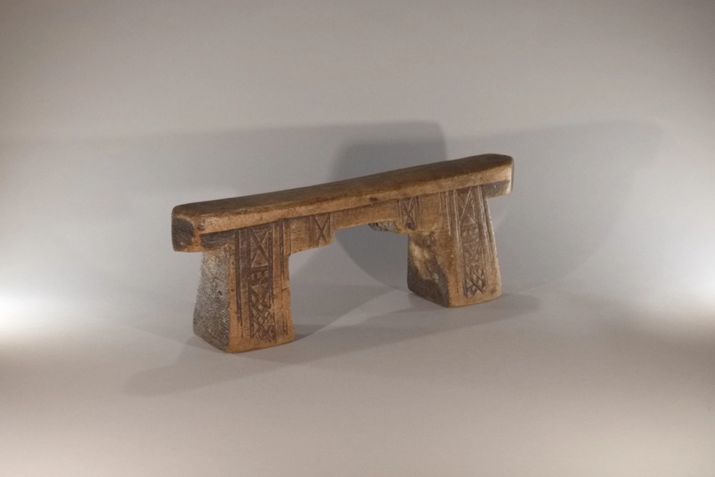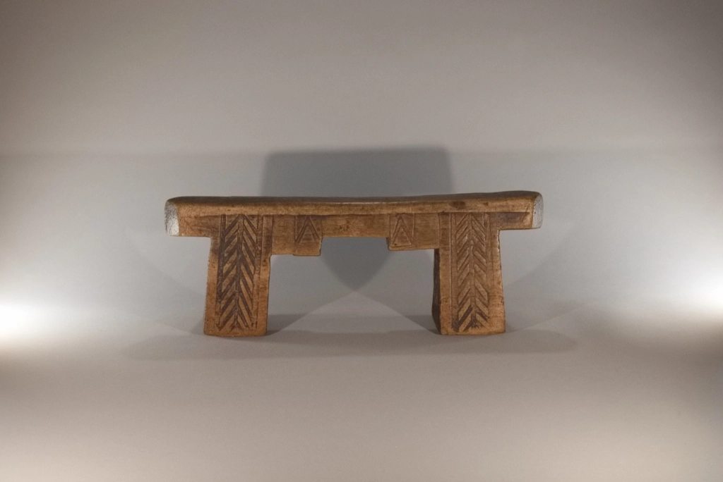 Un superbe appui-tête aux pieds et à la plate-forme découpés en forme de créneau. Fabriqué dans du bois de figuier extrêmement léger. Ses pieds sont décorés de façon différente sur les deux faces : chevrons d’un côté, croix sur l’autre. Cette pièce est restée propriété de la famille du chef du village d’Emaduzane, un siècle et demi avant d’être acquise par le conservateur du musée du Soweto. Un appui-tête qui attire l’œil des collectionneurs expérimentés comme celui des amateurs.