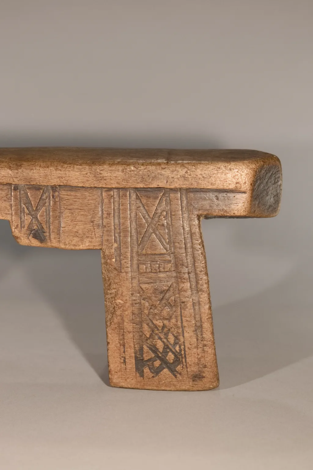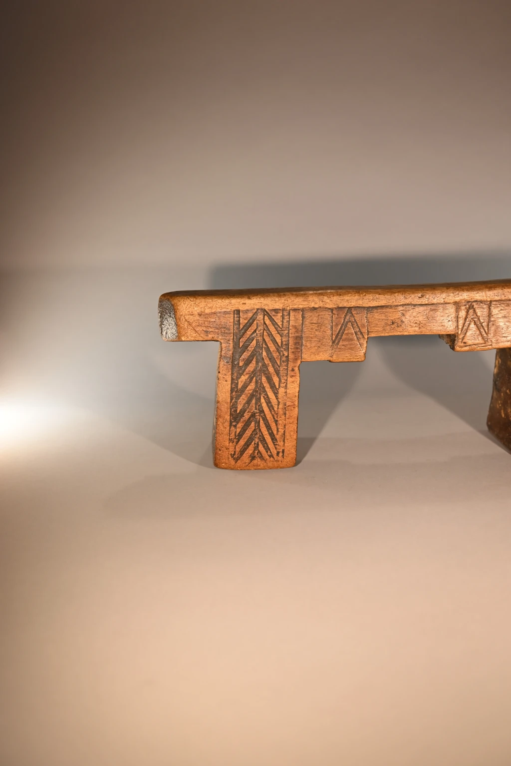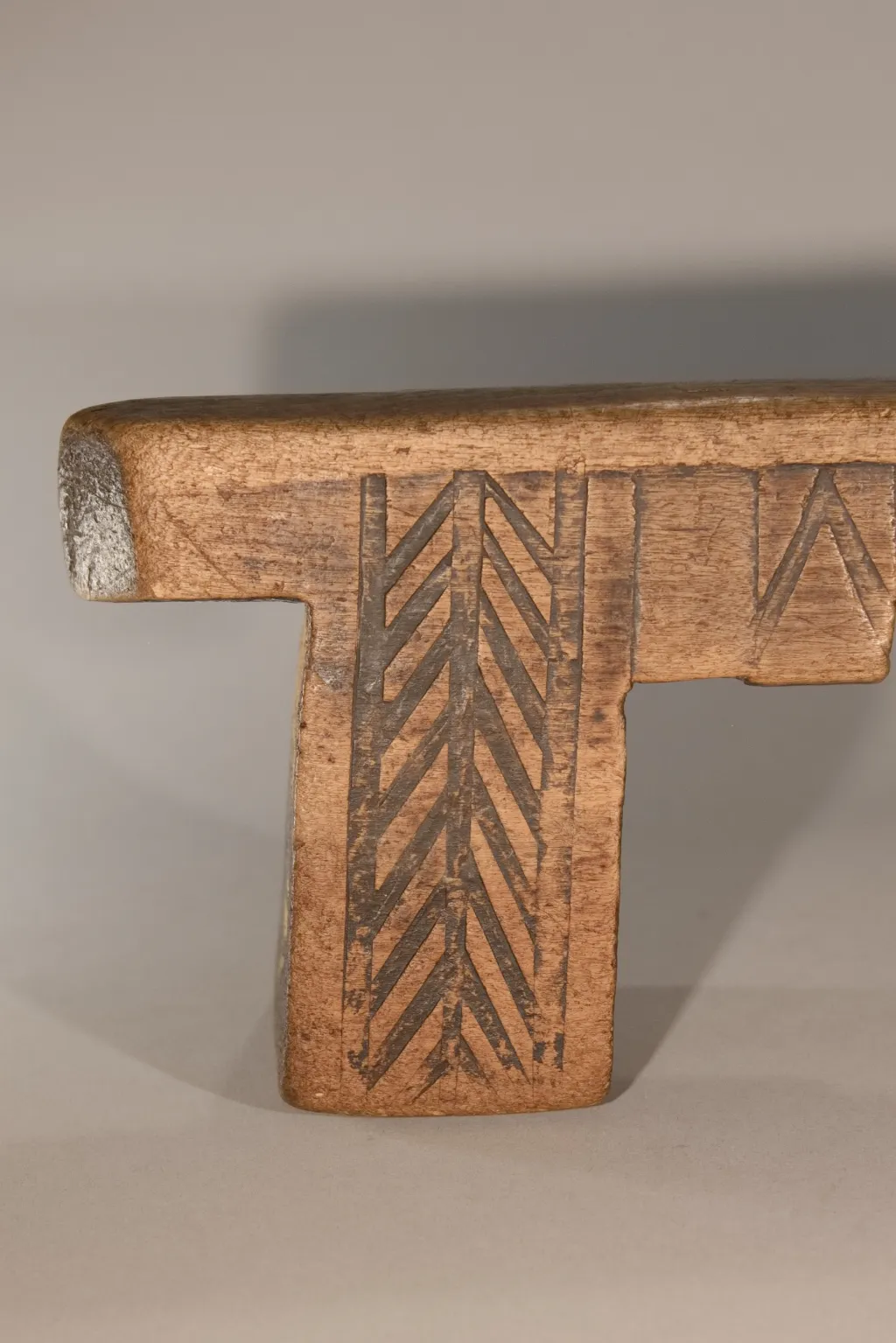 Un superbe appui-tête aux pieds et à la plate-forme découpés en forme de créneau. Fabriqué dans du bois de figuier extrêmement léger. Ses pieds sont décorés de façon différente sur les deux faces : chevrons d’un côté, croix sur l’autre. Cette pièce est restée propriété de la famille du chef du village d’Emaduzane, un siècle et demi avant d’être acquise par le conservateur du musée du Soweto. Un appui-tête qui attire l’œil des collectionneurs expérimentés comme celui des amateurs.