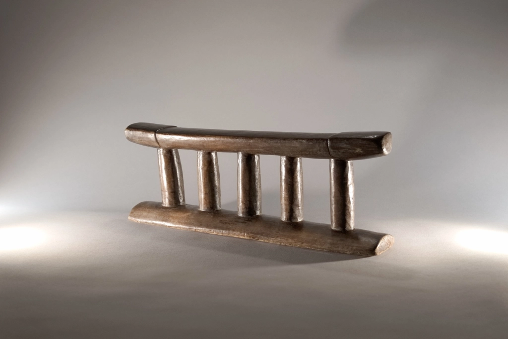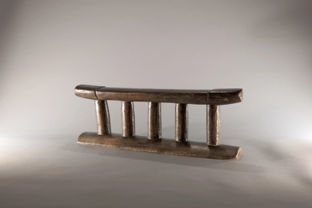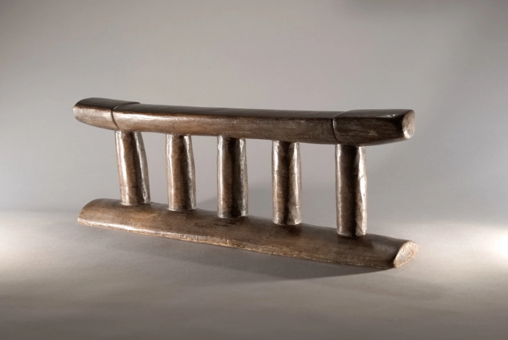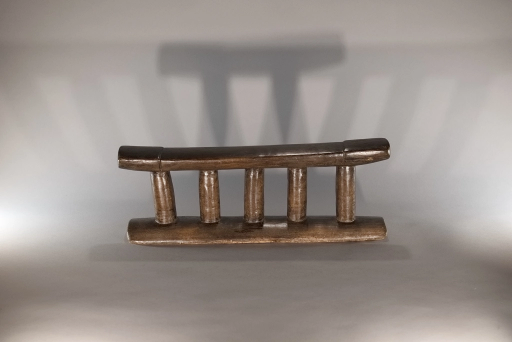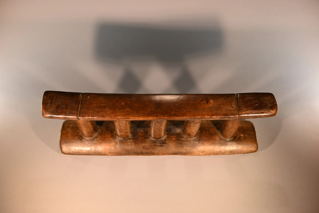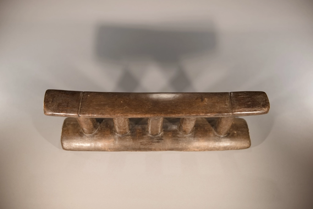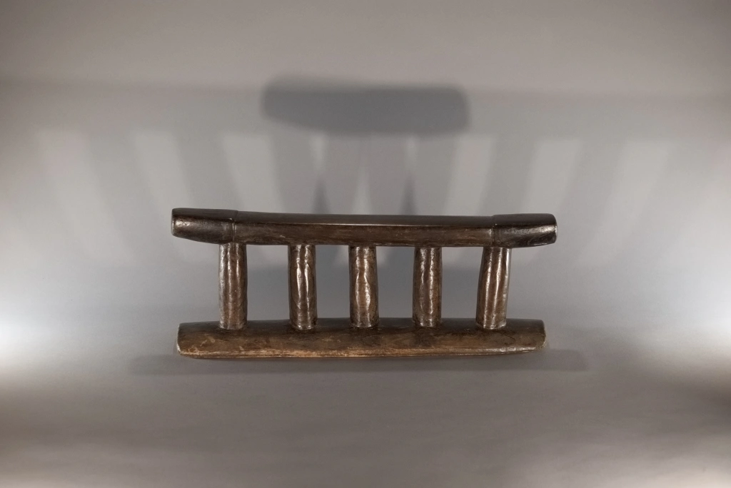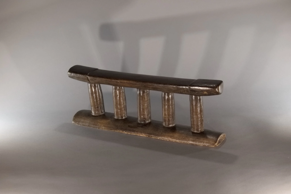 Un appui-tête du milieu du XXe siècle, constitué de cinq fines colonnes circulaires, donnant une belle transparence à l’objet. Sa patine foncée, laisse supposer une utilisation quotidienne pendant des décennies de nuit de sommeil. Ses atouts ont permis à cette pièce de faire partie de la collection personnelle de Menenguelli. Le célèbre collectionneur et propriétaire de la galerie de Durban entre 1970 et la fin du XXe siècle.