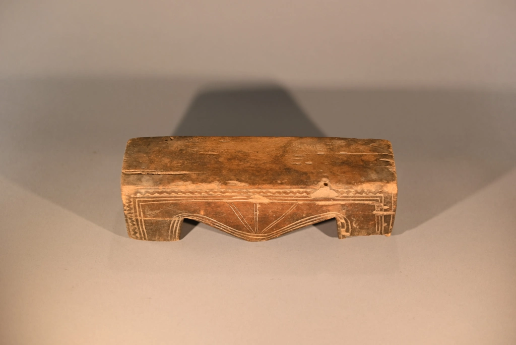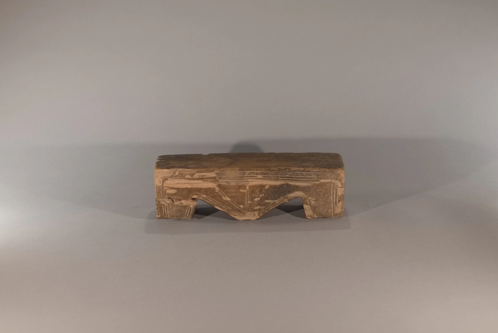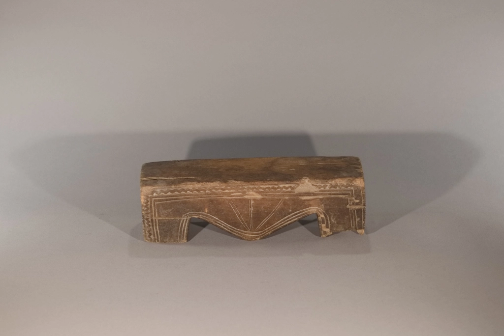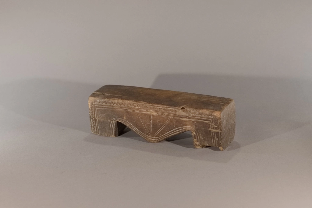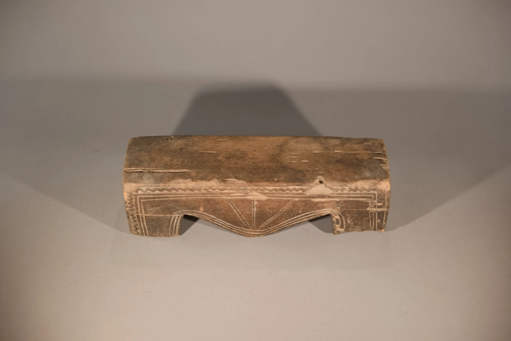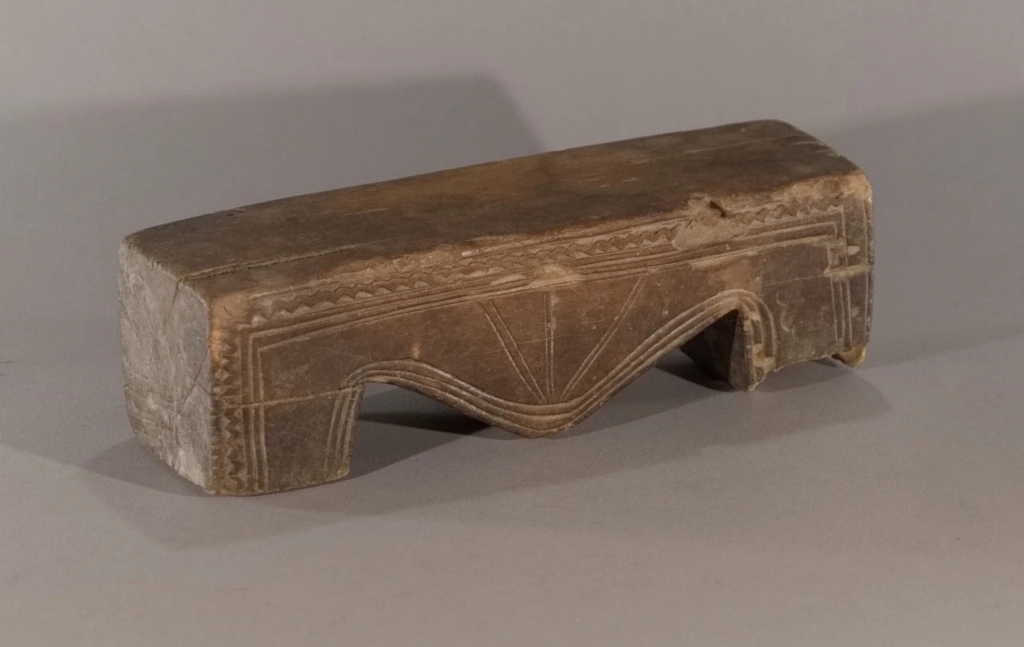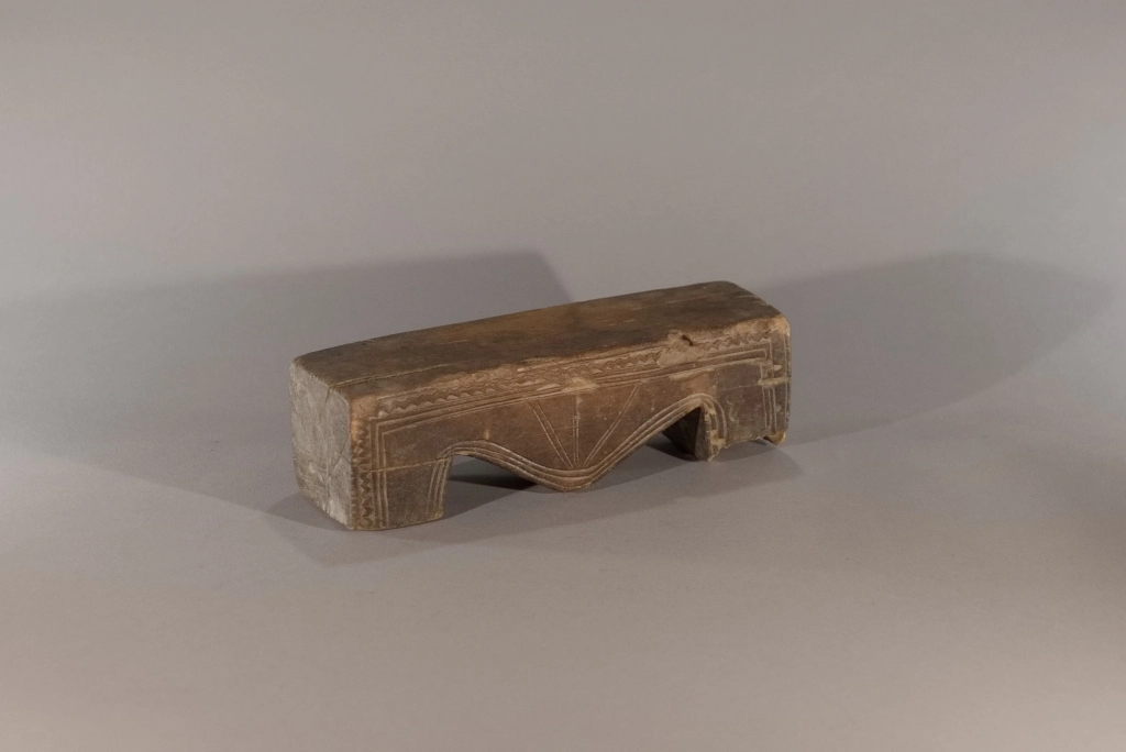 Un mini appui-tête zoulou pour enfants (moins de 30 cm de long et moins de 10 cm de hauteur) . Au-delà de la rareté des pièces pour enfants, chez les Zoulous (contrairement aux ethnies éthiopiennes) sa forme est particulièrement originale : une vague au centre de la plateforme constitue quasiment un troisième pied. Les craquelures et les coups reçus par cette pièce permettent de la dater dans la première partie du XXe siècle.