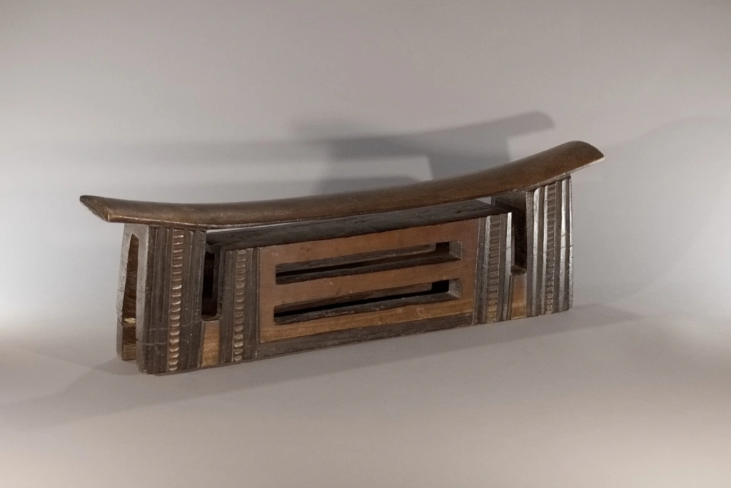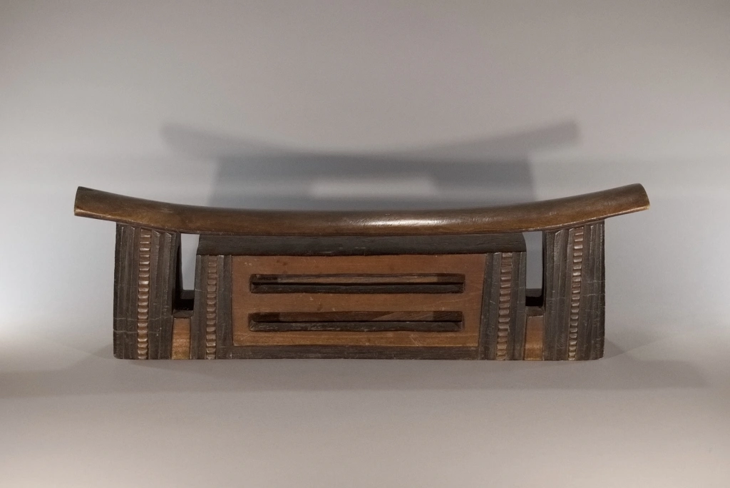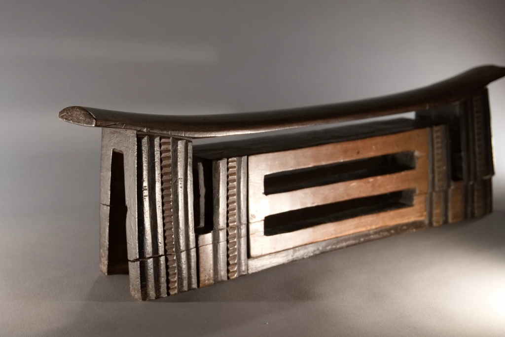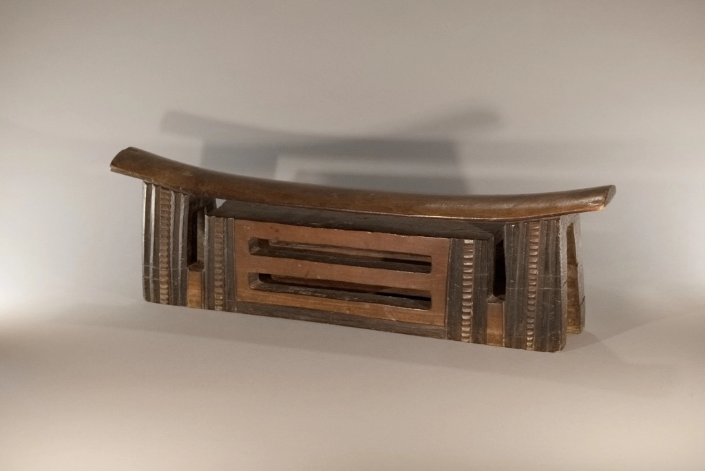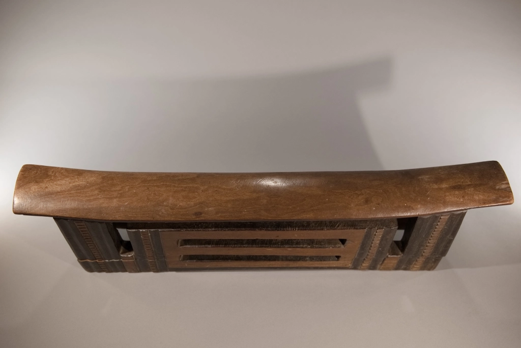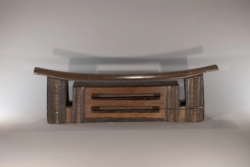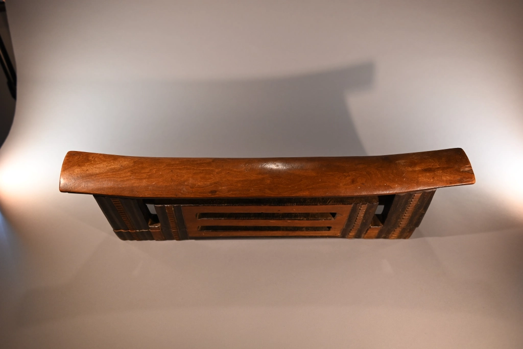 Une pièce mesurant plus de 62 cm, une des pièces les plus imposantes de la collection Zimer. Elle fait partie d’un jeu d’appui-tête de couple avec Z242, cette pièce est l’oreiller du mari. Elle s’est bien conservée à l’exception de la craquelure sur l’un des 2 pieds. De forme dite complexe, la partie interne de l’appui-tête est ajourée de deux fentes en mode persienne. Les alternances de bandes noires et brunes font ressortir l’esthétique de cette sculpture en l’allégeant, malgré sa taille, son poids et sa majesté.
