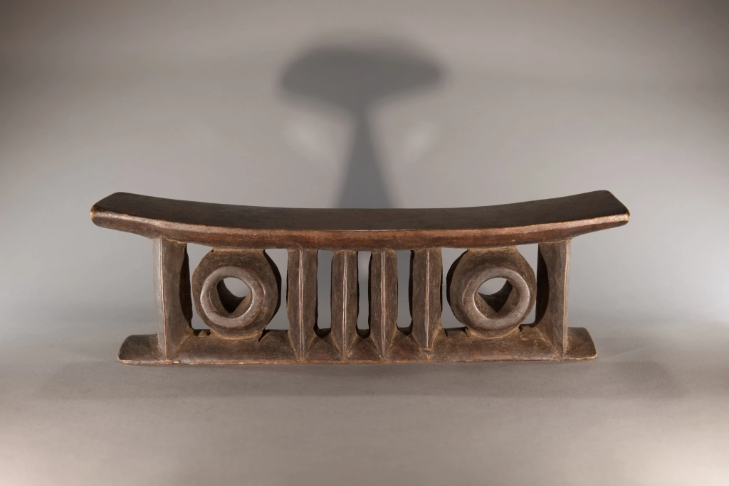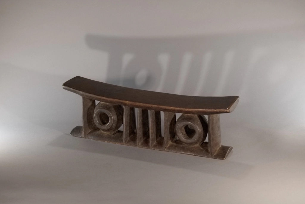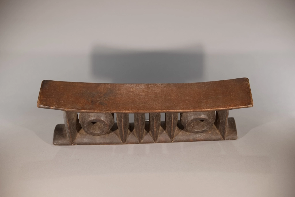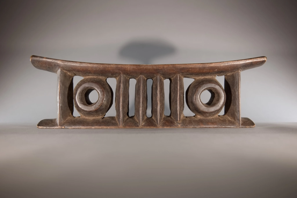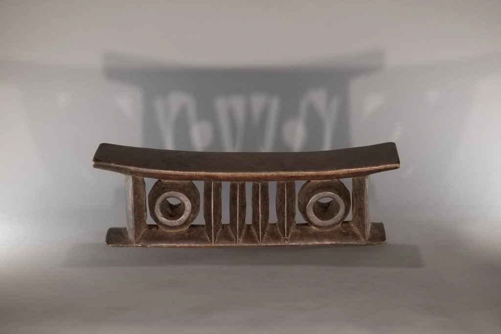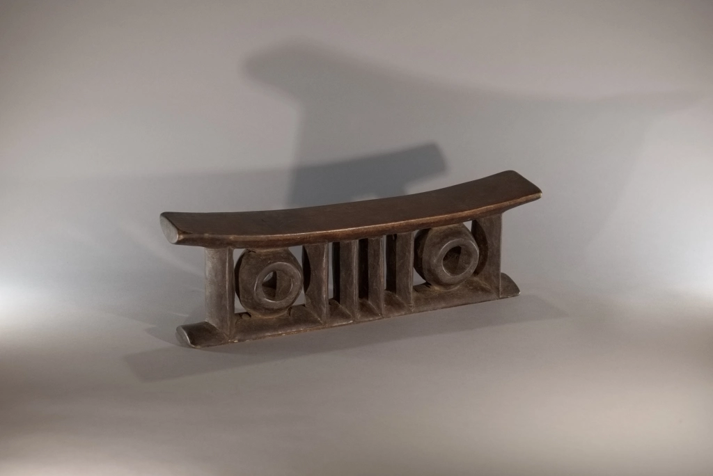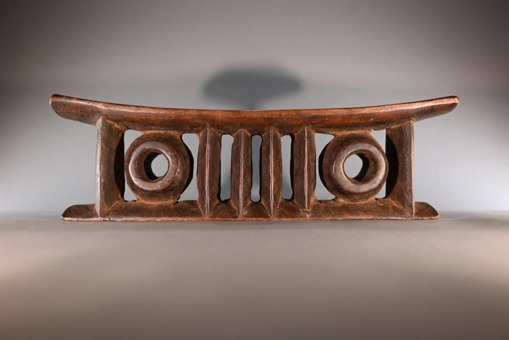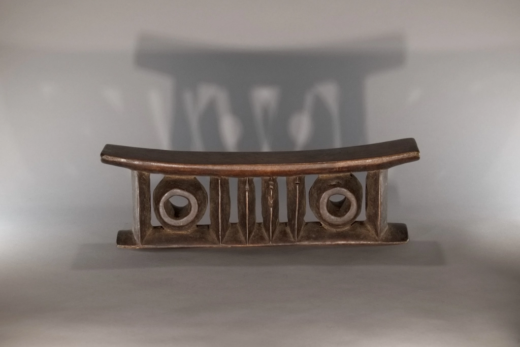Une pièce comprenant deux colonnes extérieures et quatre centrales de forme oblongue ainsi que deux cercles, le tout supportant, une plateforme épaisse. Le British Museum expose une pièce extrêmement proche de celle-ci, certainement sculptée de la même main, nous permettant de dater ces pièces dans la première moitié du XXe siècle, une preuve de l’intérêt de cet appui-tête de forme originale.