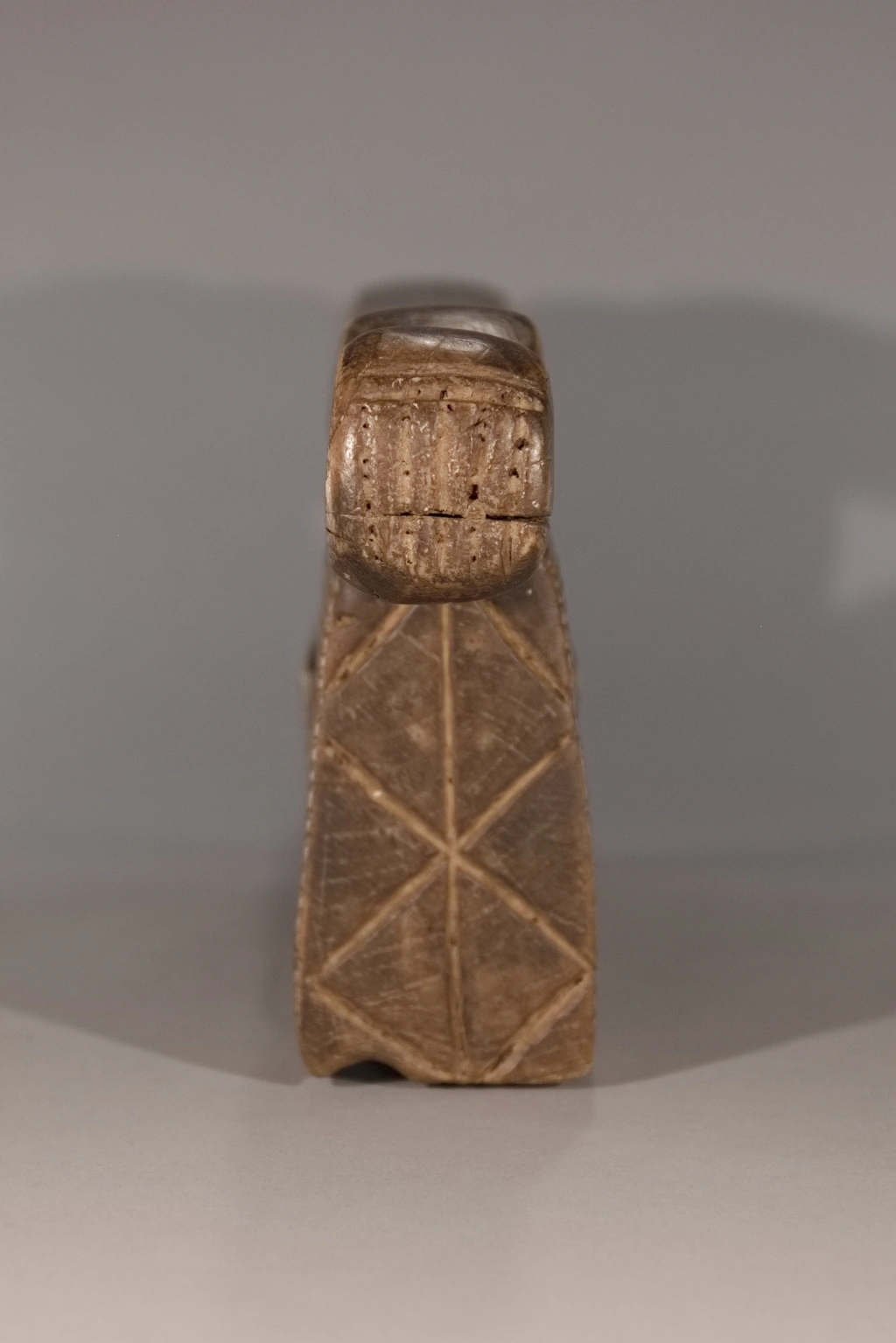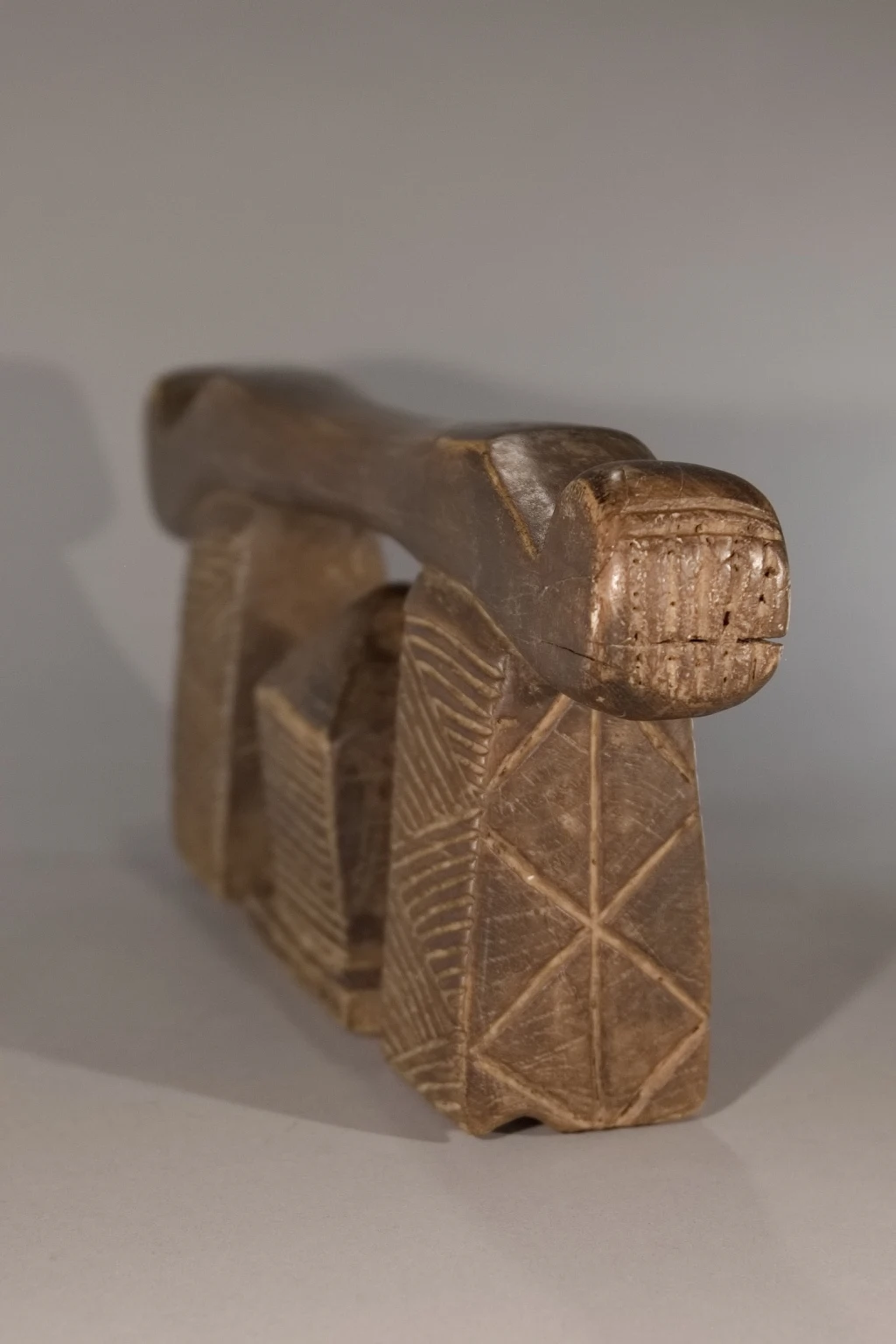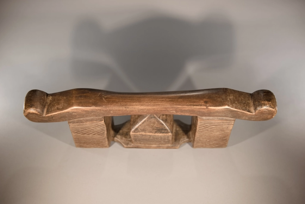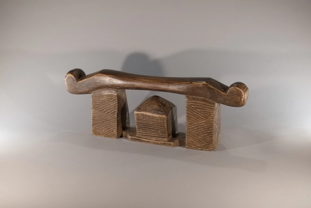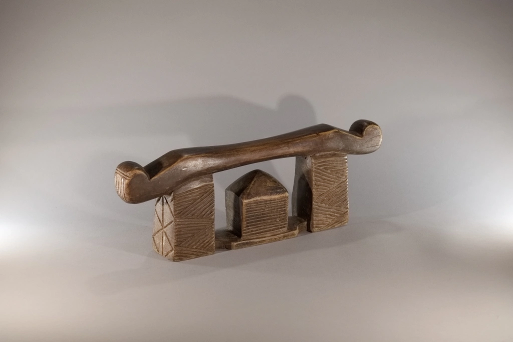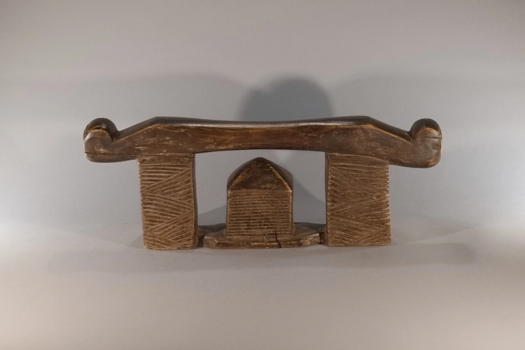 Un appui-tête qui repose sur une base de forme inhabituelle : une maison en briques. Les extrémités de la plateforme se rétrécissent, créant un effet quelque peu zoomorphe. Les décorations comprennent des hachures de style amasondo et des rainures sur les pieds, ainsi qu’évidemment, les briques finement sculptées de la maison. Collectée à Vmlazi, une ville à proximité de Durban, cette pièce appartenait précédemment à une famille d’éleveurs, qui se servait de leurs appuis-tête comme d’un tabouret pour surveiller le bétail. Ceci explique la hauteur de 17 cm de cette pièce plus haute que la moyenne. Le profil de cet appui-tête, une maison protégée par la plate-forme d’appui, se retrouve, notamment dans les collections de Dardavel Sabine ou Goodall.