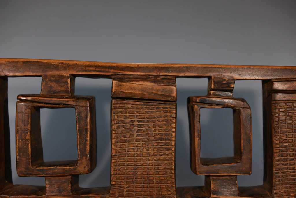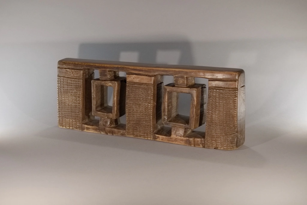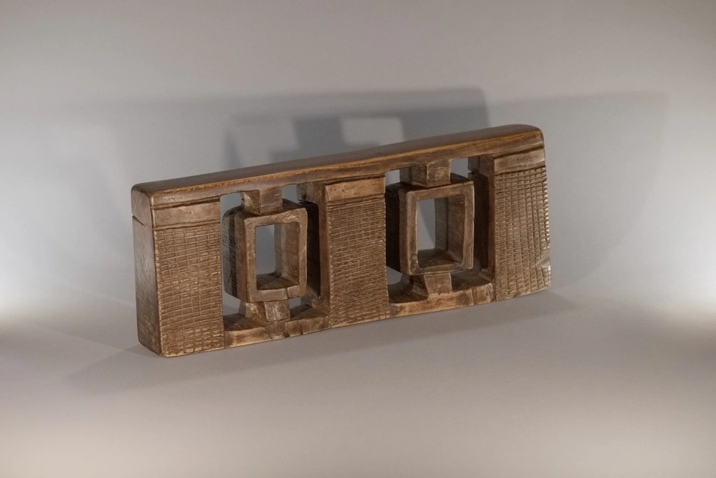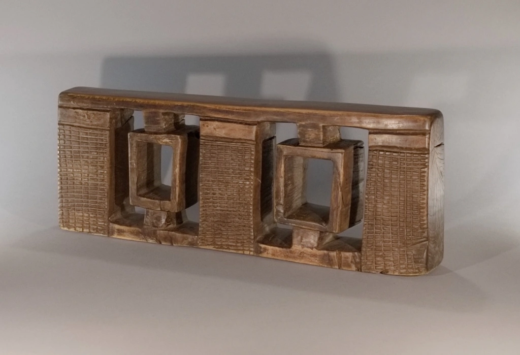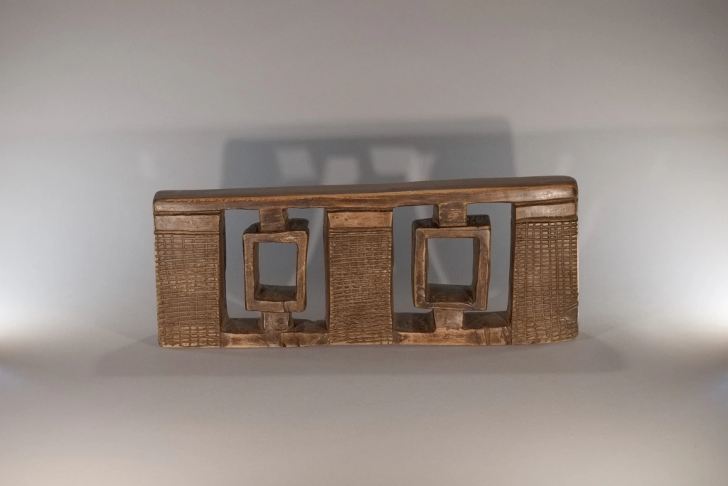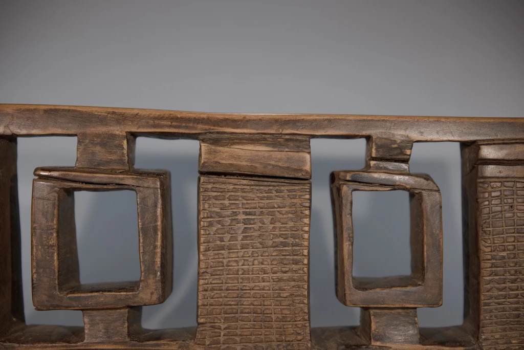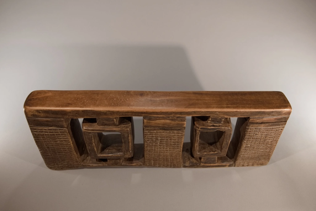 Cette pièce proche de Z150 est de la même main que celle de la collection Calverton représentée dans l’ouvrage Zulu Tribal Art de Zaloumnis. Elle diffère cependant sur plusieurs points : plus foncée plus haute (fonction de tabouret également probable) elle représente plutôt deux rectangles en suspension que deux carrés. Cet appui-tête était utilisé par les hommes du village pour protéger leurs coiffures pendant leur sommeil. De nombreux pasteurs sud-africains considèrent les coiffures principalement comme un indicateur de statut. Un jeune homme a le droit de commencer à porter les coiffures distinctives à l’âge adulte, seulement après son initiation. L’utilisation de l’appui-tête est souvent associée à cette étape de sa vie et l’appui-tête lui-même devient ainsi indirectement un symbole de statut.