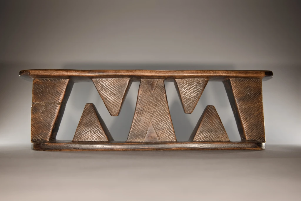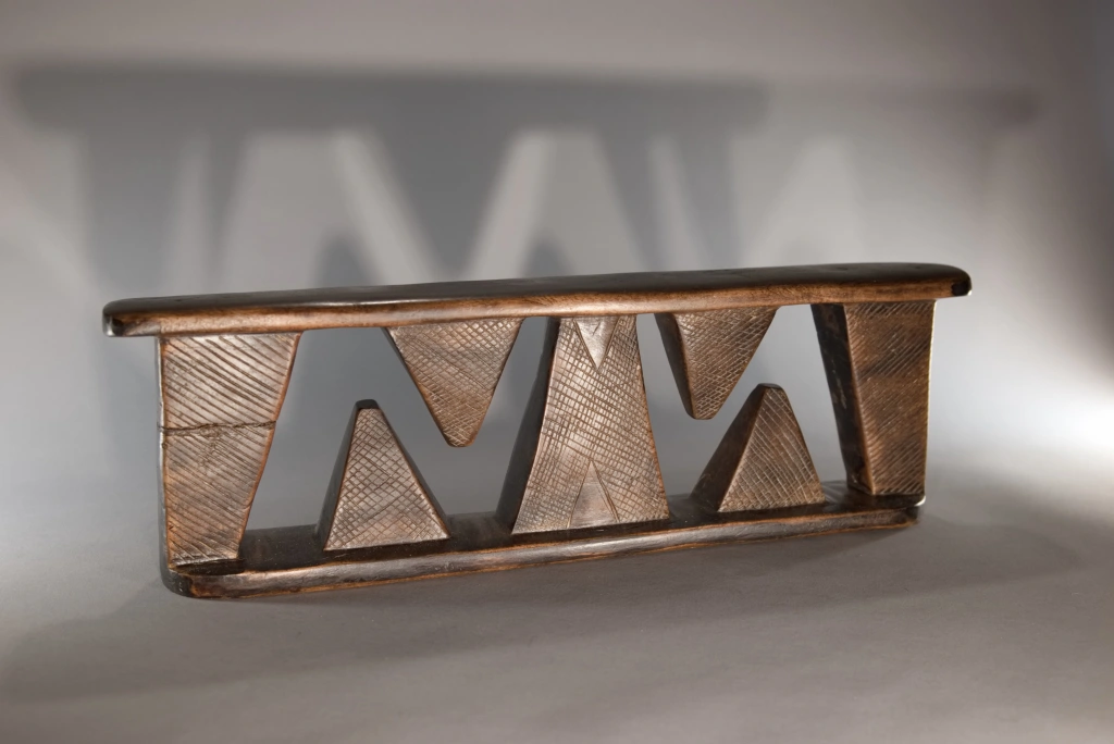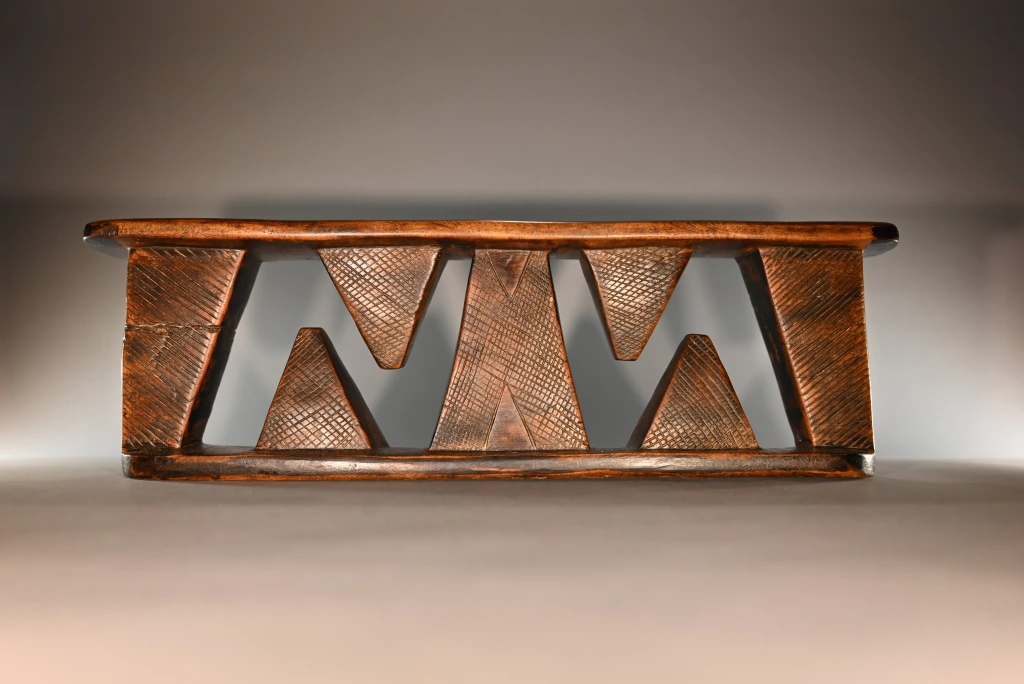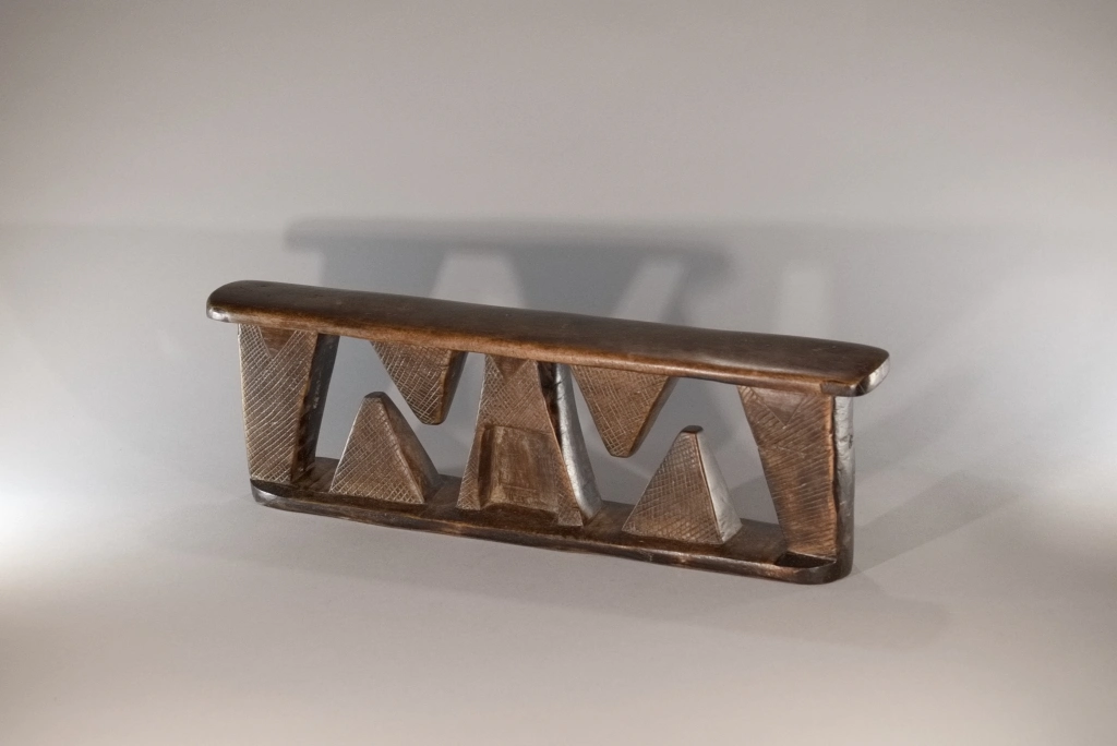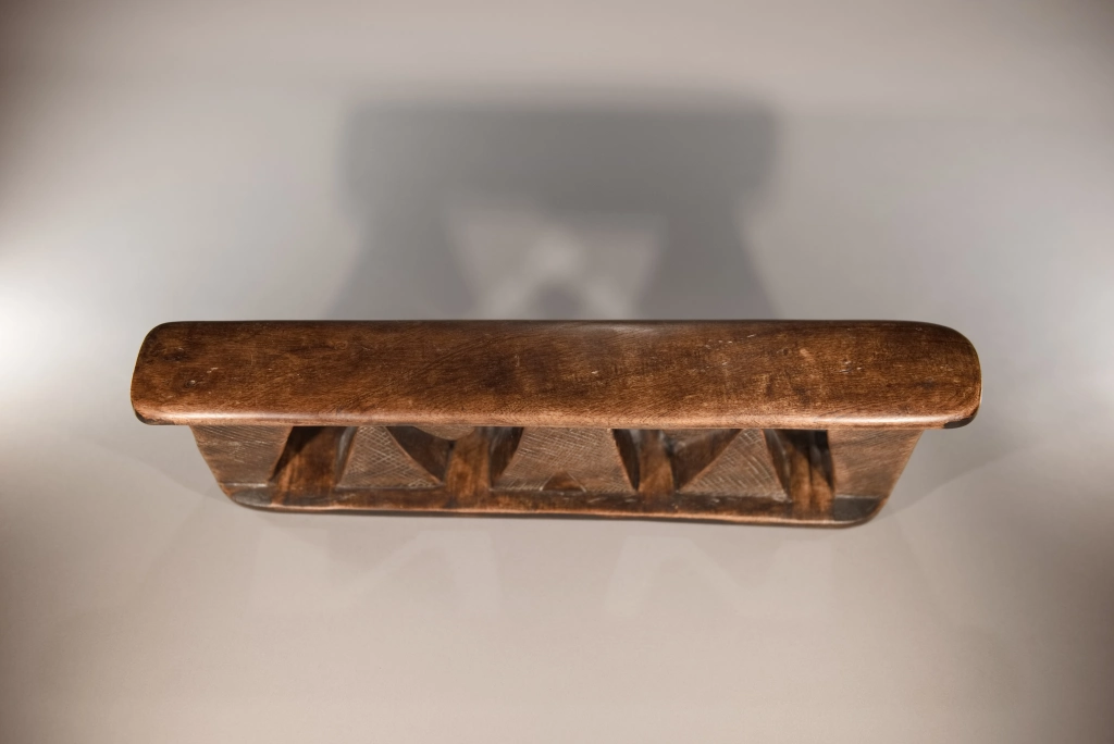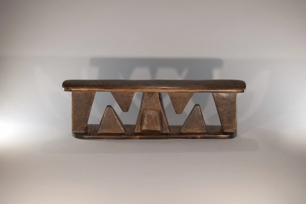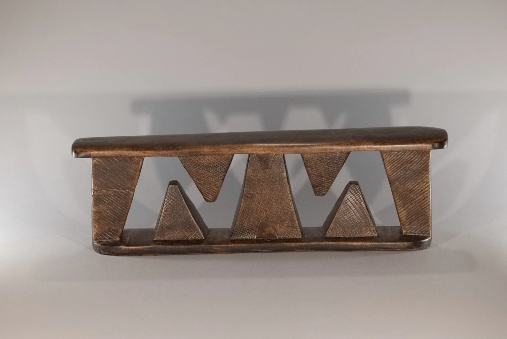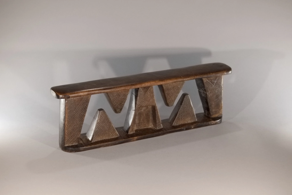 Superbe, unique, originale, parfaite. Cette pièce fascine tout collectionneur d’appui-tête, plus largement tout amateur d’art zoulou, et même d’art africain tout court. Aucune pièce comparable n’a été identifiée à ce jour dans les diverses collections privées ou musées. N’ayant malheureusement pas réussi à identifier le sculpteur, nous ne pouvons qu’admirer la conception de la pièce en forme « de mâchoire de crocodile », la petite cavité fonctionnelle pour y loger des effets personnels, mais aussi la disposition élégante et la qualité technique des amasumpa finement ciselés. Une merveille !