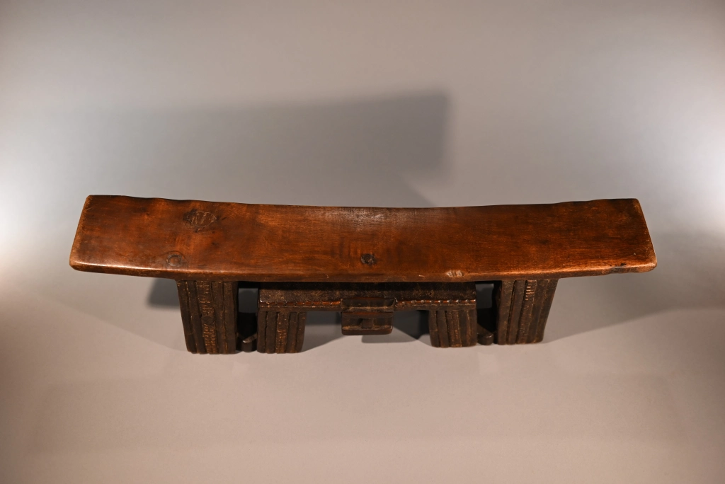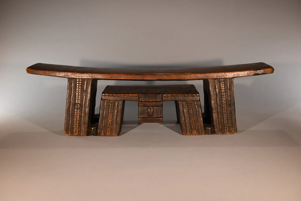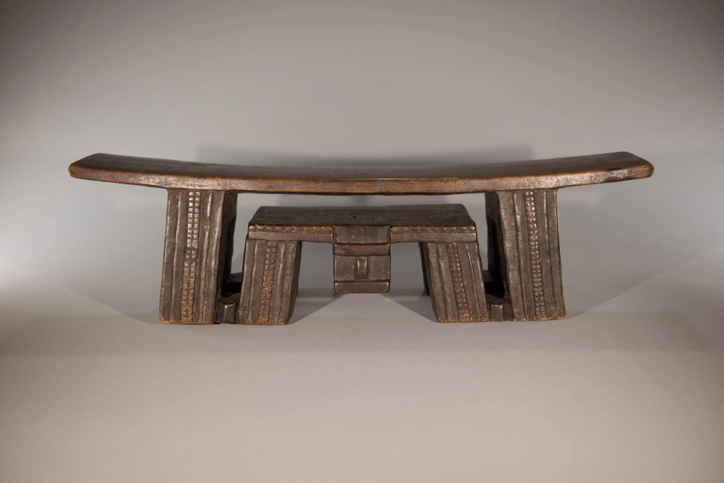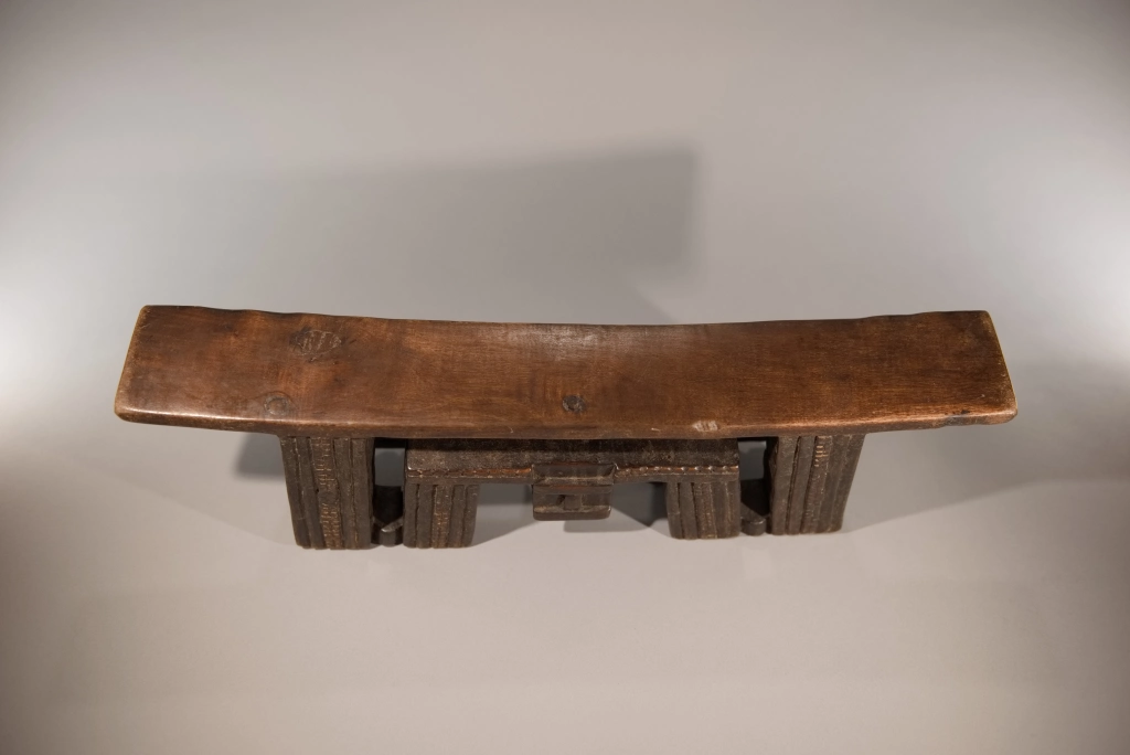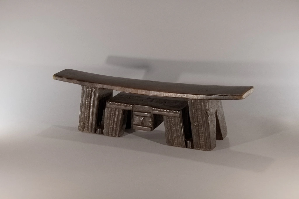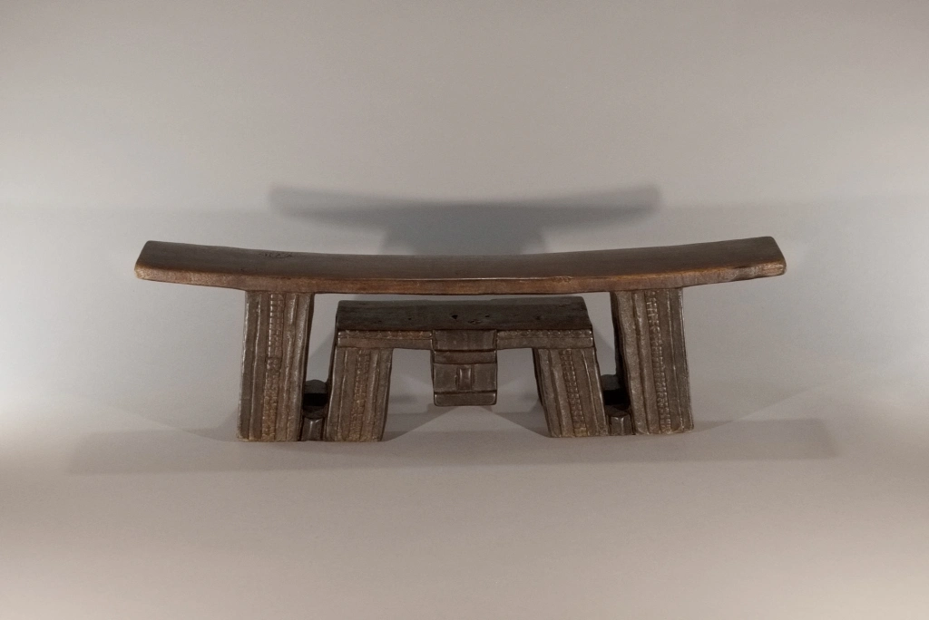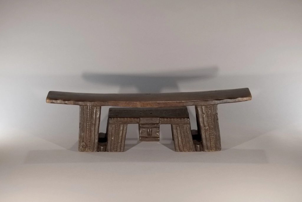 Une superbe pièce comme toutes les œuvres du sculpteur Dladla une des stars de son époque, décédé octogénaire en 1997. On reconnaît son style typique, comme sur la pièce Z004 : la plate-forme inférieure de cet appui-tête étant par contre plate sur toute sa longueur, on retrouve les bandes fines d’amasumpa sur les 2 pieds, apportant finesse et sophistication. Cette pièce qui faisait partie de la collection Menenguelli, propriétaire d’une fabuleuse galerie à Durban a été cédée à un couple italien pour ensuite parcourir diverses collections sud-africaines et finir dans la collection Zimer