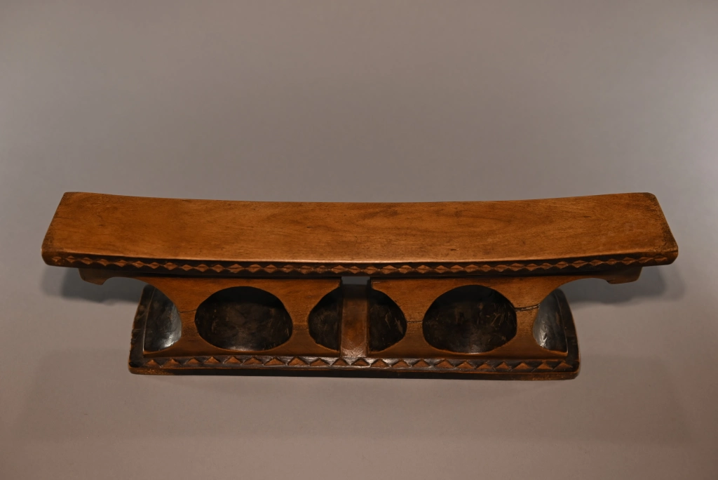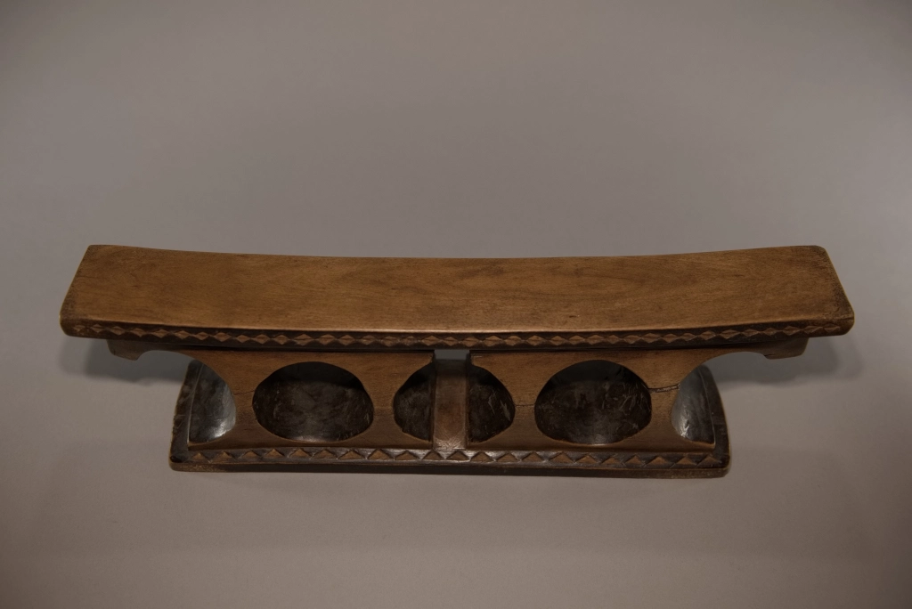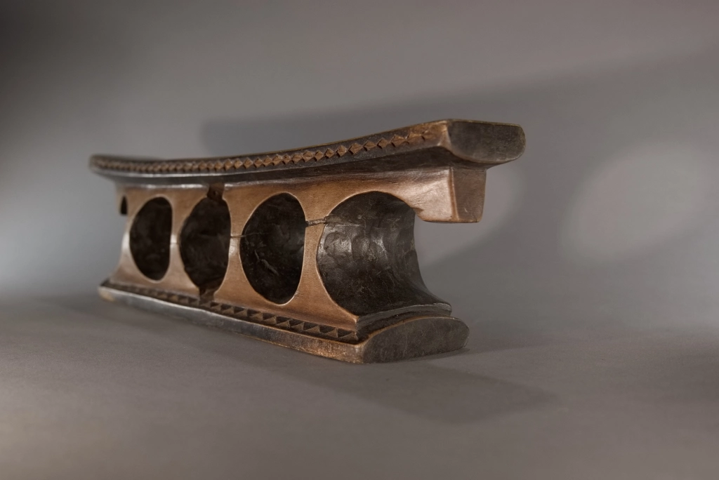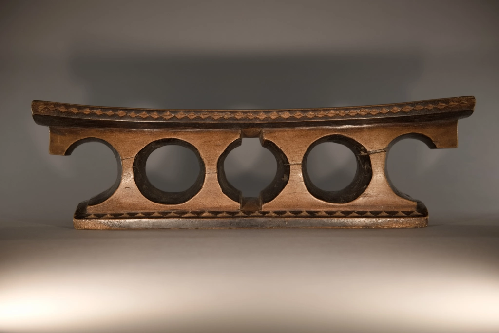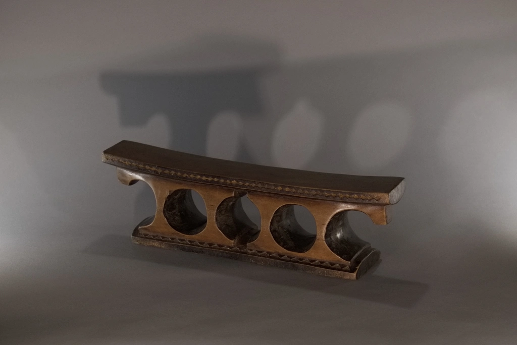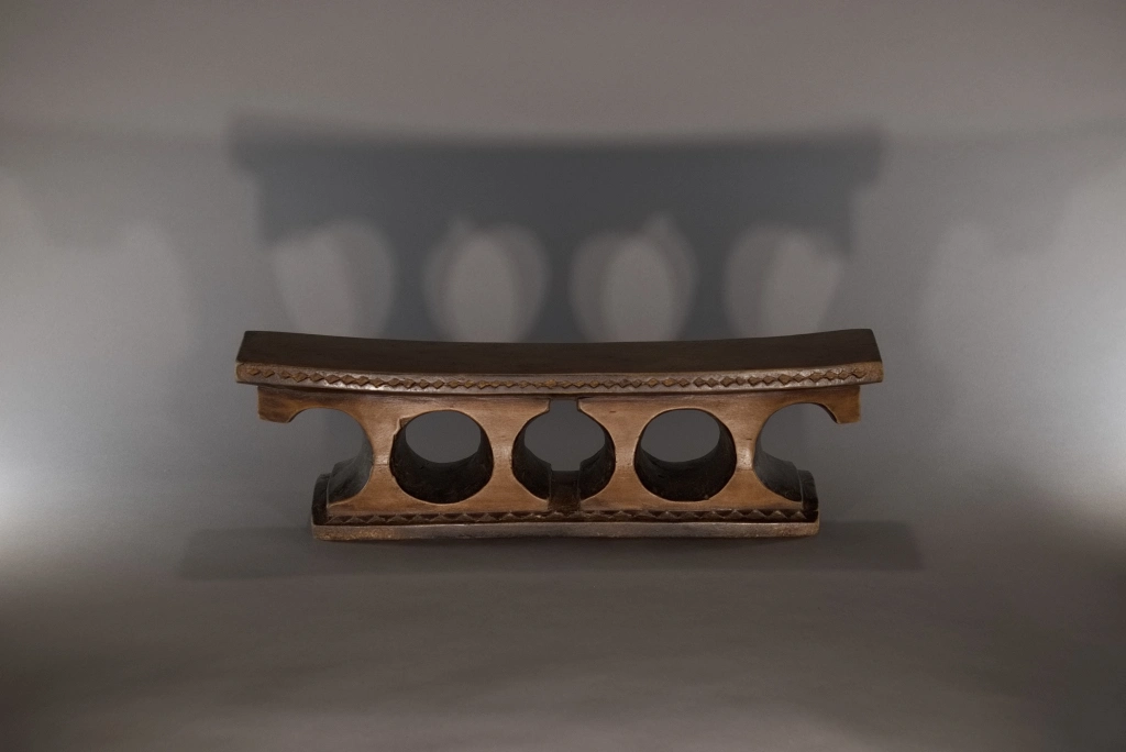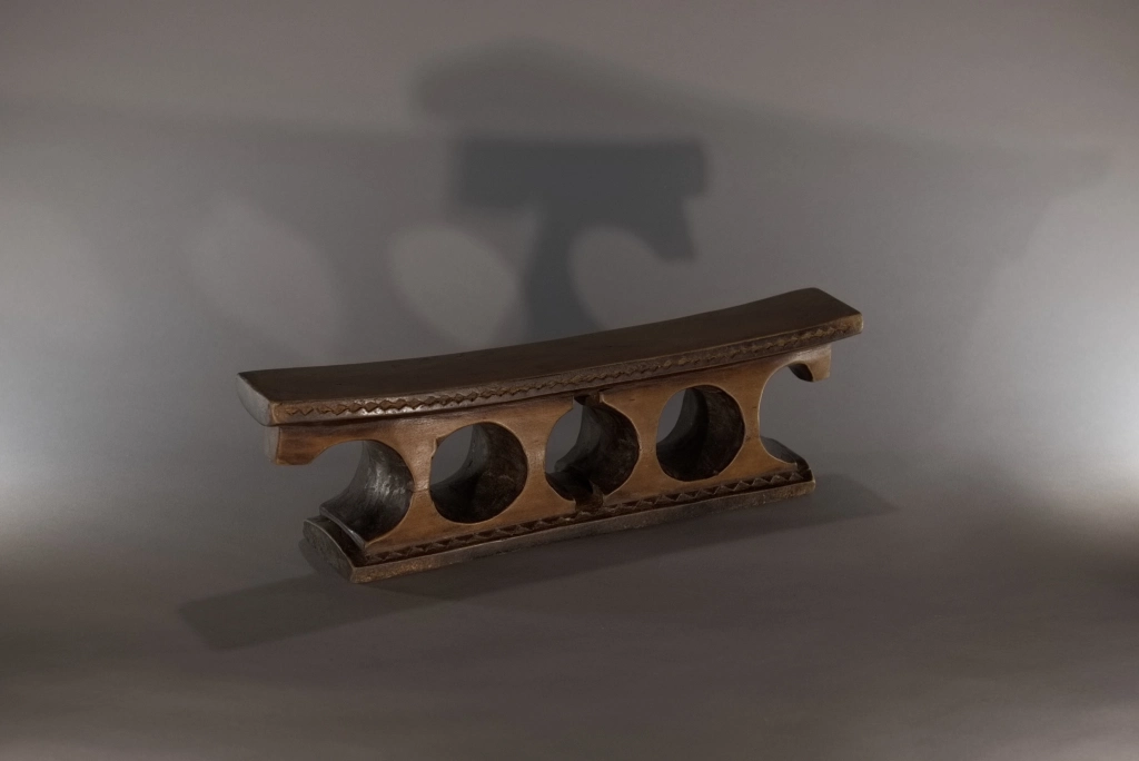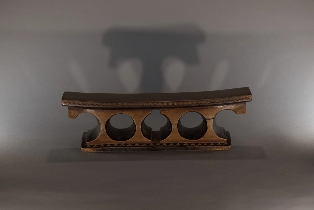 Une très belle pièce de bois blanc percée de trois fenêtres circulaires et de deux demi-cercles aux extrémités. Les épaisseurs du socle et de la plate-forme d’appui sont finement décorées et donnent de la personnalité à cette pièce qui est certes assez récente, mais offre un nouveau profil à toute collection.