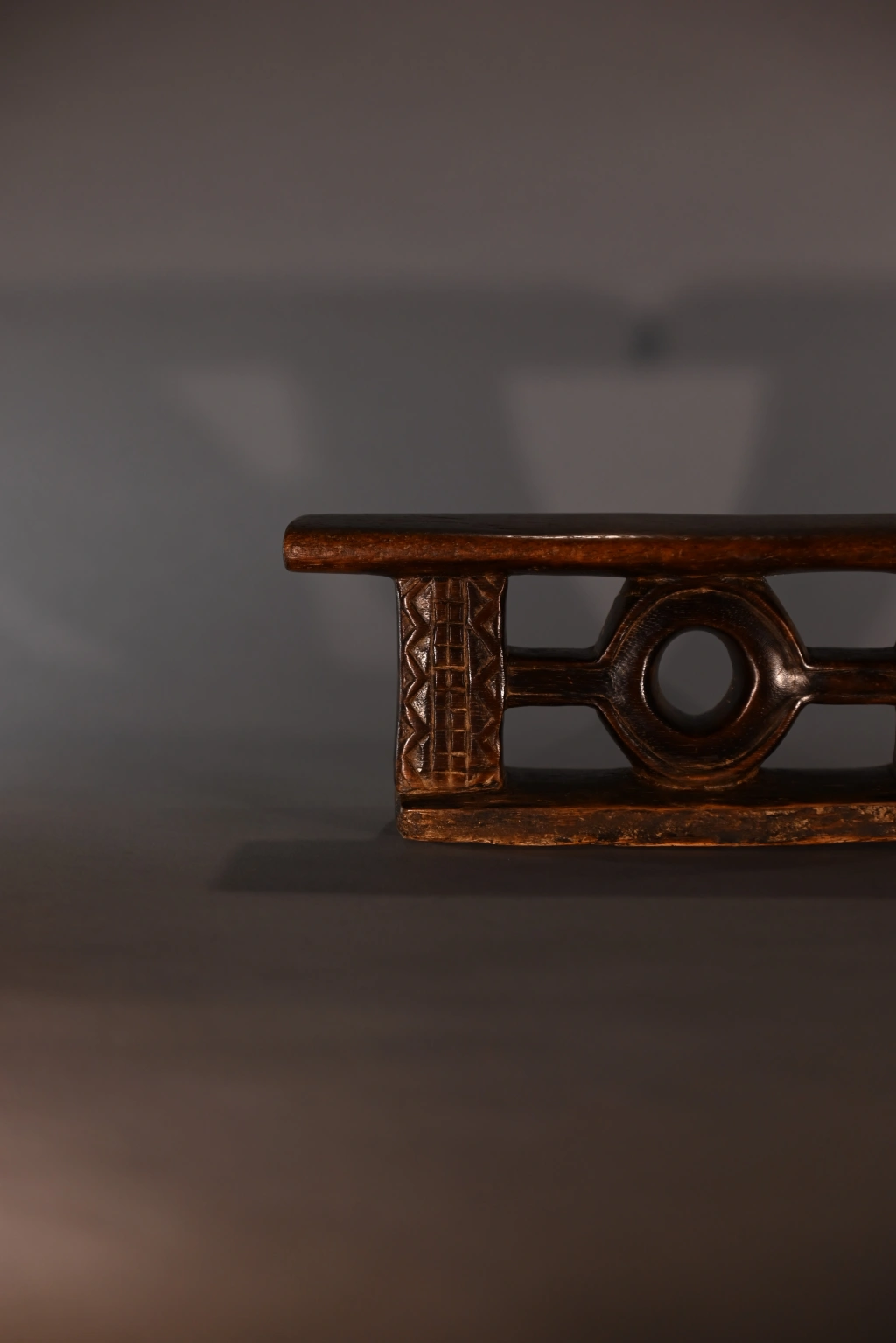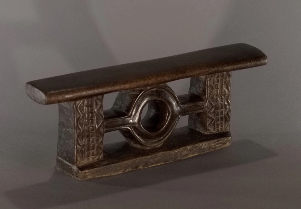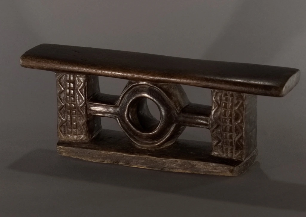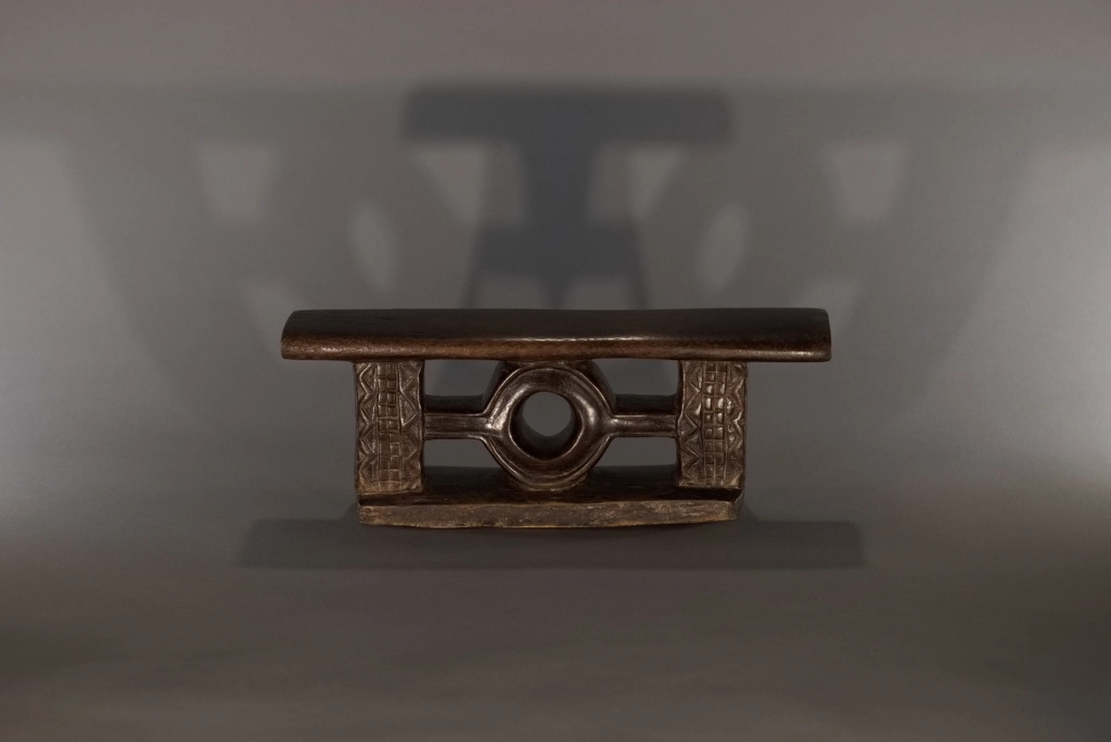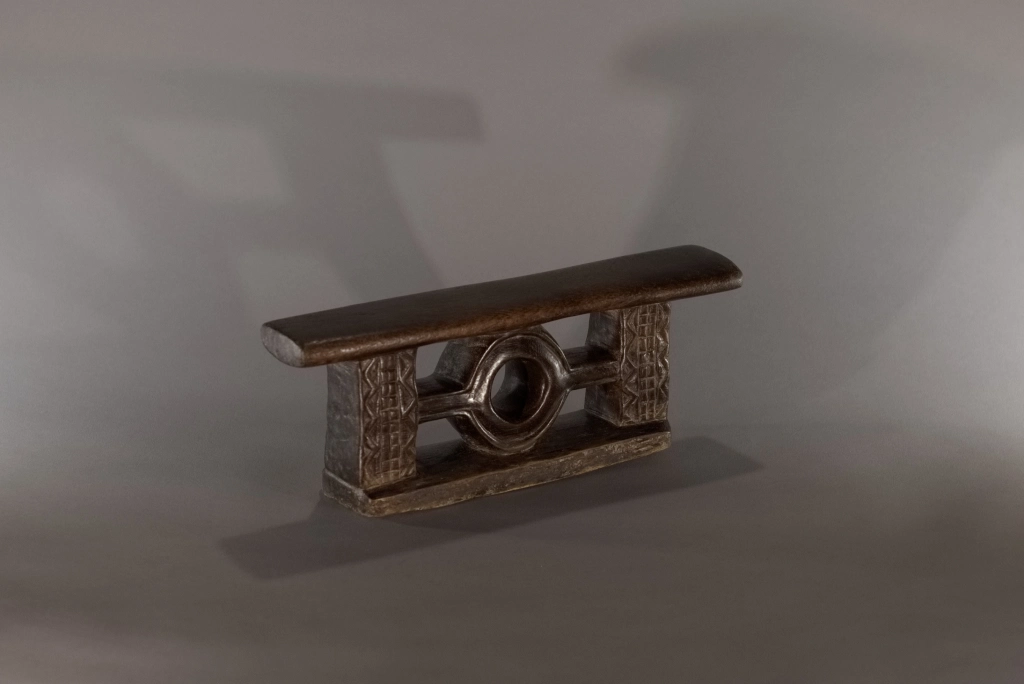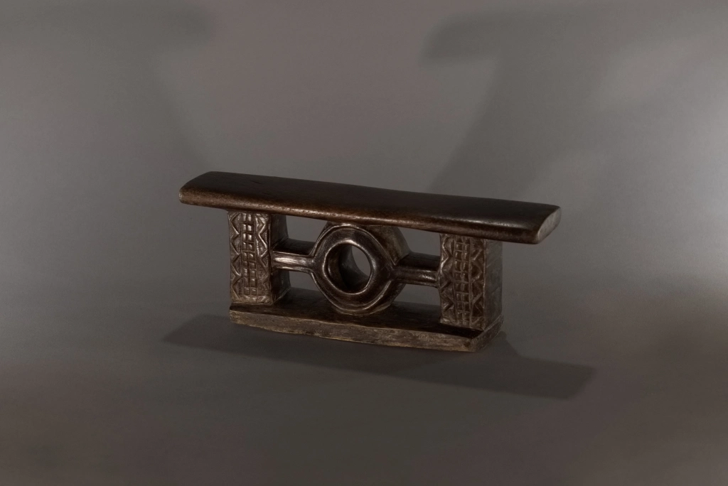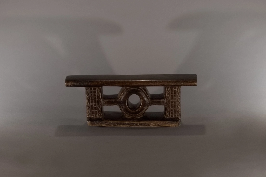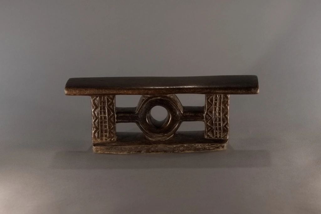 Un petit appui-tête miniature ce qui rend ses décorations, fines et esthétiques. Sa forme très originale et jamais rencontrée dans d’autres collections ou dans les pièces de musées, lui donne également un cachet particulier et en fait une pièce rare et attachante. Sa patine de plus d’un siècle rajoute, si besoin était, au charme de cette pièce.