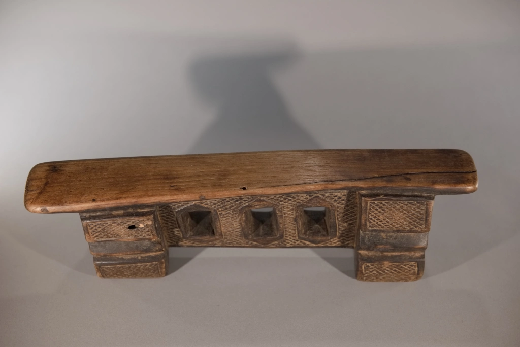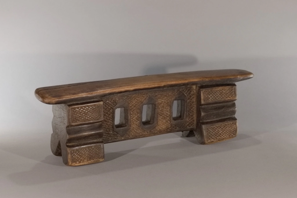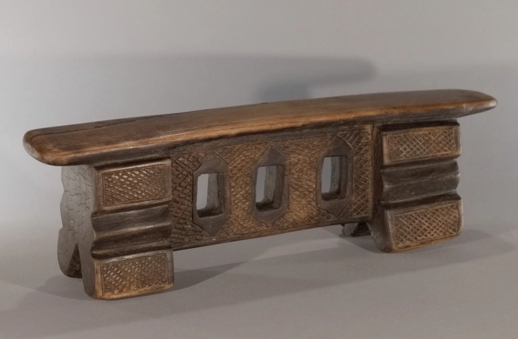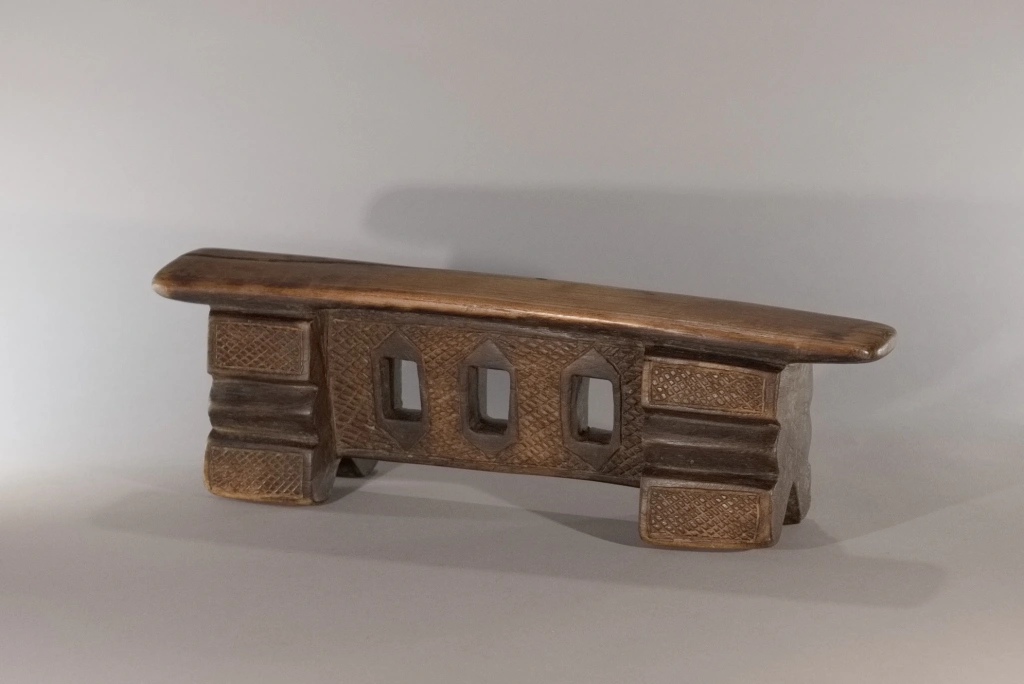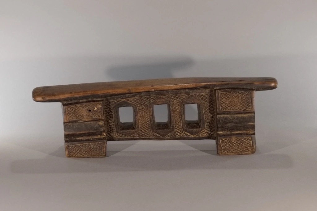 Une pièce, très originale comme décrite en Z057 et deuxième élément de la fratrie dont la troisième pièce est non identifié à ce jour. Ce second appui-tête a permis de recueillir quelques informations supplémentaires concernant les trois frères pour qui le père (à priori Mandela Khumalo) a sculpté ces trois appuis-tête: les frères ayant décidé de bâtir une maison commune pour leurs trois familles, le père à symboliser cette décision par ces appuis-tête en forme de maison avec une fenêtre par enfant. La troisième pièce est probablement de dimension (48 × 14 cm) la rendant la plus petite, avec la plus grande Z057 (56 × 16 cm) et la plus petite Z 266 (43 × 12 cm). Pas de couleur + nature !!!