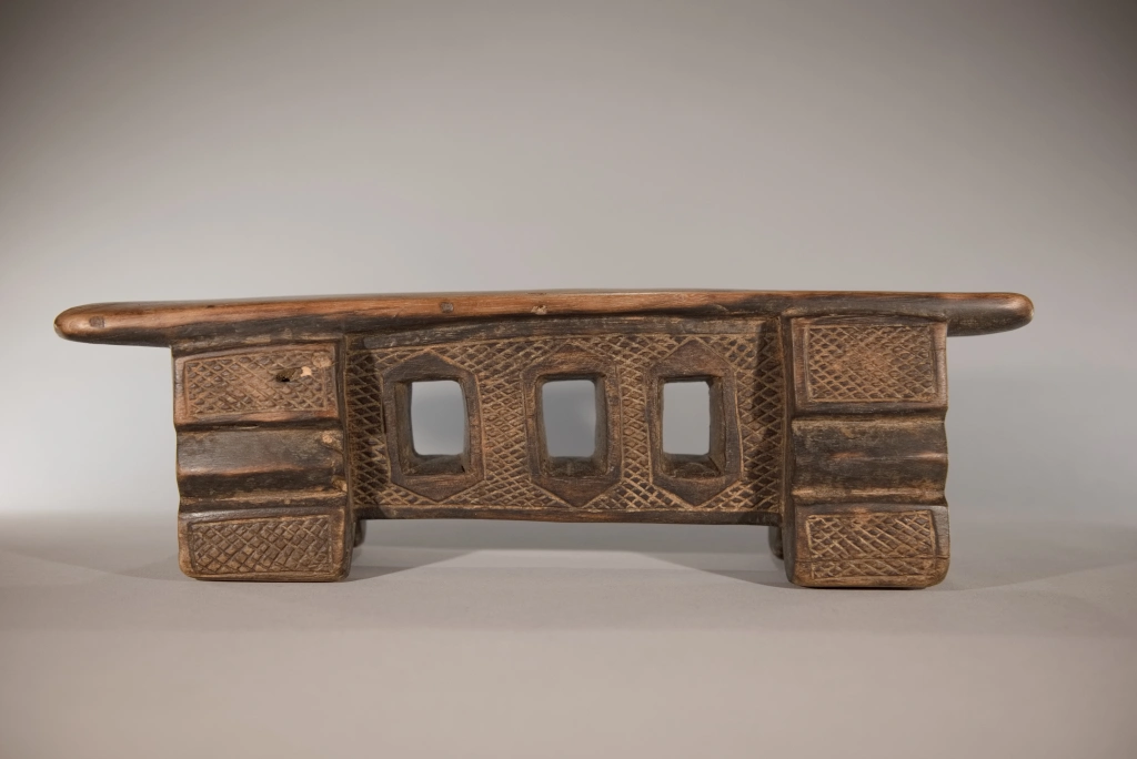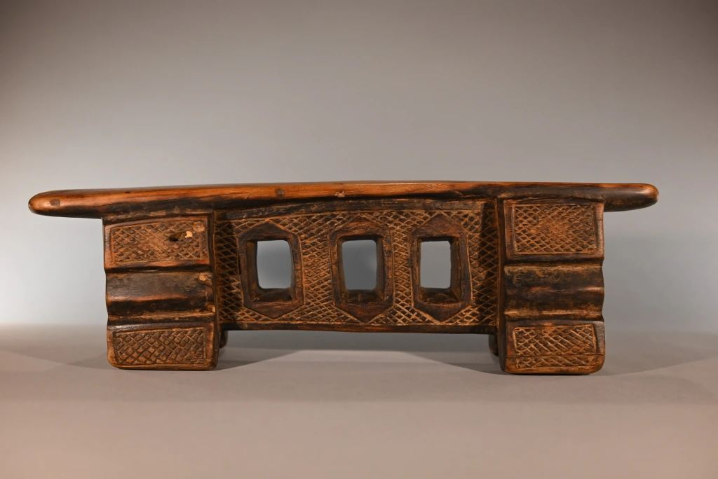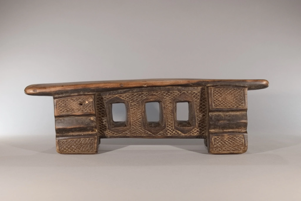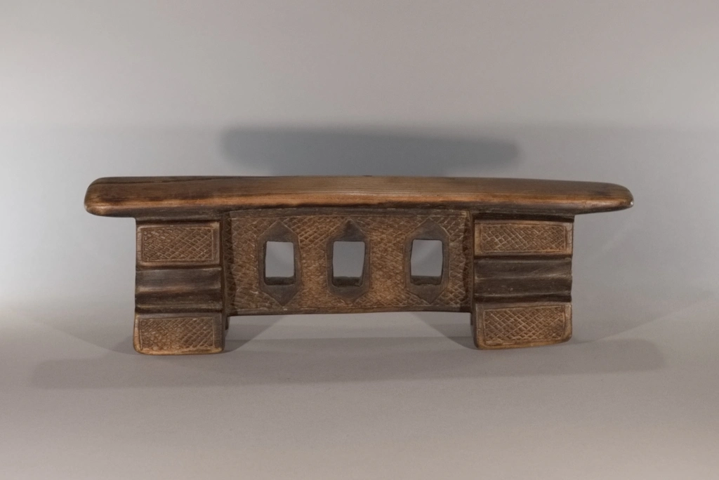 Une pièce, très originale comme décrite en Z057 et deuxième élément de la fratrie dont la troisième pièce est non identifié à ce jour. Ce second appui-tête a permis de recueillir quelques informations supplémentaires concernant les trois frères pour qui le père (à priori Mandela Khumalo) a sculpté ces trois appuis-tête: les frères ayant décidé de bâtir une maison commune pour leurs trois familles, le père à symboliser cette décision par ces appuis-tête en forme de maison avec une fenêtre par enfant. La troisième pièce est probablement de dimension (48 × 14 cm) la rendant la plus petite, avec la plus grande Z057 (56 × 16 cm) et la plus petite Z 266 (43 × 12 cm). Pas de couleur + nature !!!