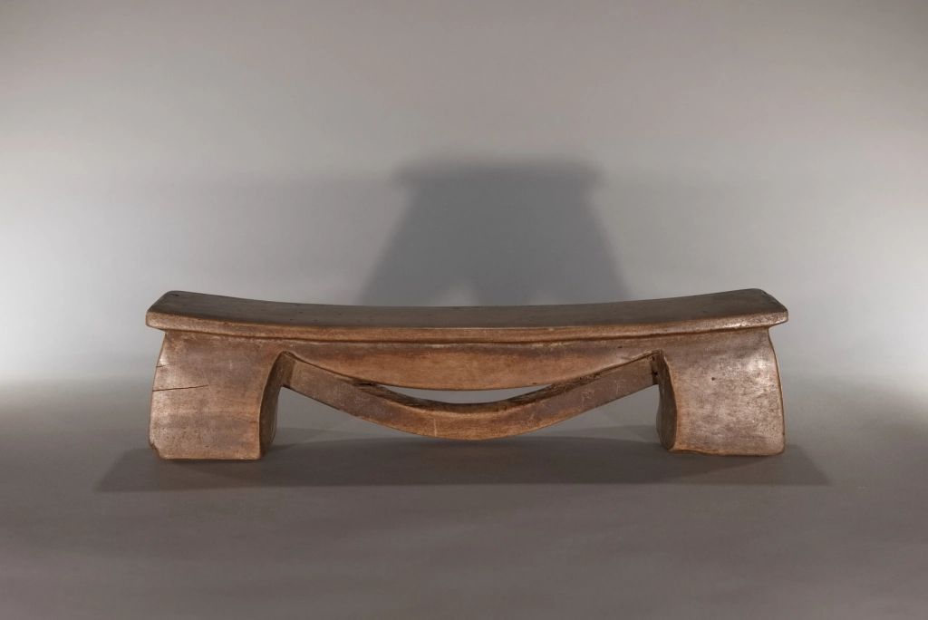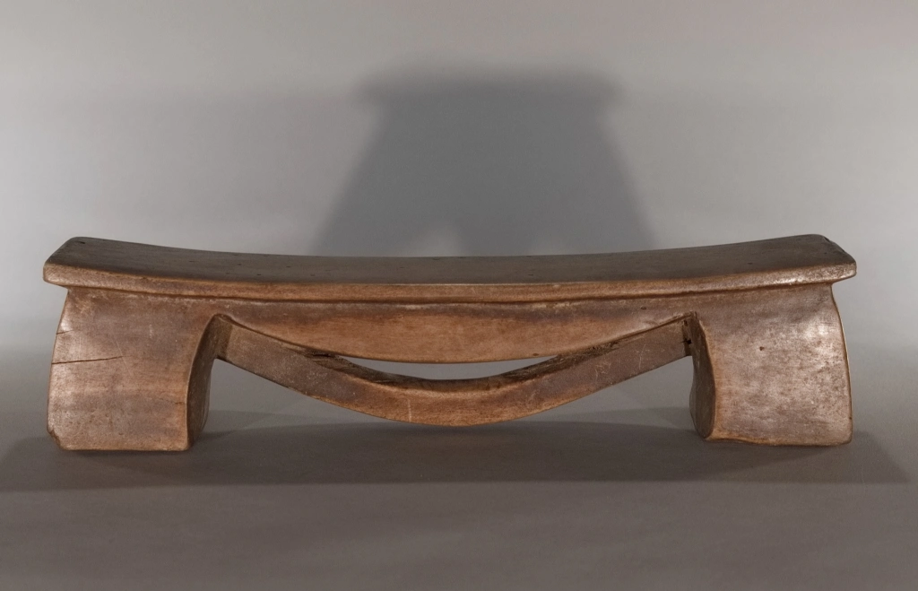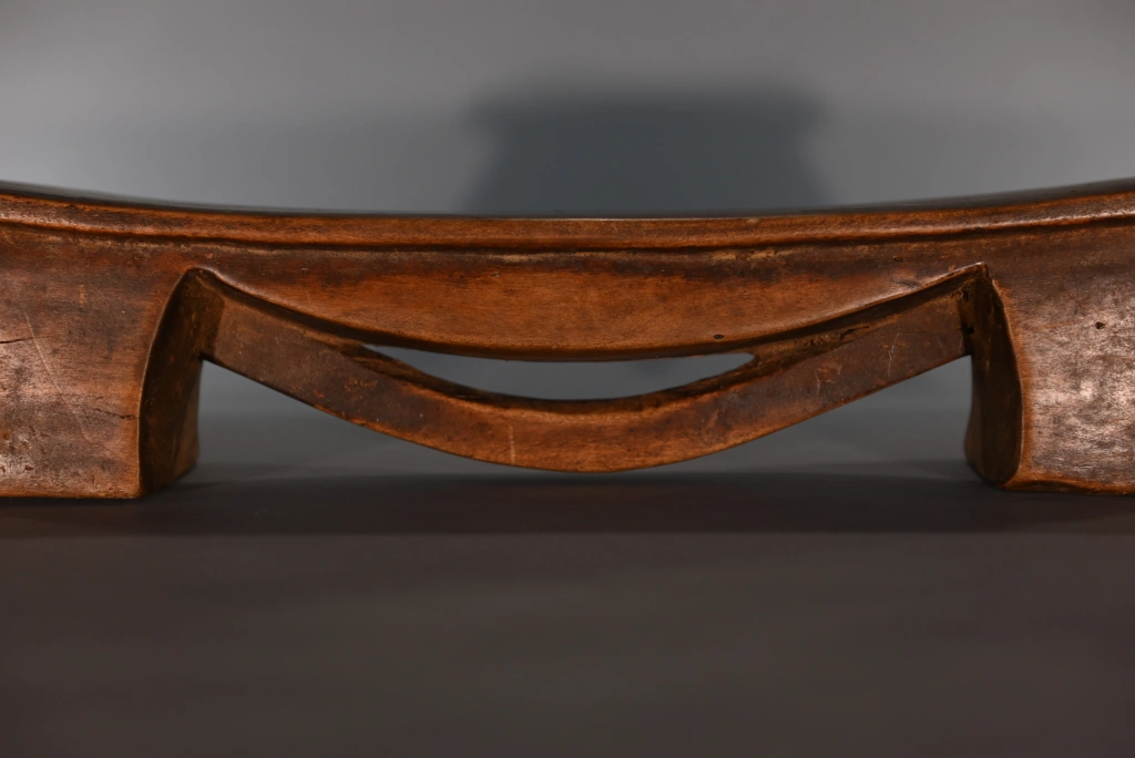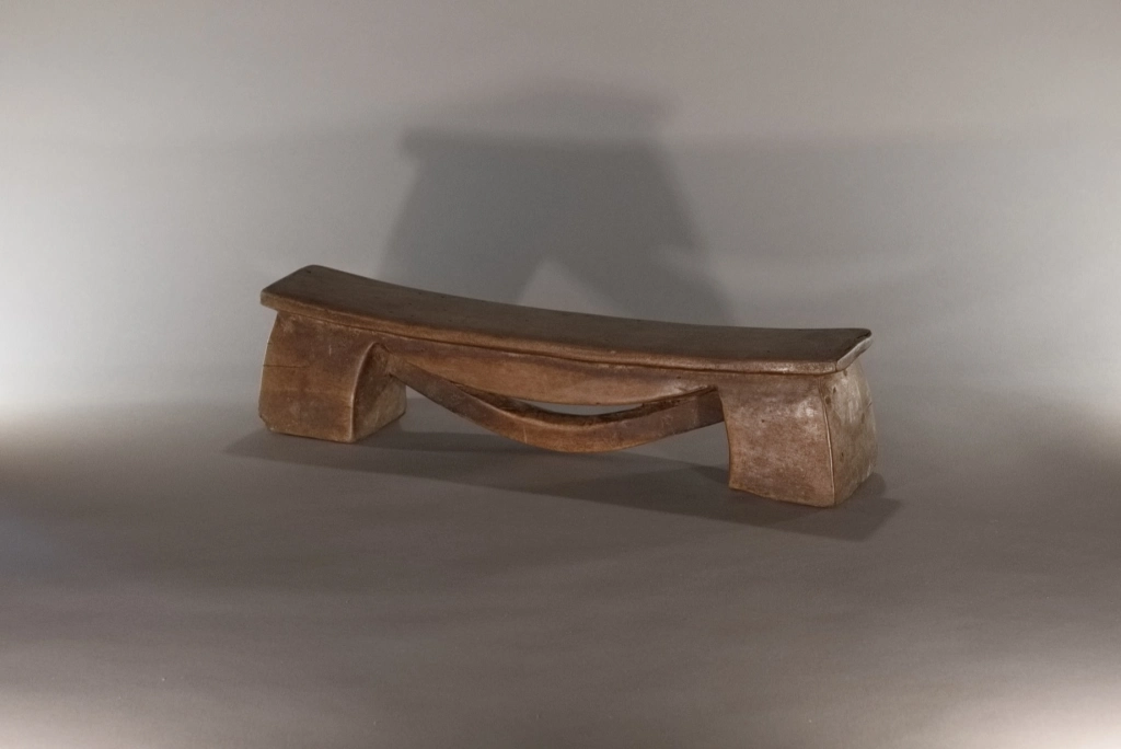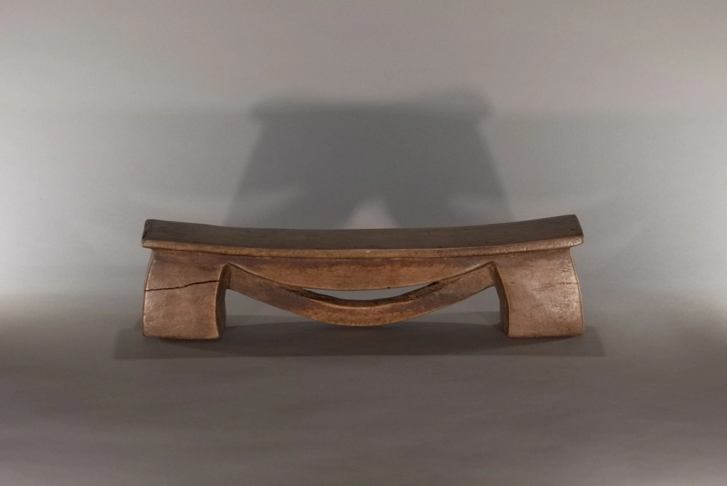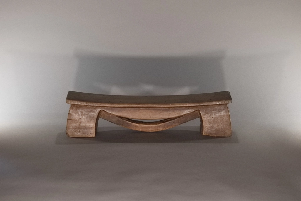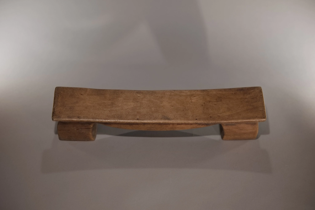 Un petit appui-tête de moins de 10 cm de hauteur. Simple, mais original par cet arc de cercle en forme de liane suspendue à la plateforme, qui crée 3 courbures différentes, empilées les unes sur les autres de façon très esthétique. La patine miel de ces pièces rajoute encore à la douceur des formes et appelle au sommeil.