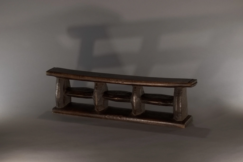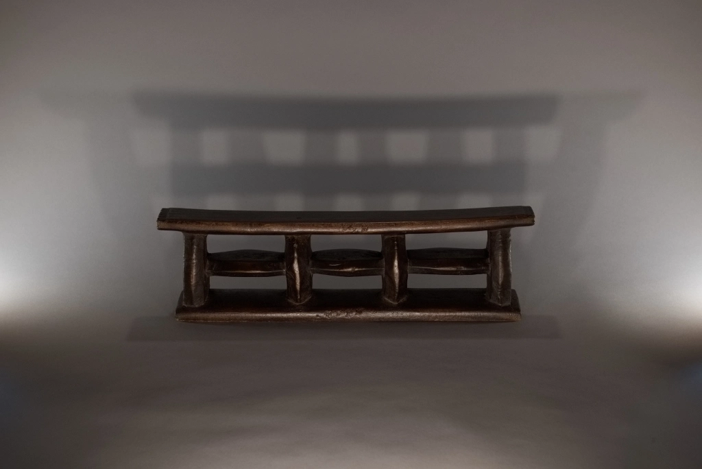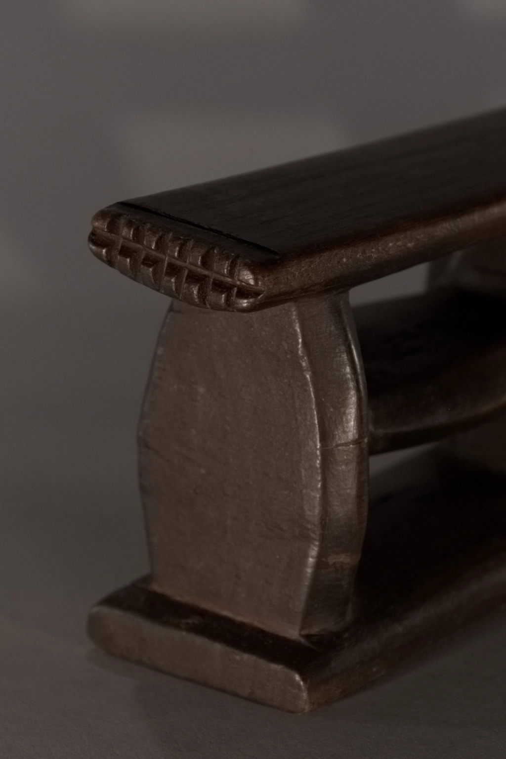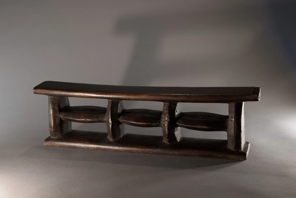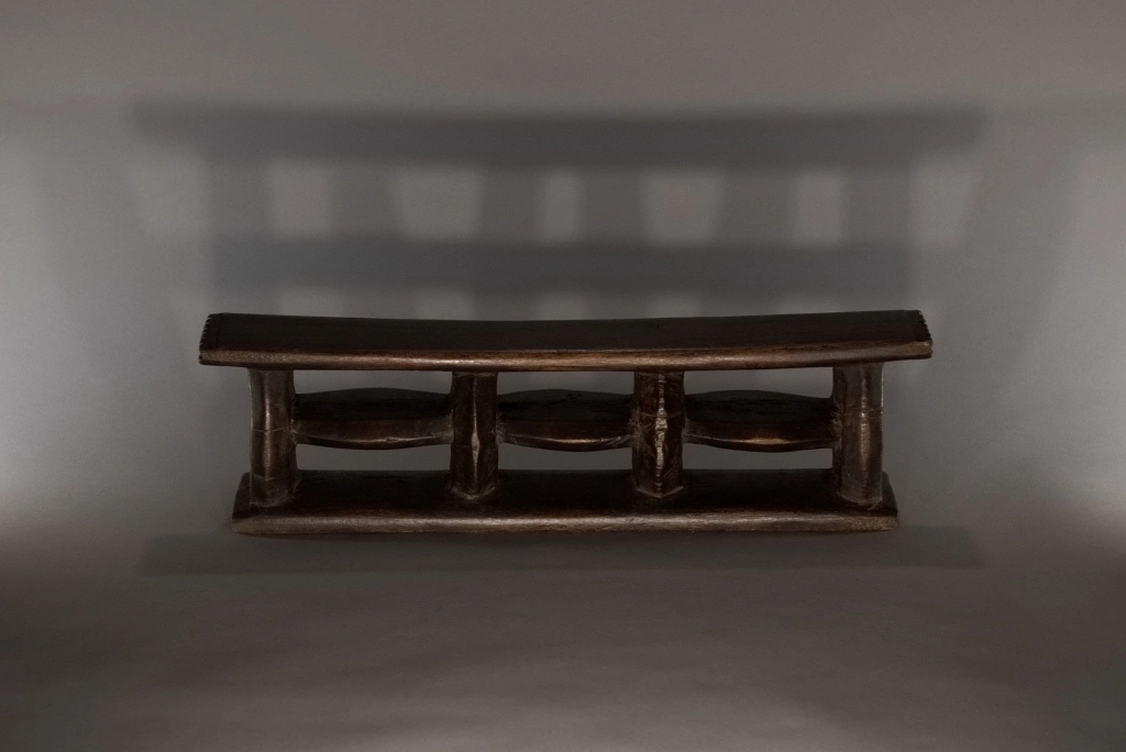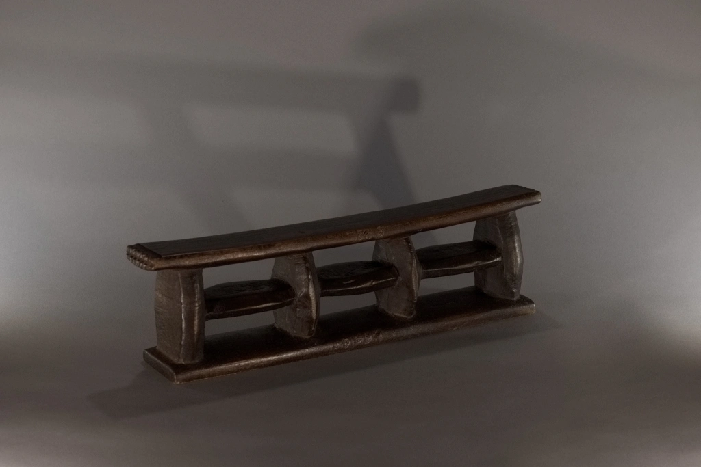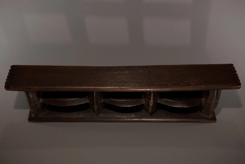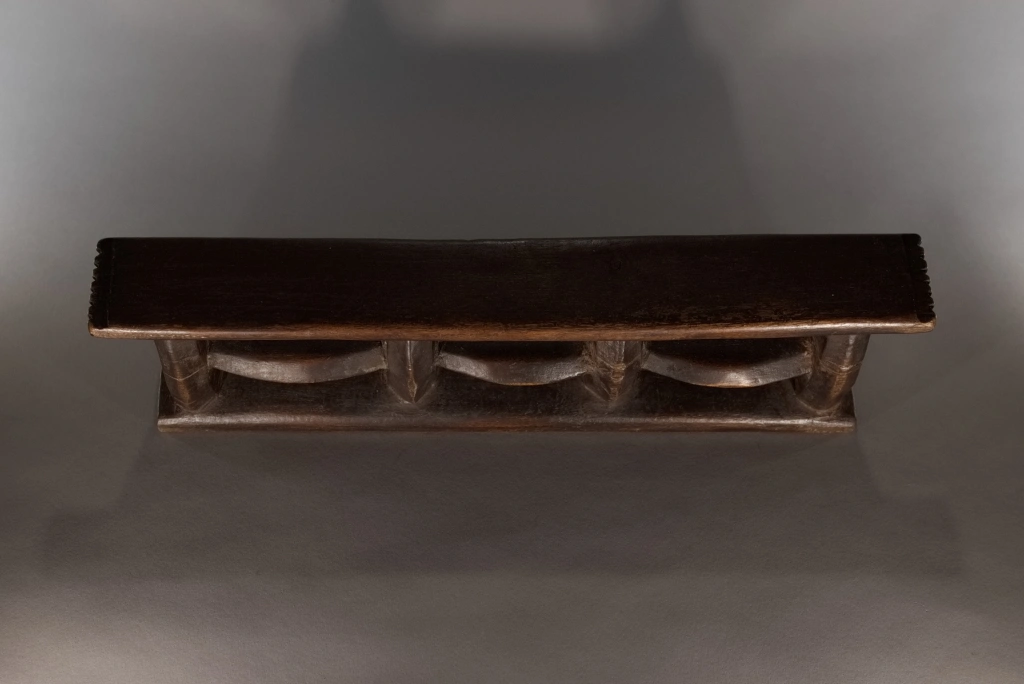 Un appui-tête de belle architecture en forme de quadrillage organisé autour de 6 rectangles de vide entourés par des montants verticaux et horizontaux oblongs. Les surfaces non décorées apportent sobriété et pureté. Une forme originale et rare.