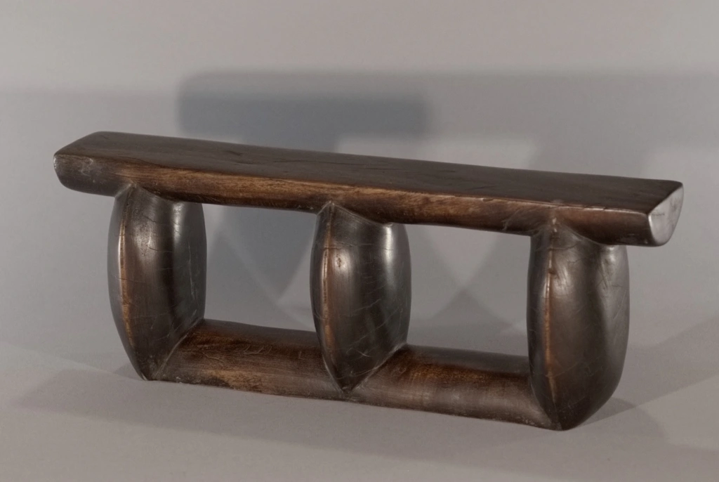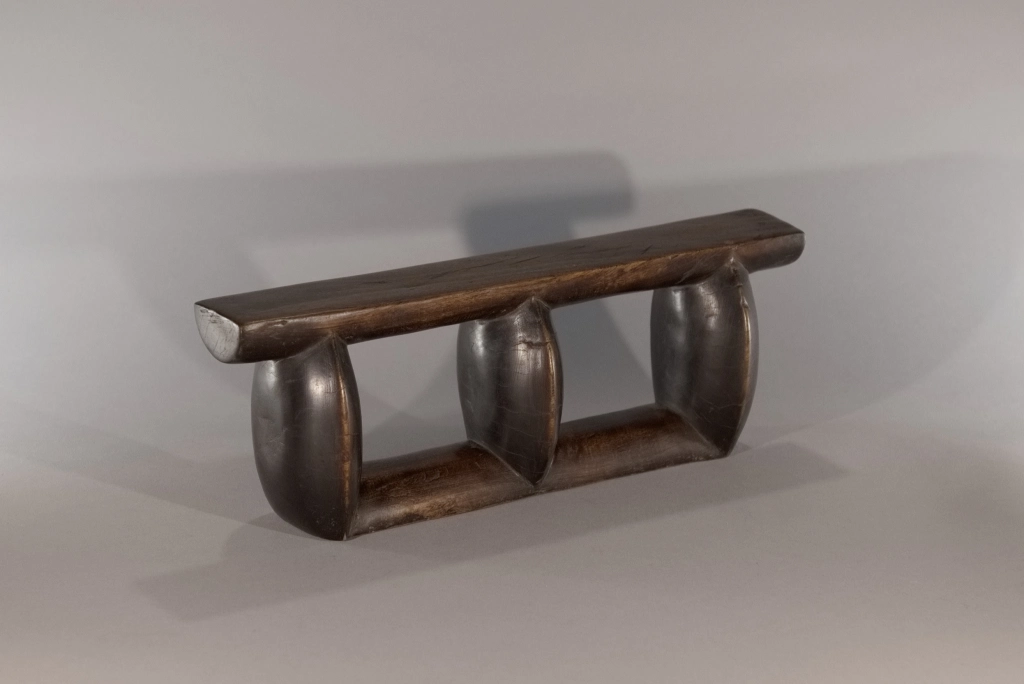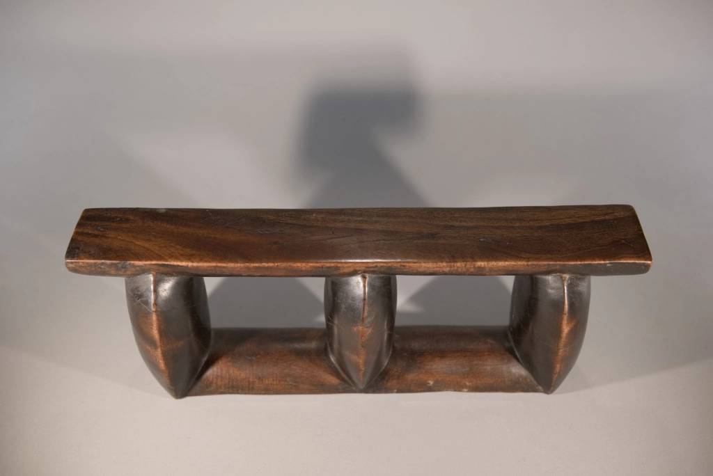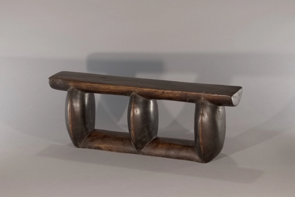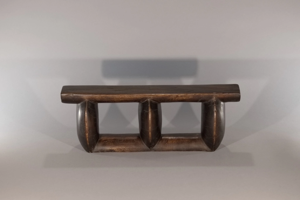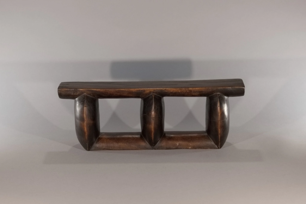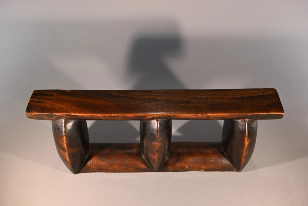 Un appui-tête composé de trois colonnes oblongues, configuration plutôt rare, ce profil comportant généralement cinq ou six colonnes comme le Z163. Sa patine marbrée et la légère usure des arrêtes et des colonnes lui donnent un certain cachet qui apporte à la sobriété de ses courbes.