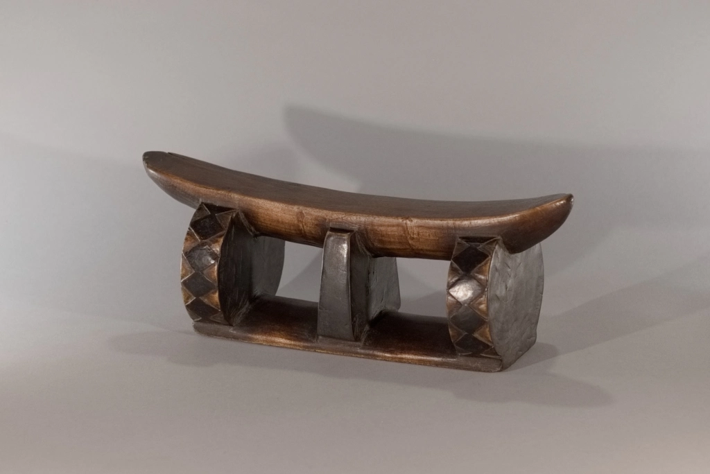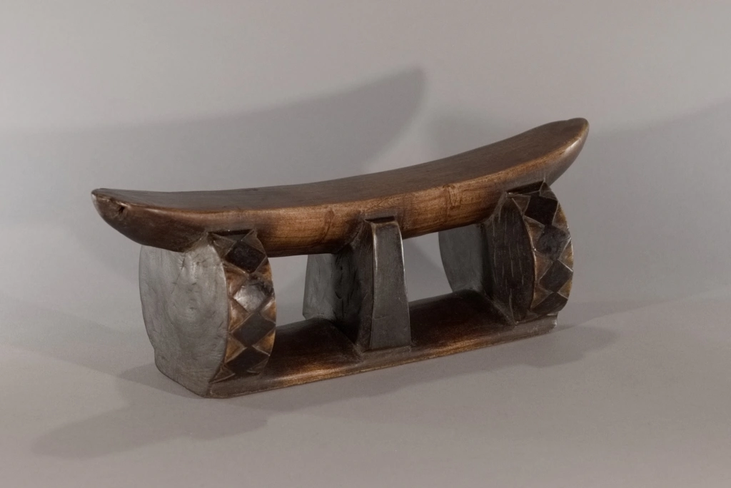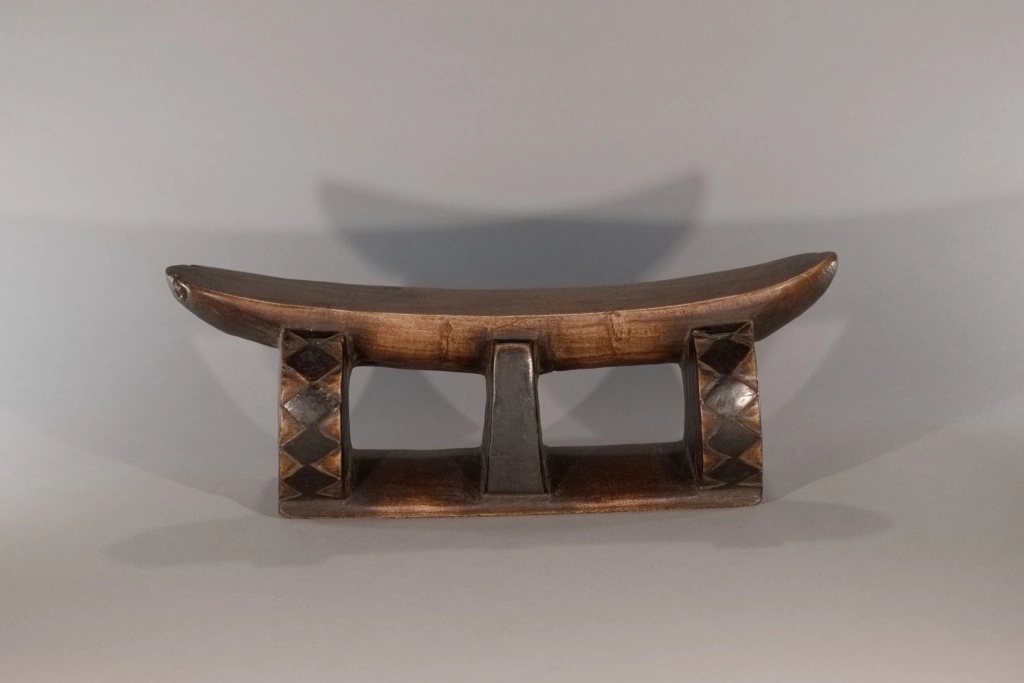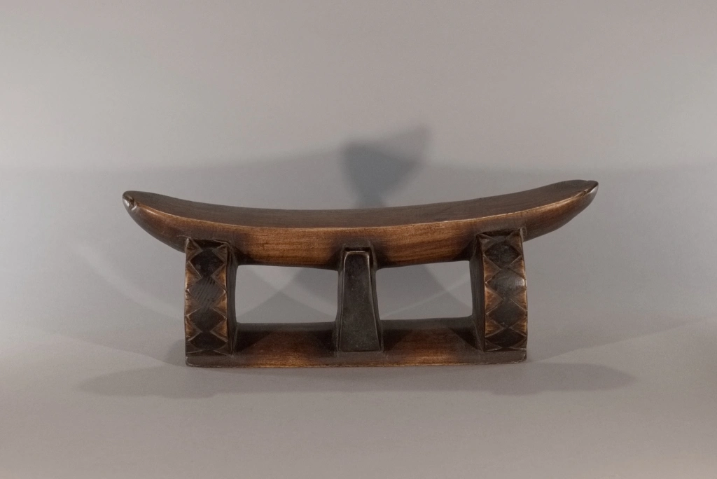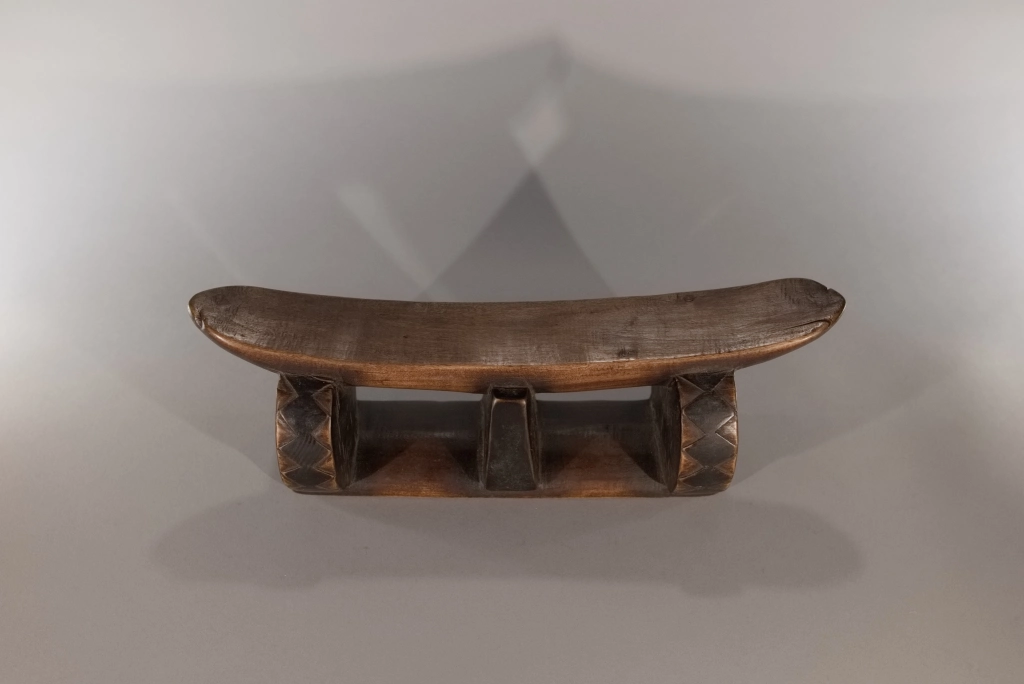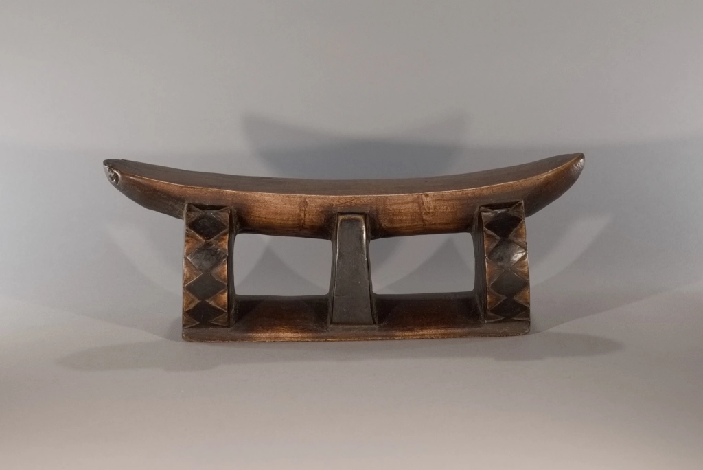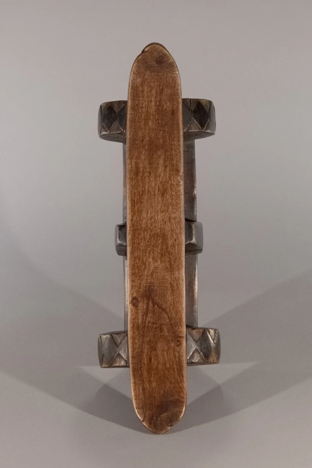 Un profil inhabituel avec une plateforme très incurvée reposant sur une colonne centrale, entourée de deux rondelles transversales. Les losanges, sur l’épaisseur de ces rondelles fortement noircies par pyrogravure, tout comme la colonne centrale, contrastent avec la patine rousse du socle et de la plateforme. Les tranches noircies donnent un ressenti de profondeur. L’alternance de courbes et de lignes droites est une particularité qui attire l’attention.