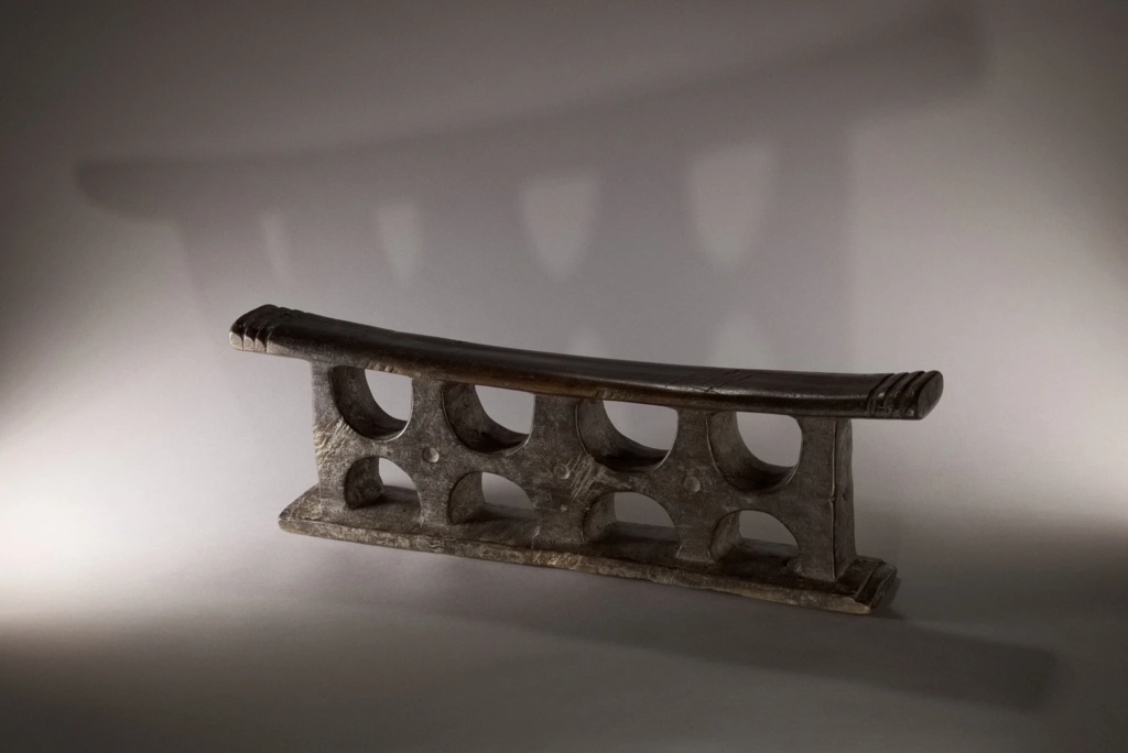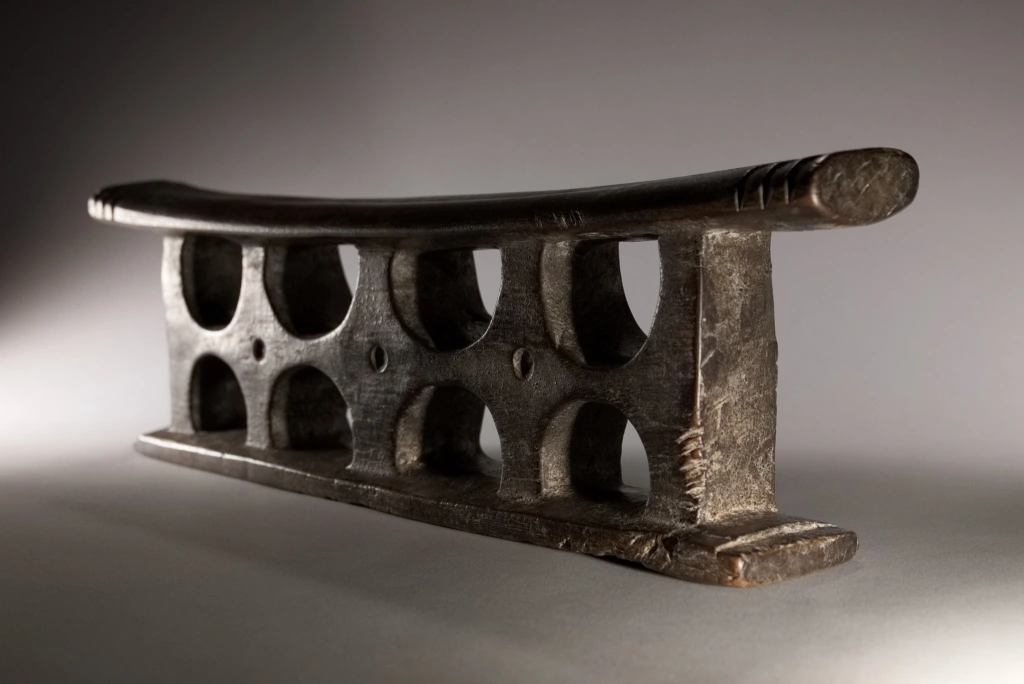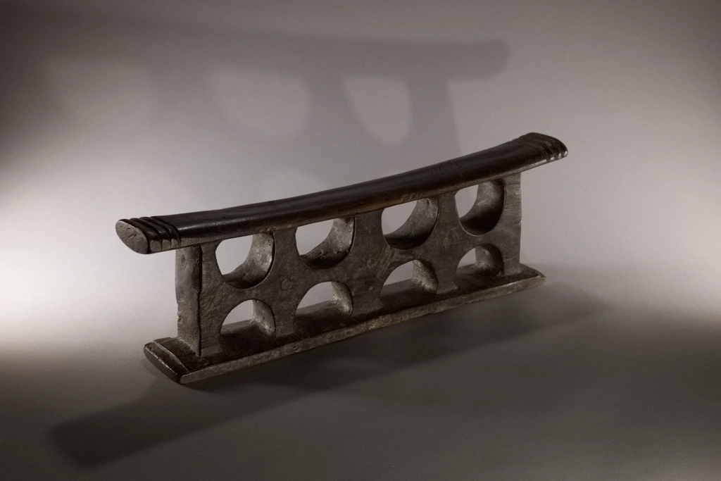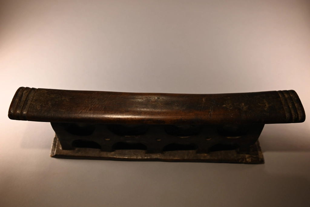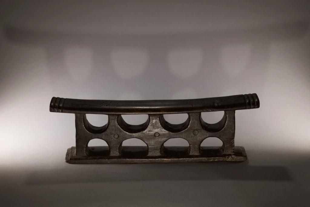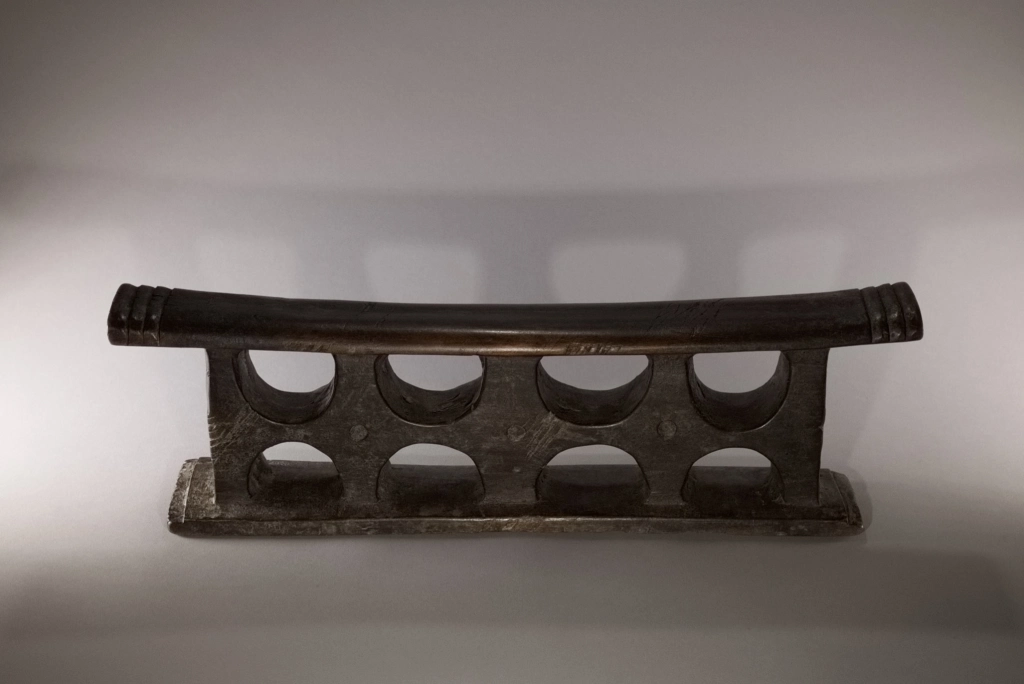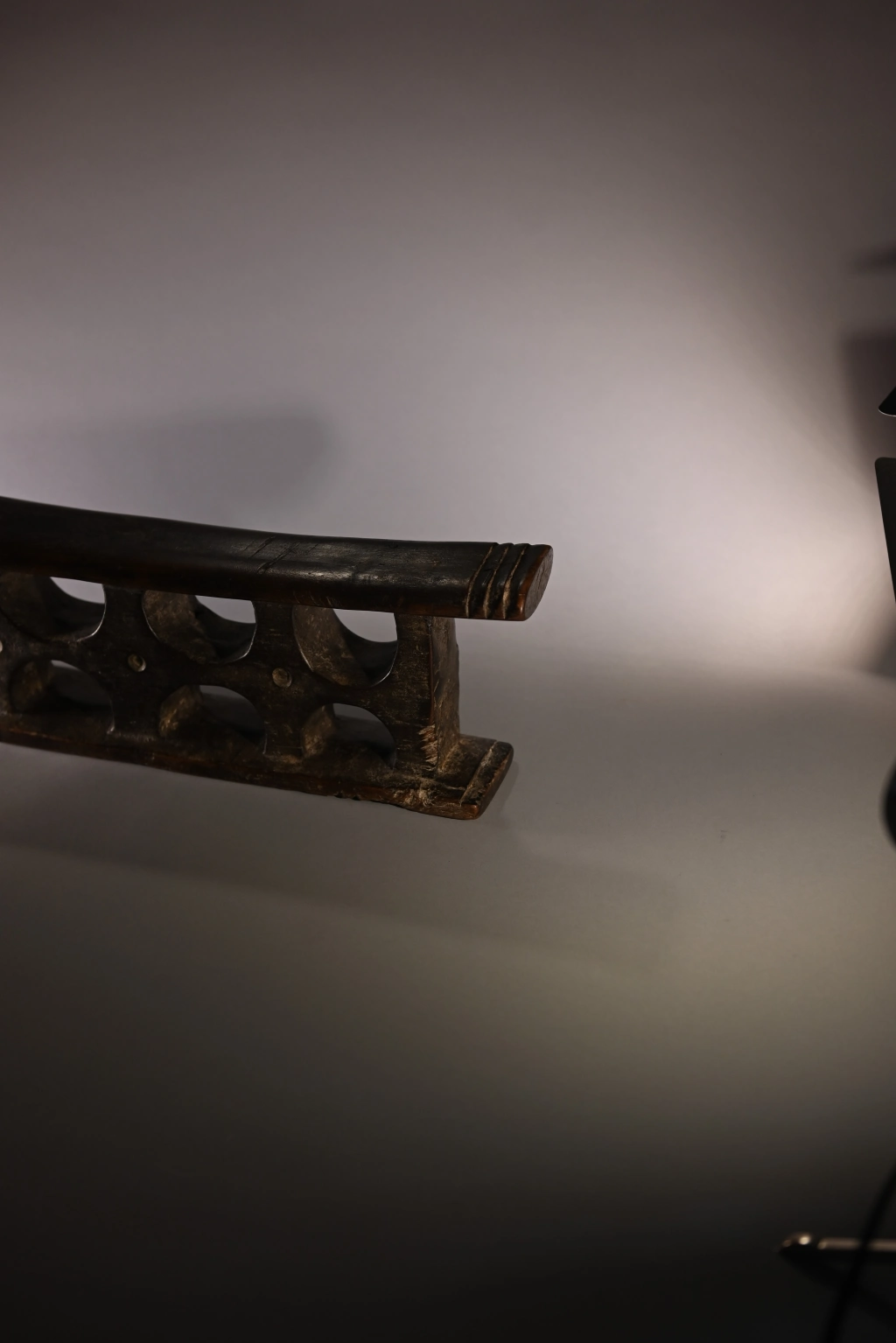 Tout aussi originale, cette sculpture peut être vue comme le négatif de la précédente (Z 282). Composée de deux rangées de quatre demi-cercles creusés dans le bloc de bois, elle a aussi la particularité de présenter trois poinçons au centre de chaque intersection. Une belle patine sombre orne cet appui-tête, lustré par des décennies d’utilisation.