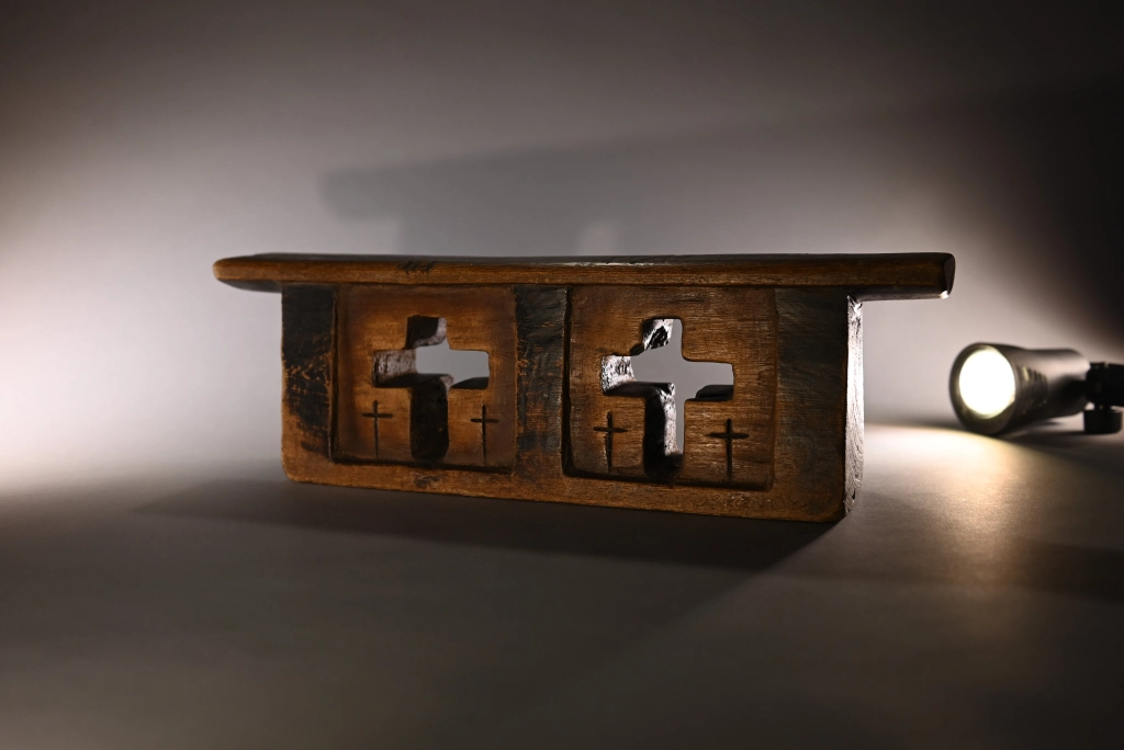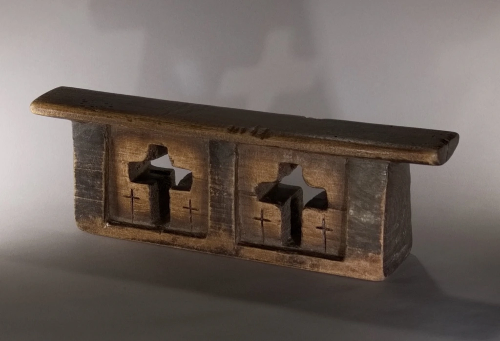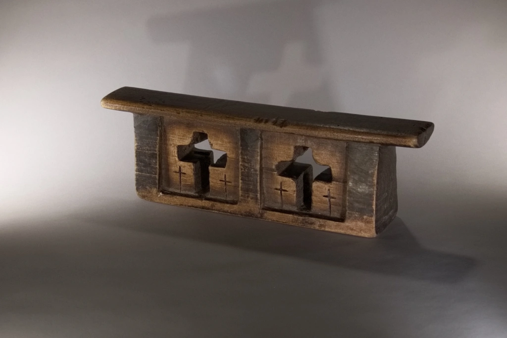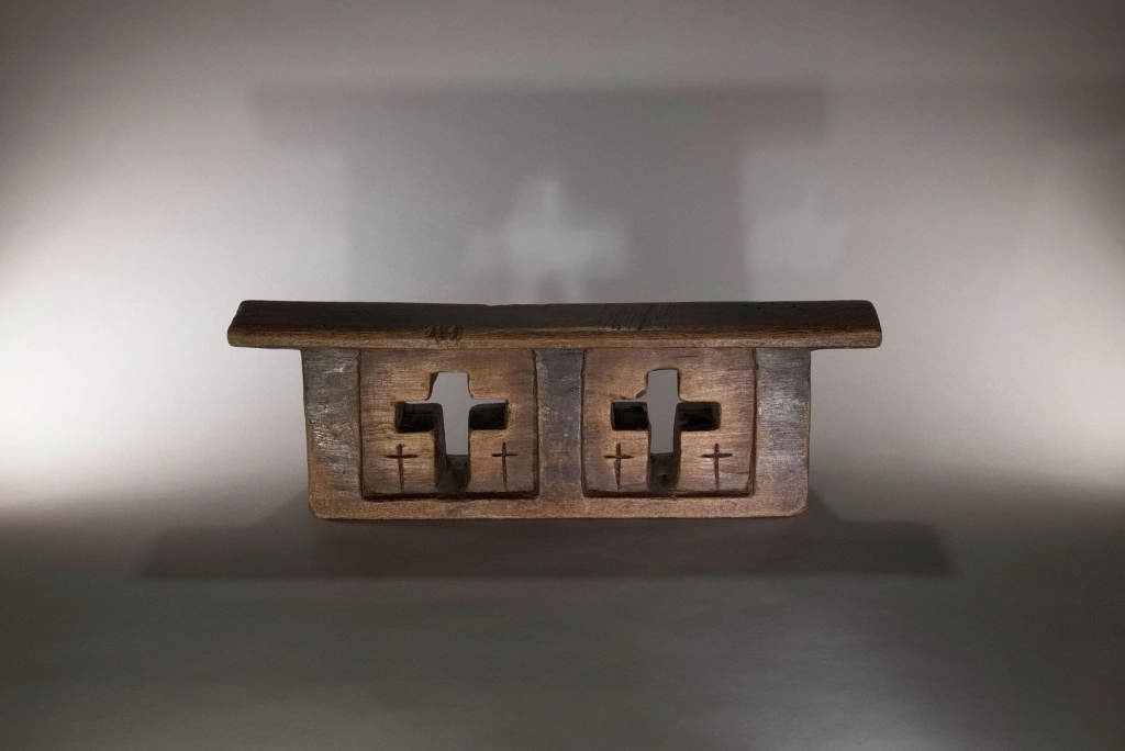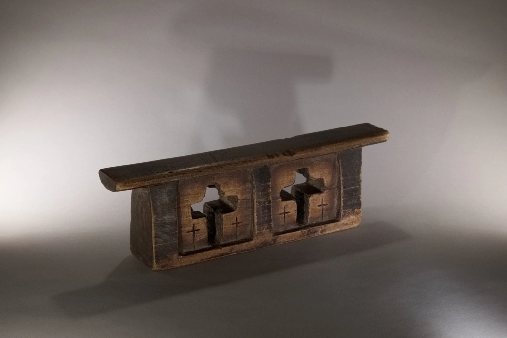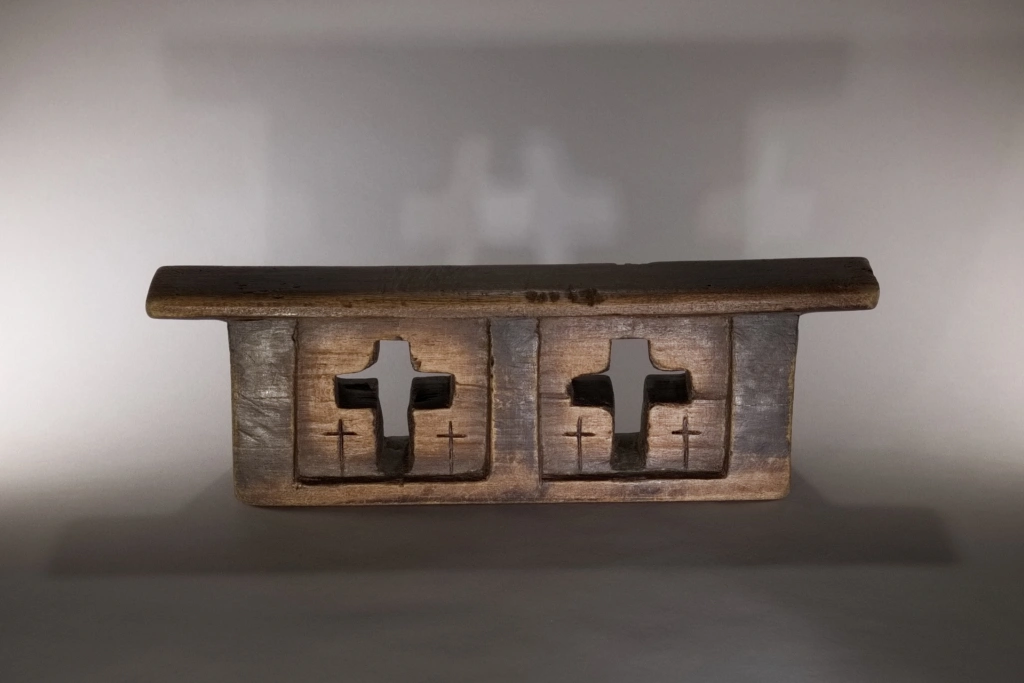Coup de cœur pour cet appui-tête formé d’un bloc orné de deux croix principales entourées elles-mêmes de deux petites croix incisées, similaires à celles gravées au cœur de la pièce, apparaissant en excroissances sombres. Des zones en retrait, plus claires et dégradées, génèrent des effets de volume et une certaine douceur, qui captivaient autrefois le dormeur et continuent d’émerveiller le collectionneur averti aujourd’hui.