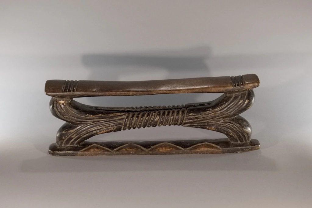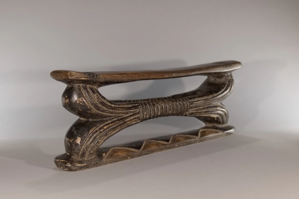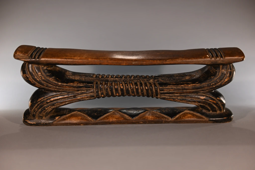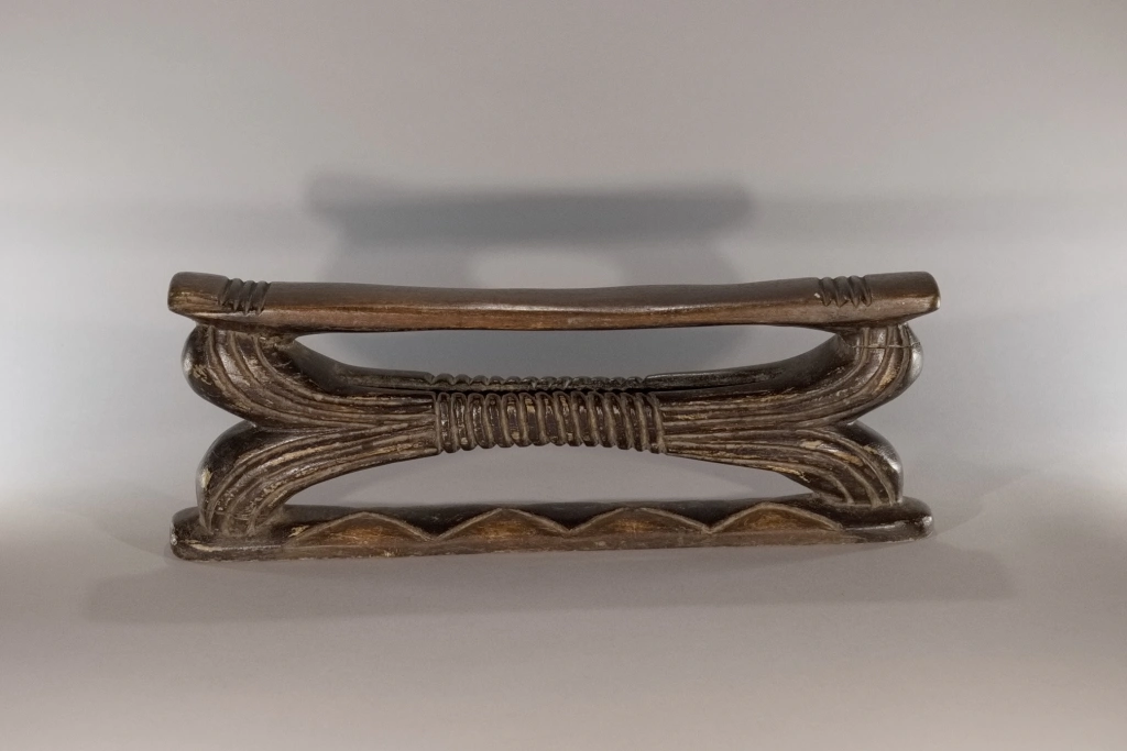 Un appui-tête extrêmement original, constitué de deux torsades entrecroisées attachées en leur centre. Cette caractéristique est-elle liée au fait qu’il provient du village Ndebelé ? Faisant partie des Ngunis, résidant principalement dans la province de Limpopo, les Ndebelé sont réputés pour leur sens esthétique distinctif, admiré mondialement. Leur renommée découle des façades de leurs maisons, vivement colorées et décorées de motifs géométriques réalisés par les femmes Ndebelé, ces dernières portant souvent des vêtements ornés de perles. Il n’est donc pas surprenant que cet appui-tête soit à la fois esthétique et original.
