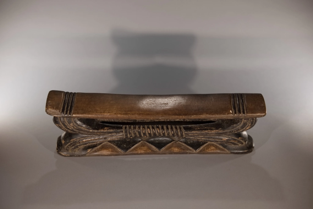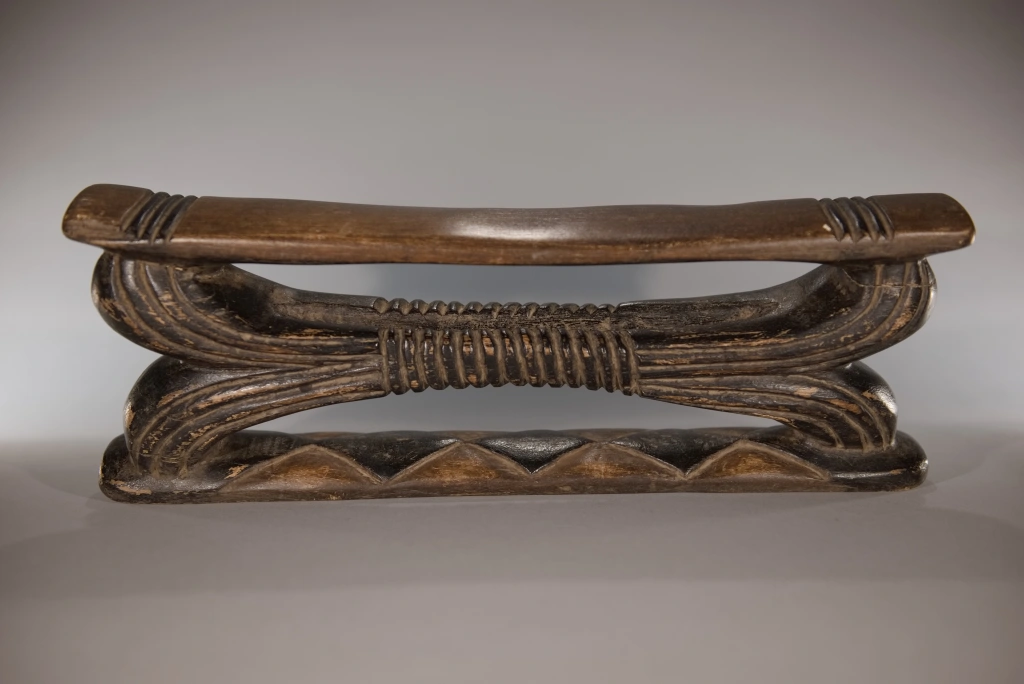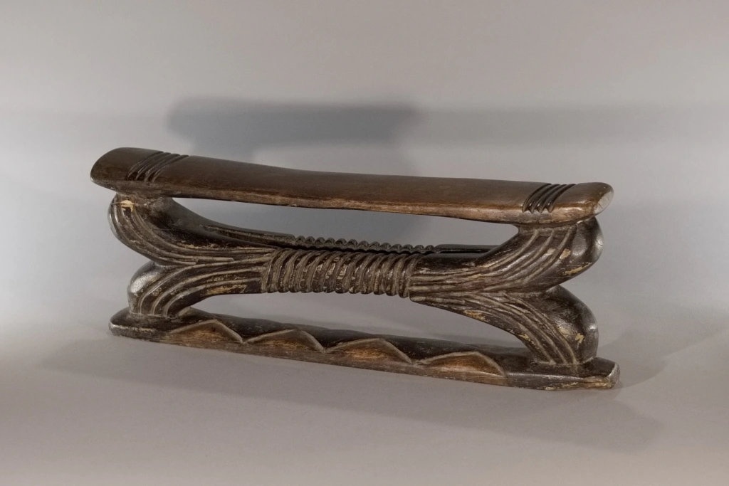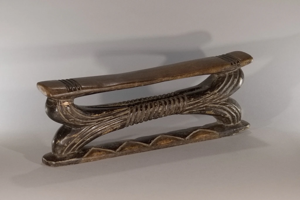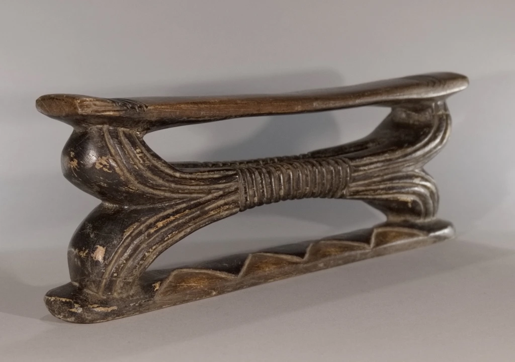 Un appui-tête extrêmement original, constitué de deux torsades entrecroisées attachées en leur centre. Cette caractéristique est-elle liée au fait qu’il provient du village Ndebelé ? Faisant partie des Ngunis, résidant principalement dans la province de Limpopo, les Ndebelé sont réputés pour leur sens esthétique distinctif, admiré mondialement. Leur renommée découle des façades de leurs maisons, vivement colorées et décorées de motifs géométriques réalisés par les femmes Ndebelé, ces dernières portant souvent des vêtements ornés de perles. Il n’est donc pas surprenant que cet appui-tête soit à la fois esthétique et original.