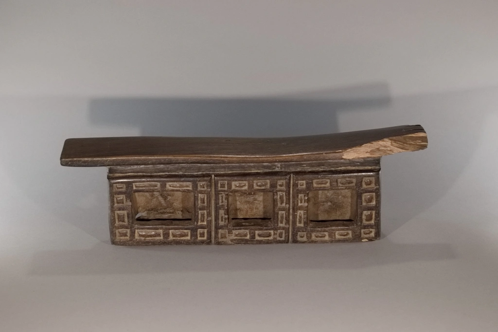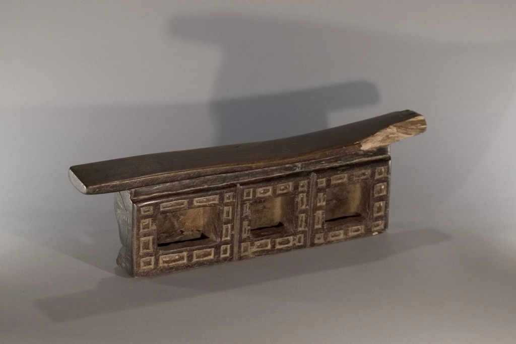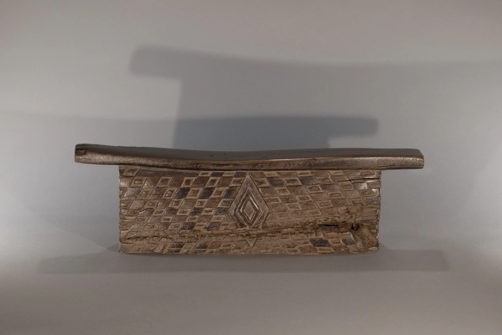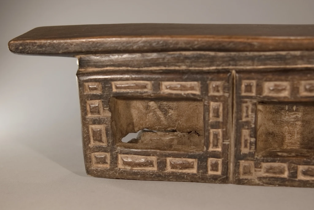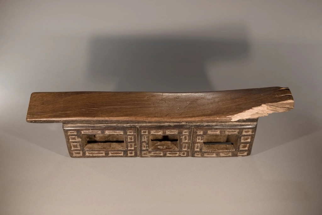 Cette œuvre, tout comme Z289, est originaire du village Ndebelé de Mabhoho. Bien qu’elle soit moins originale que la précédente, elle présente également l’attrait pour les motifs géométriques distinctifs des Ndebelés. Ces motifs se déploient autour des trois cavités à l’avant, ainsi que sur l’intégralité de la face arrière, cette dernière étant ornée d’un damier en deux couleurs. Datant du XIXe siècle, cette pièce montre des signes évidents d’utilisation intense, comme en témoignent la fissure transversale à l’arrière et l’usure asymétrique observée sur la surface de repos. Un grand vécu se dégage de cette pièce