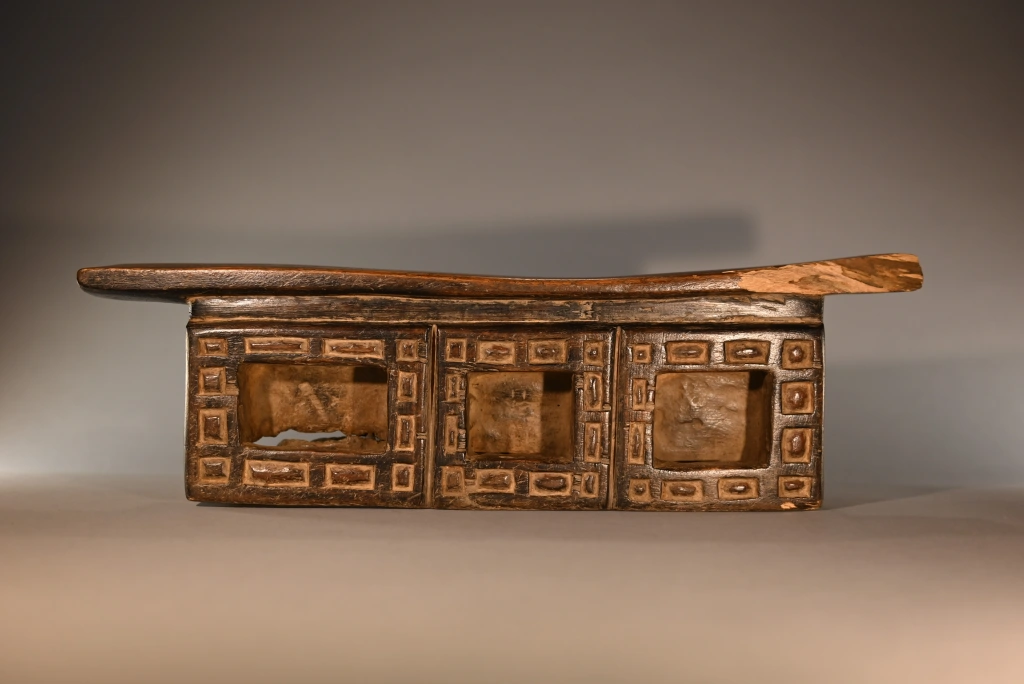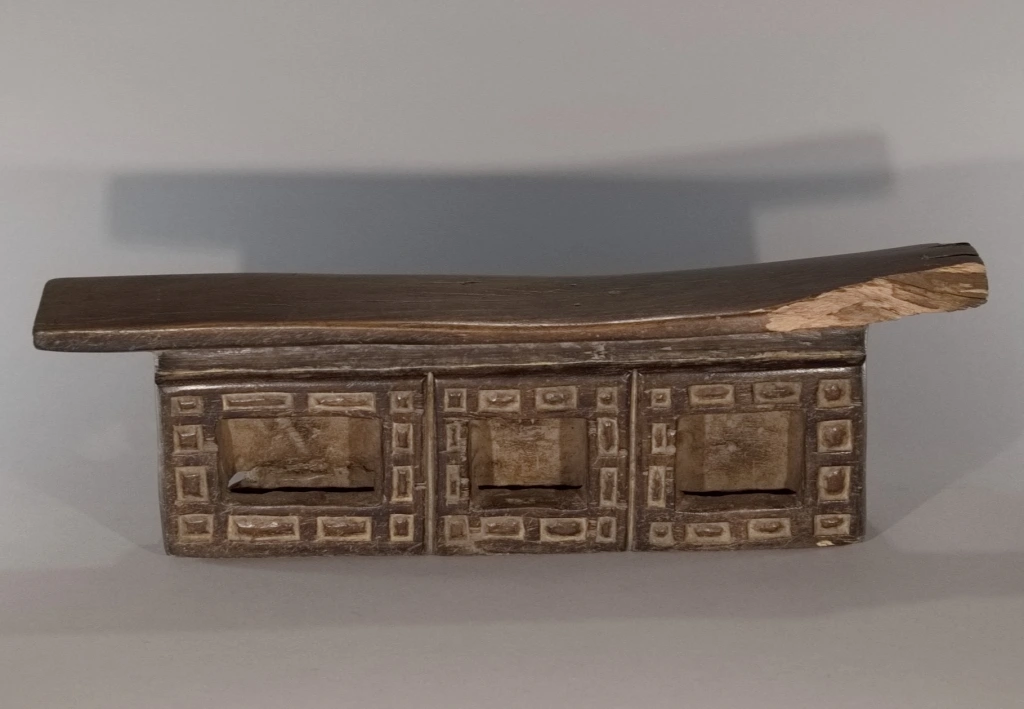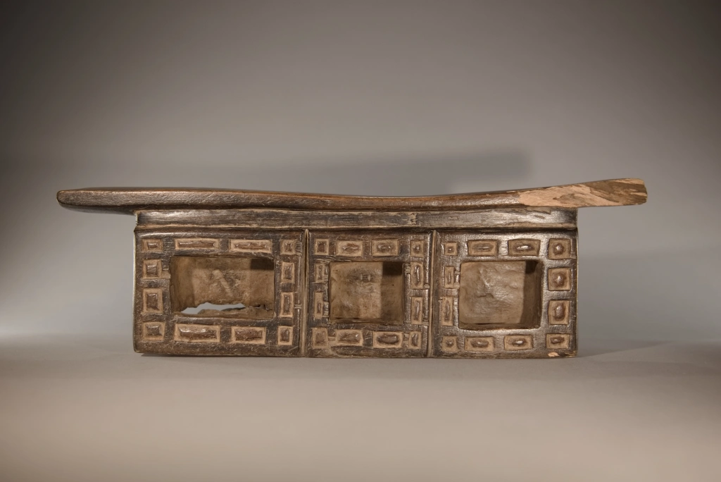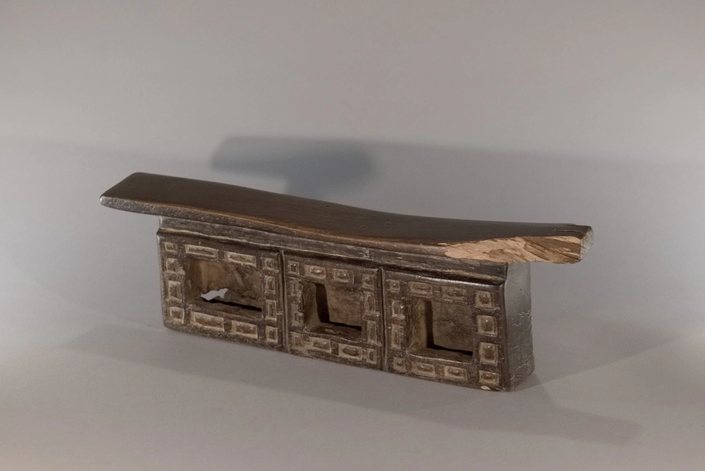 Cette œuvre, tout comme Z289, est originaire du village Ndebelé de Mabhoho. Bien qu’elle soit moins originale que la précédente, elle présente également l’attrait pour les motifs géométriques distinctifs des Ndebelés. Ces motifs se déploient autour des trois cavités à l’avant, ainsi que sur l’intégralité de la face arrière, cette dernière étant ornée d’un damier en deux couleurs. Datant du XIXe siècle, cette pièce montre des signes évidents d’utilisation intense, comme en témoignent la fissure transversale à l’arrière et l’usure asymétrique observée sur la surface de repos. Un grand vécu se dégage de cette pièce