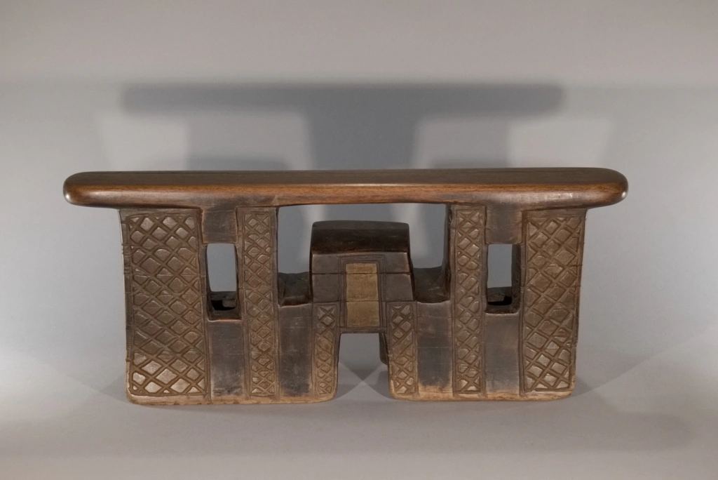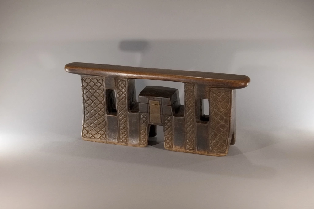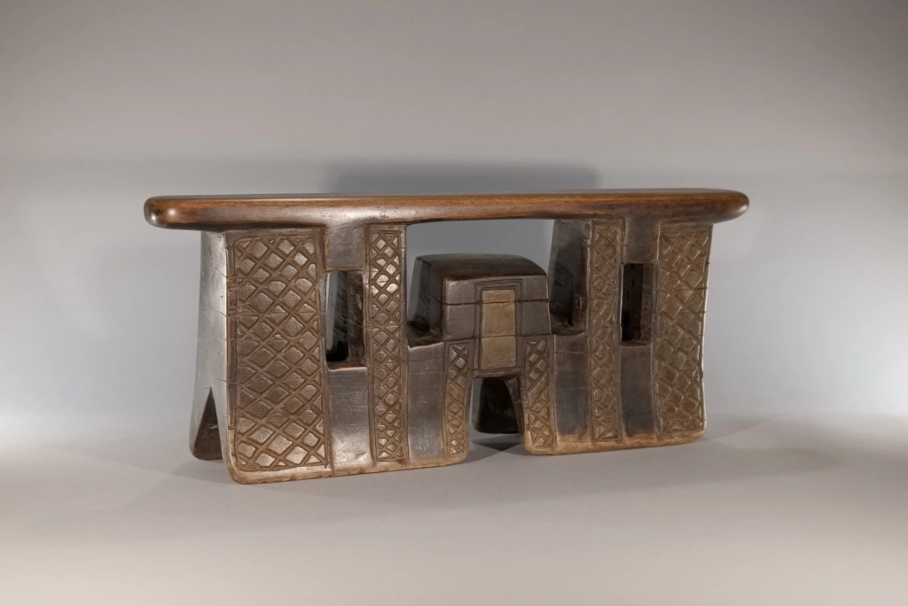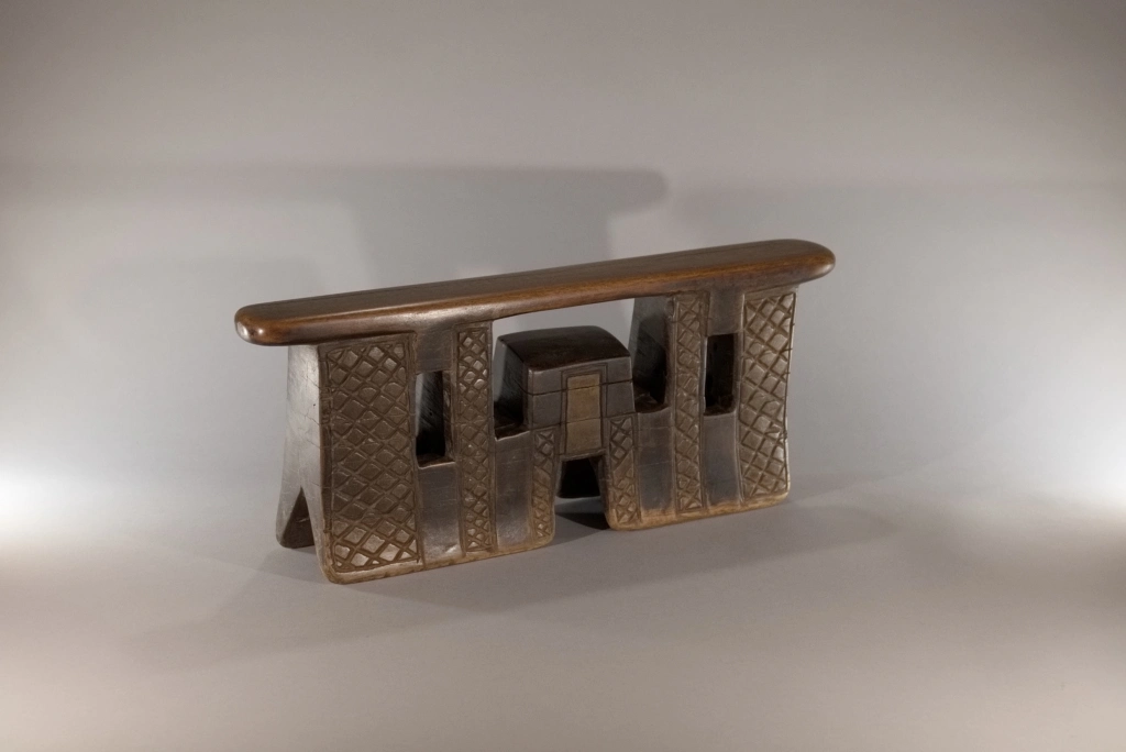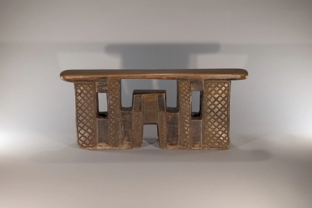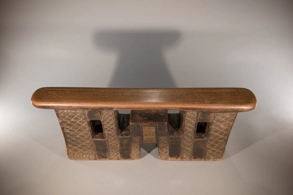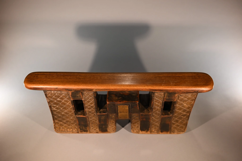 Appui-tête Z292. Un appui-tête en forme de pont complexe, imposant par ses dimensions : sa hauteur de 20 cm laisse à penser que le chef du village, propriétaire originel de cette pièce, l’utilisait également comme tabouret. On peut imaginer que le chef Khoza était de grande taille pour en faire usage. Ses bandes verticales d’amasumpa, alternant avec une belle patine sombre, accentuent la hauteur de cette pièce majestueuse.