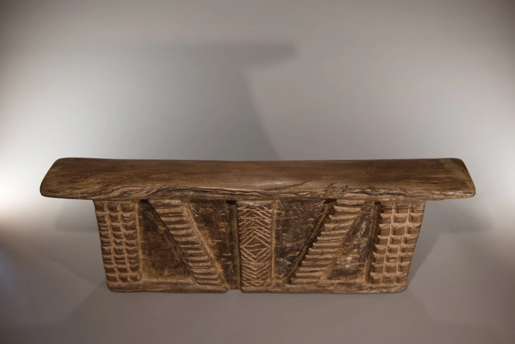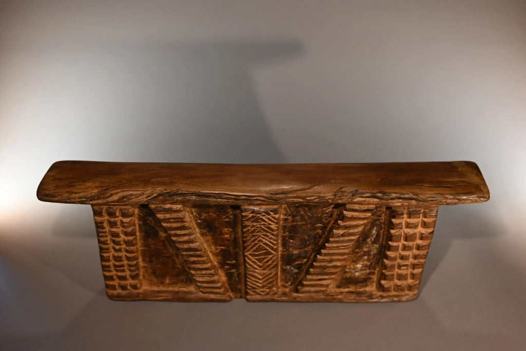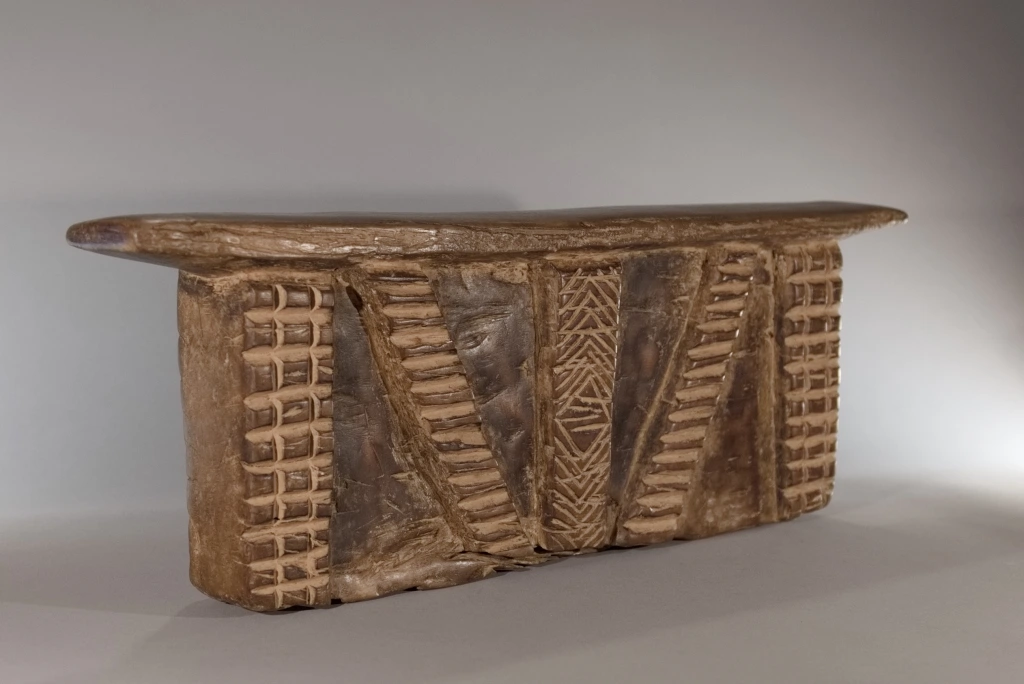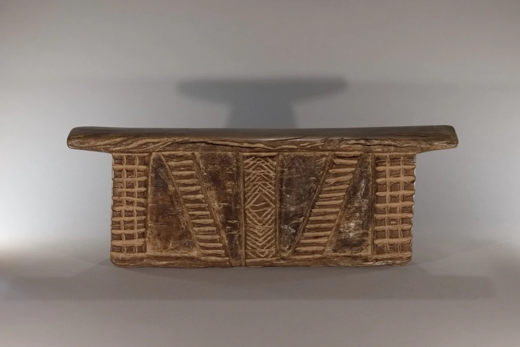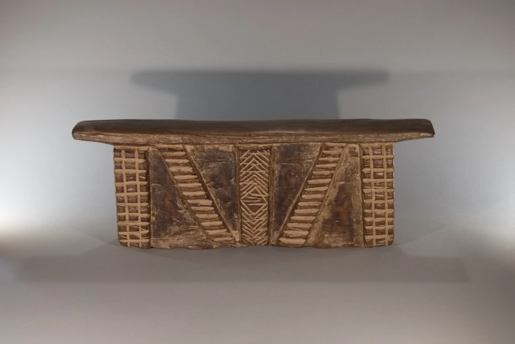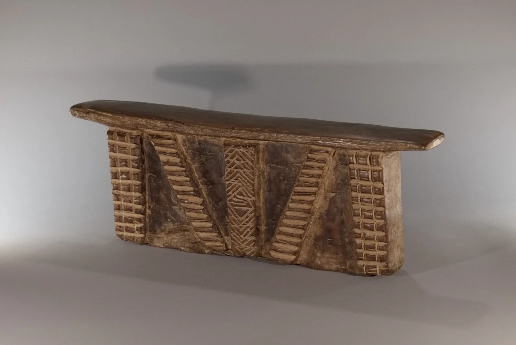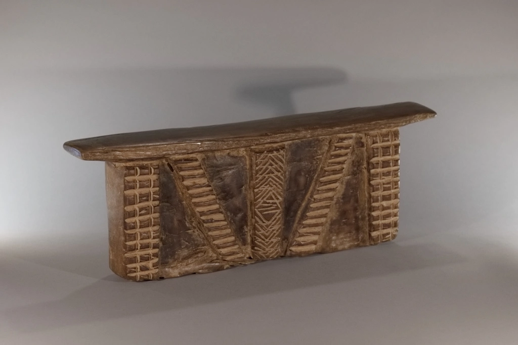 Bloc imposant et lourd, décoré de cinq bandes d’amasumpa, dont trois verticales et deux en biais. Sa taille conséquente laisse à penser qu’il a également pu servir de tabouret durant la journée. Le contraste entre le bloc et ses bandes en relief confère à cette pièce une ampleur supplémentaire, renforçant son caractère impressionnant.