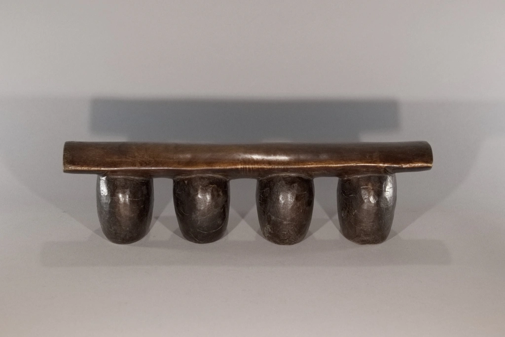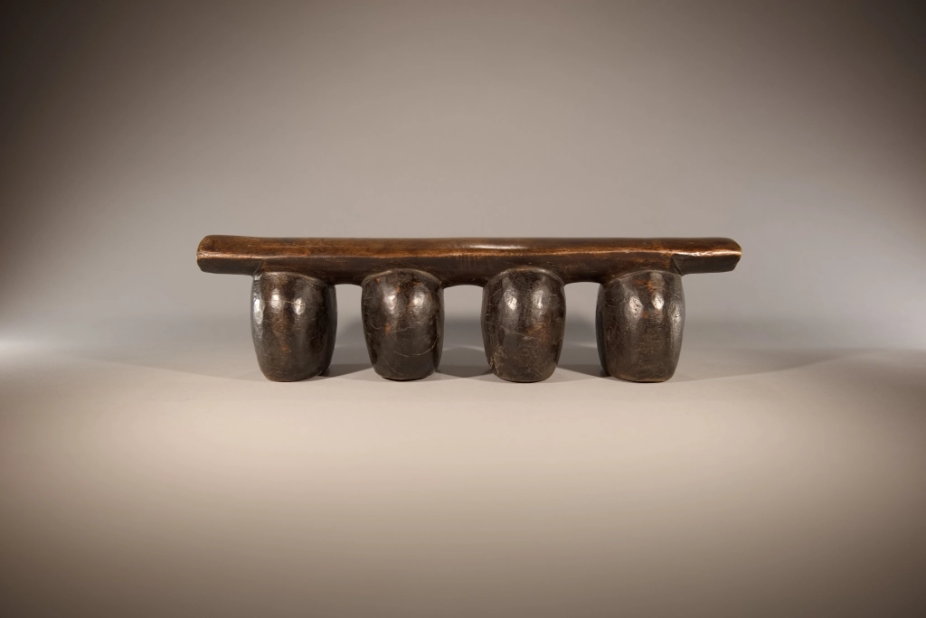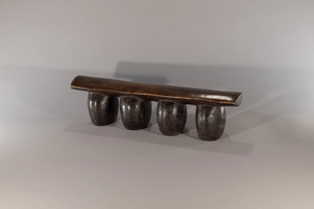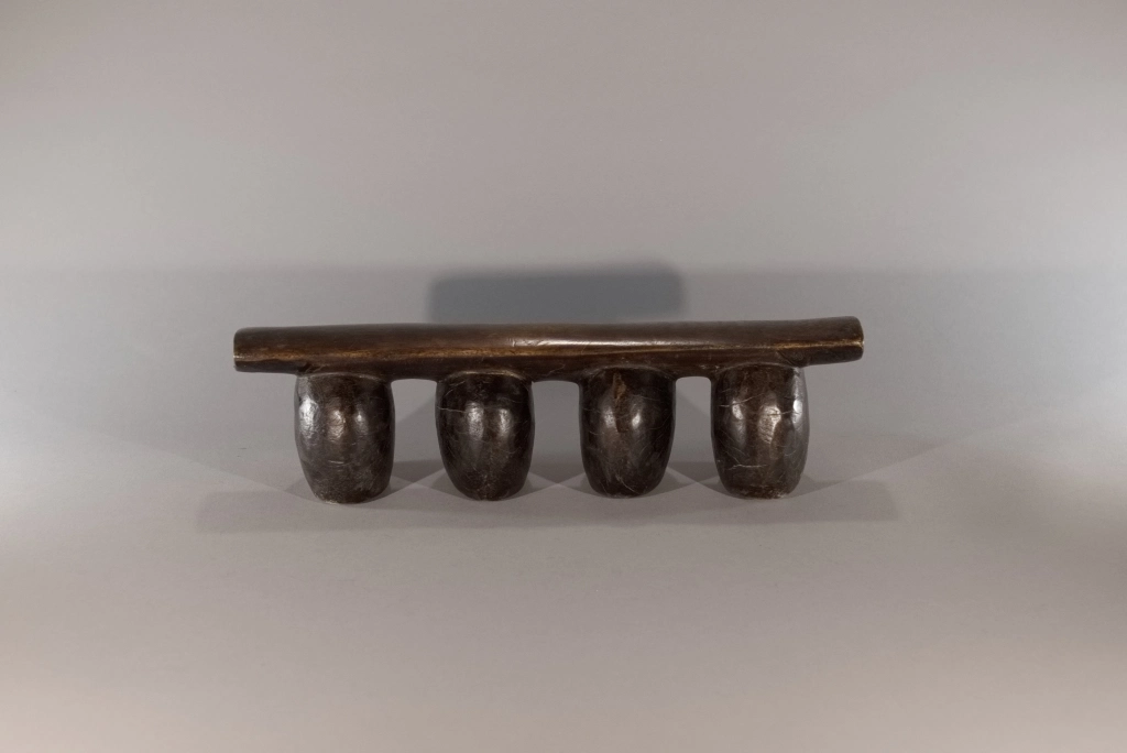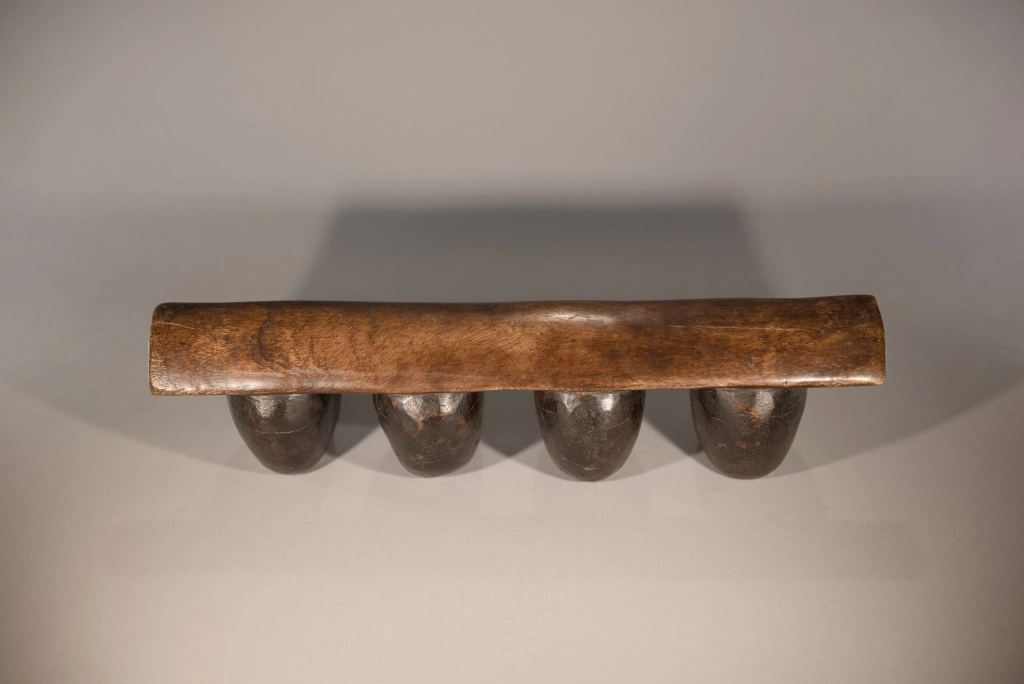 Un appui-tête dont la simplicité et la pureté en font la beauté : quatre pieds ronds, bombés, oblongs, en forme de pied d’éléphant, supportant une plateforme d’appui légèrement arrondie en bois plus clair. Dépourvu de toute décoration qui apparaîtrait comme des fioritures inutiles, il mise sur l’essentiel. Les surfaces uniformes et patinées des pieds se suffisent à elles-mêmes et dégagent une solidité et une rondeur particulièrement esthétiques.