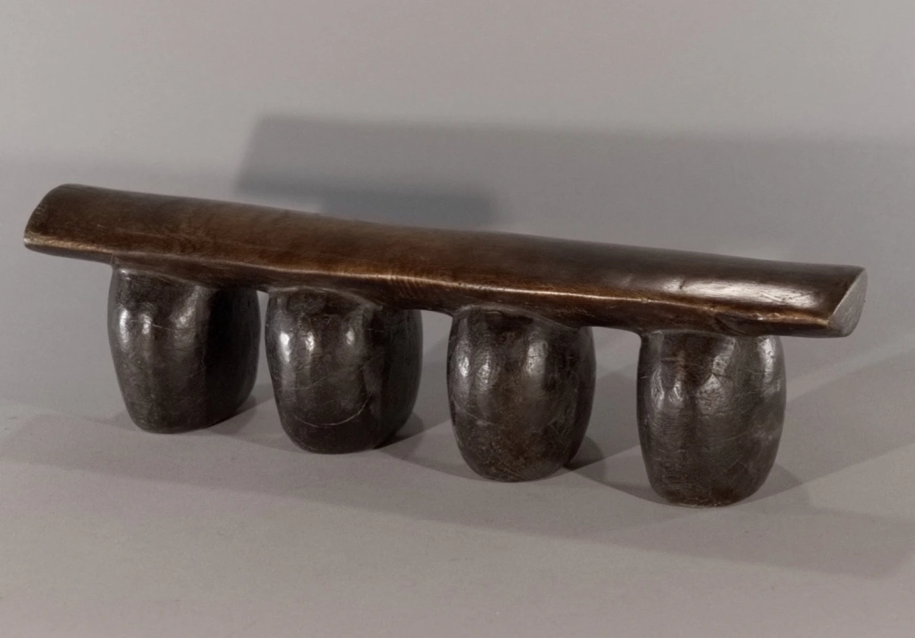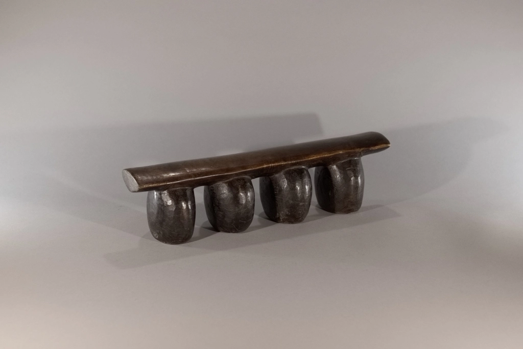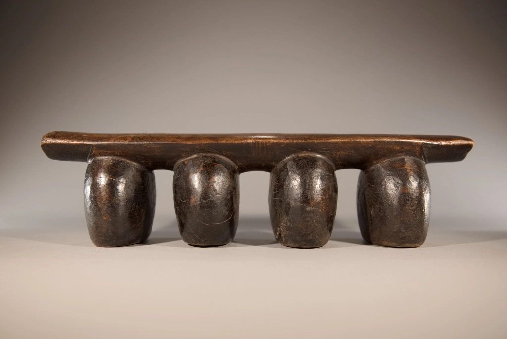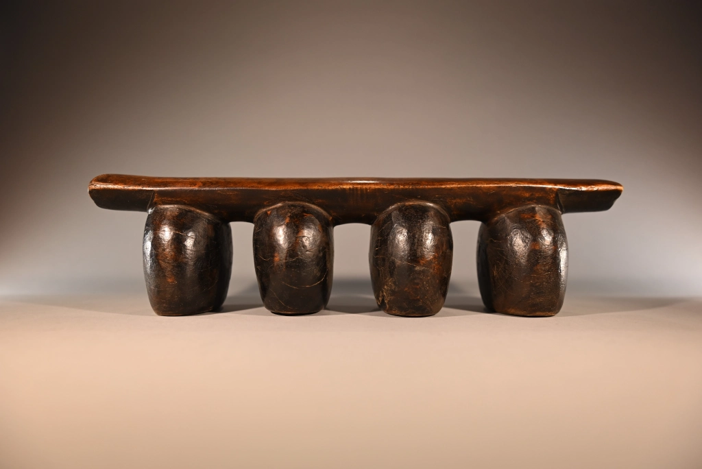 Un appui-tête dont la simplicité et la pureté en font la beauté : quatre pieds ronds, bombés, oblongs, en forme de pied d’éléphant, supportant une plateforme d’appui légèrement arrondie en bois plus clair. Dépourvu de toute décoration qui apparaîtrait comme des fioritures inutiles, il mise sur l’essentiel. Les surfaces uniformes et patinées des pieds se suffisent à elles-mêmes et dégagent une solidité et une rondeur particulièrement esthétiques.