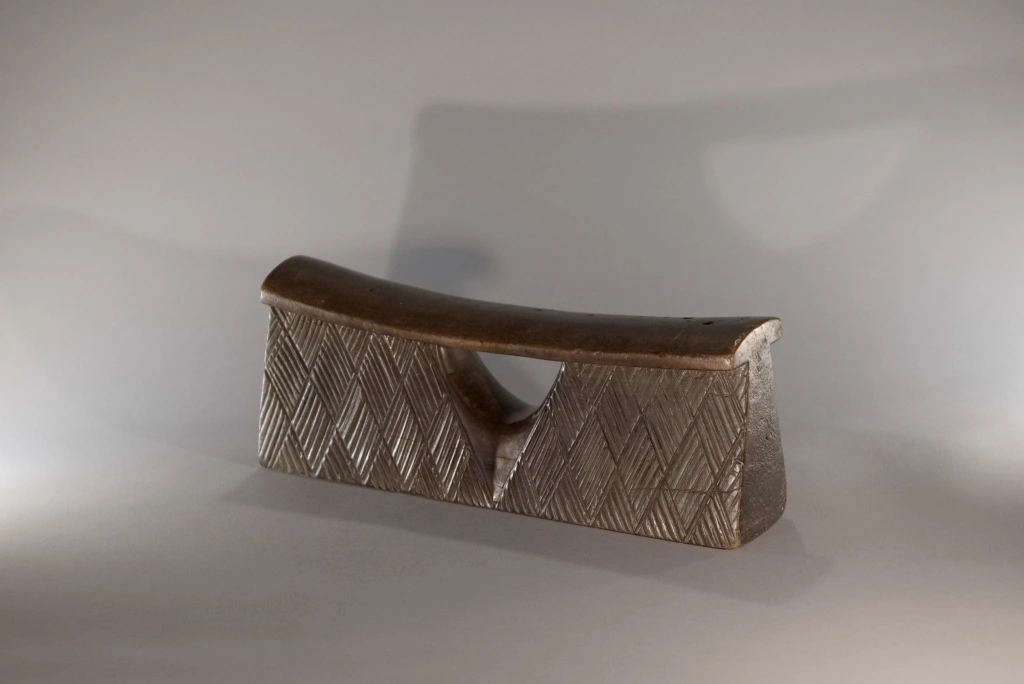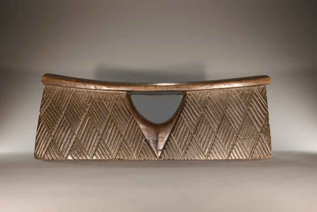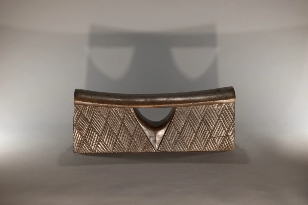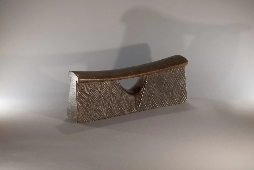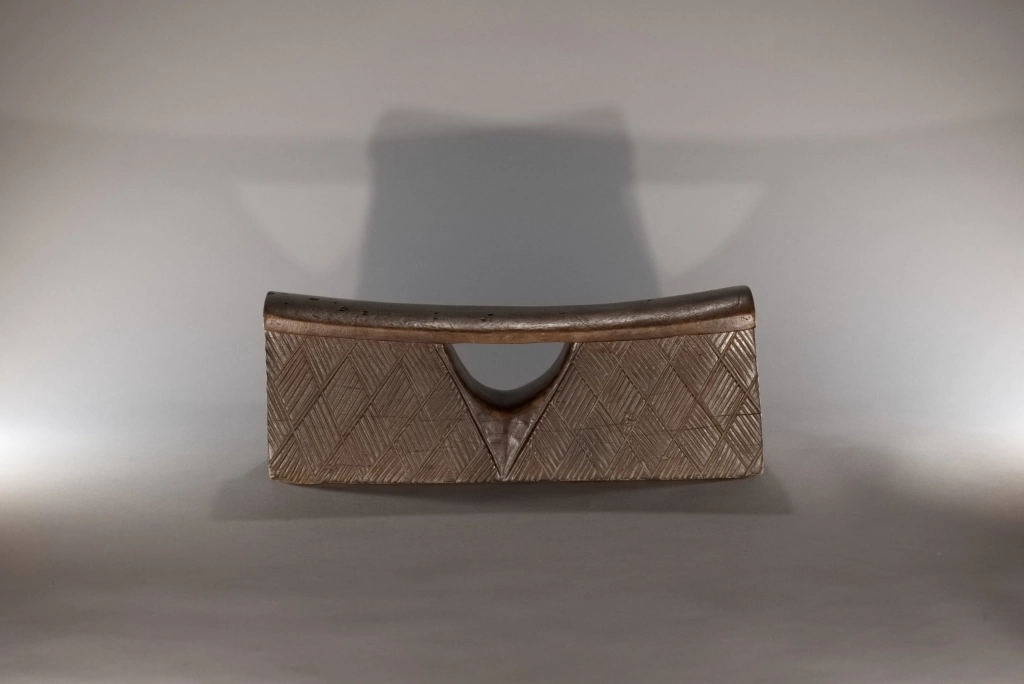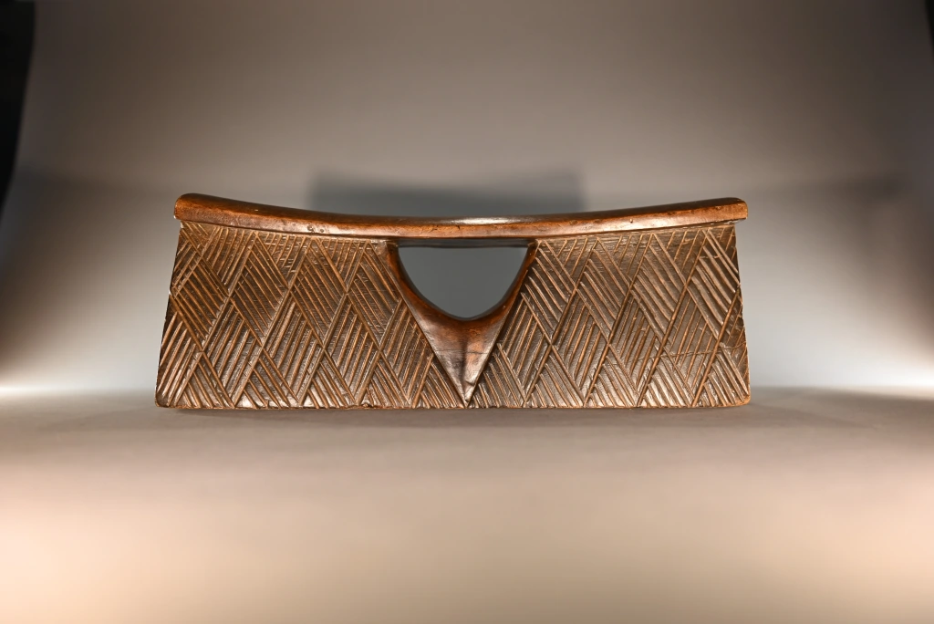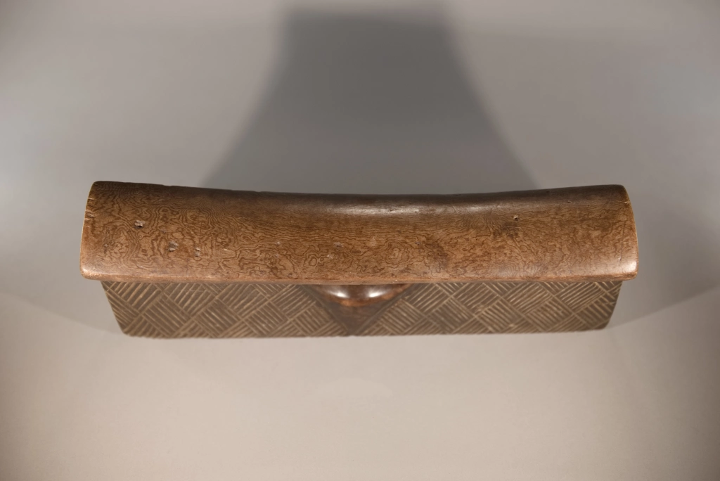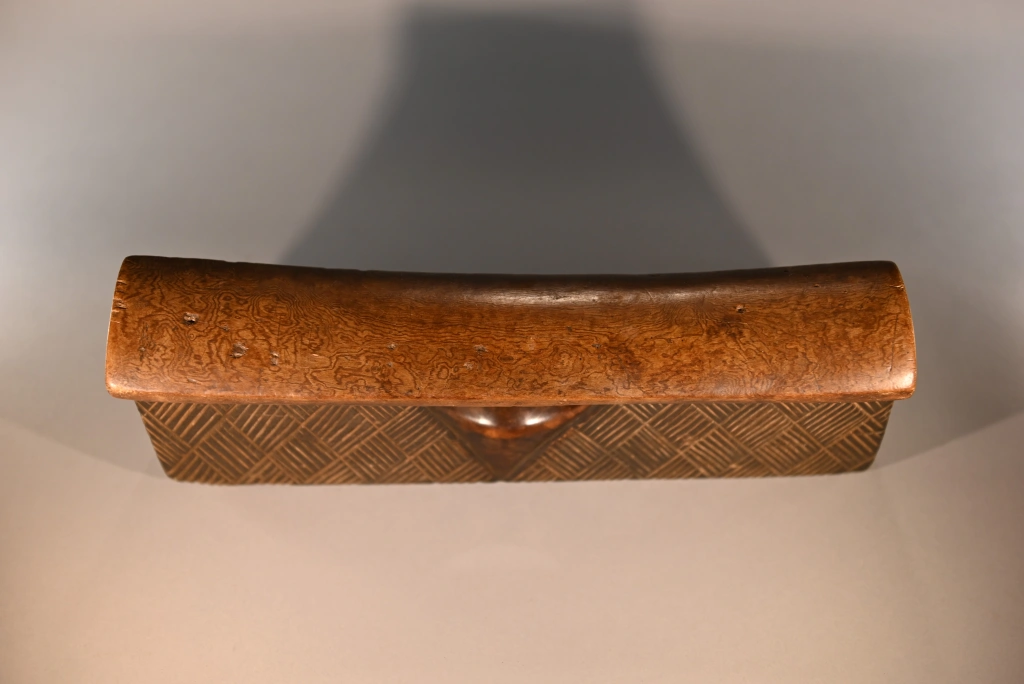 Un coup de cœur pour cette pièce aussi rare que simple et aussi pure que basique quant à sa forme, comme tous les appuie-tête en forme de bloc. Mais que dire de son survêtement en losanges rainurés, aussi régulier que fin, qui l’habille comme une couverture d’apparat ? Que dire de sa fenêtre centrale en forme d’ogive, offrant une préhension plus aisée ? Que dire de la douce courbure de sa plateforme d’appui, qui procure un repos que je peux qualifier de confortable, l’ayant essayé à Paris, loin de son lieu de naissance ? Un vrai petit bijou !