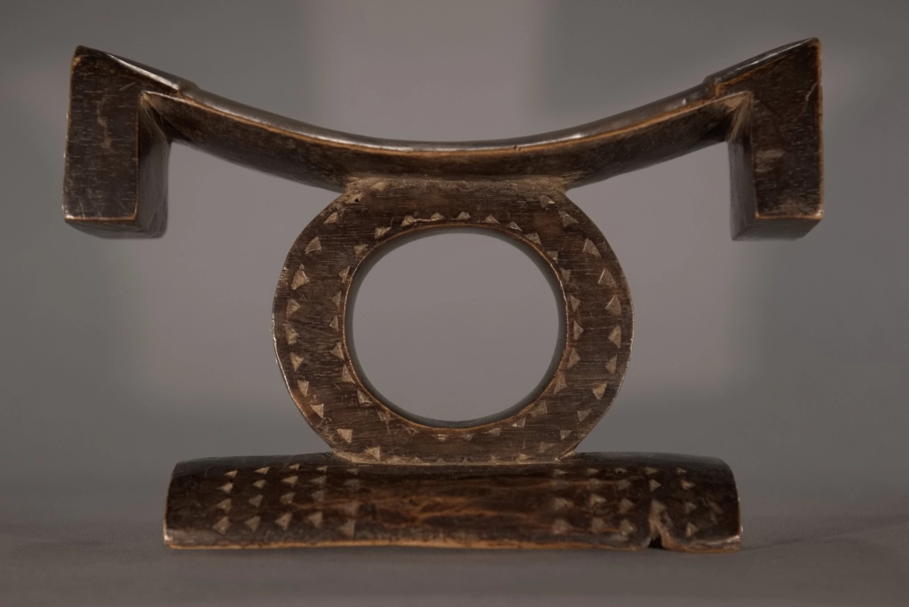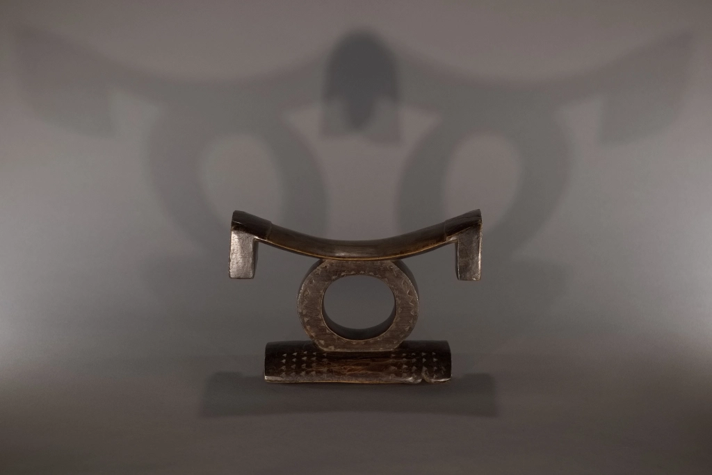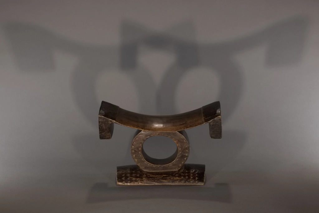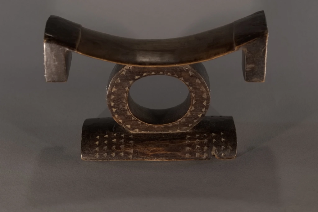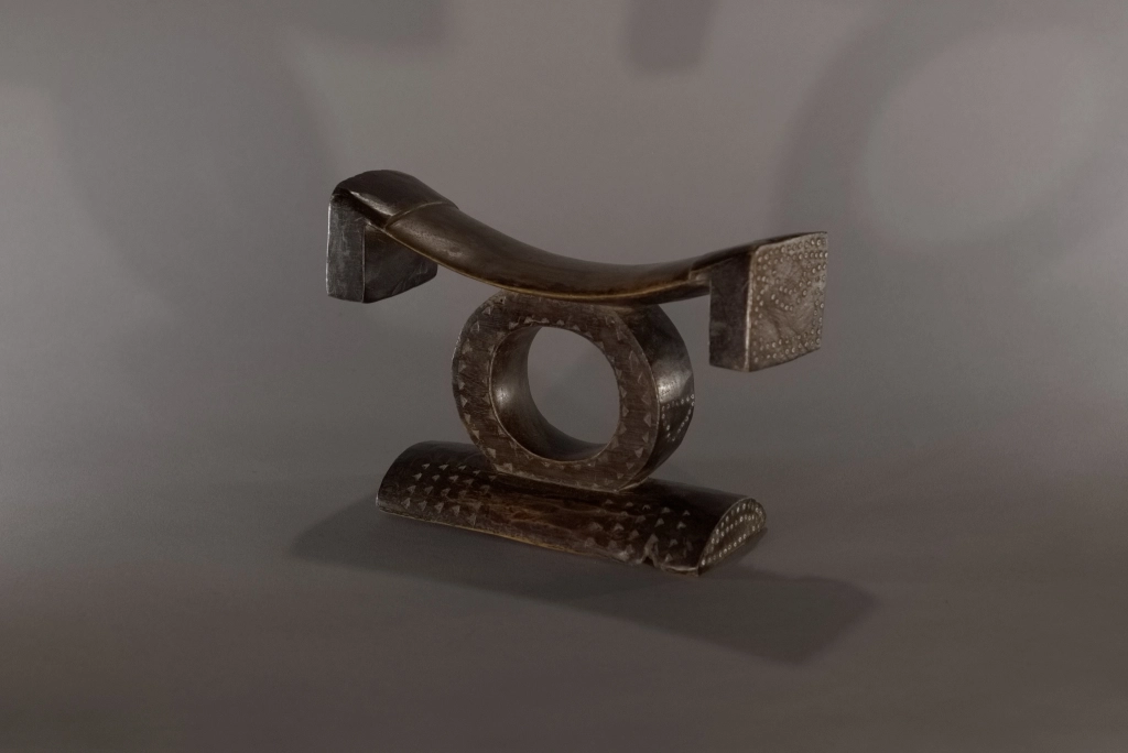 Pièce emblématique des appuis-têtes zoulous. Sa délicatesse provient de la succession d’appuis apparemment instables : une barre d’appui incurvée avec ses retombées aux extrémités en équilibre sur un cercle, lui-même posé sur un pied bombé et décoré de pointes de diamants. Son style North Nguni est sous influence Tsonga, avec ses deux ergots aux extrémités de sa barre d’appui. Il a été encensé par les spécialistes que sont Nessa, Leibhammer, Klepper, Nettleton et Rathica. Une pièce quasiment identique a fait l’objet, ces vingt dernières années, de multiples ventes aux enchères à Bruxelles, Londres et New York : estimée entre 5 000 et 7 000 euros, probablement en raison de sa délicatesse et du remarquable travail du sculpteur. Cette pièce, de même facture, ressort d’une collection privée sud-africaine.