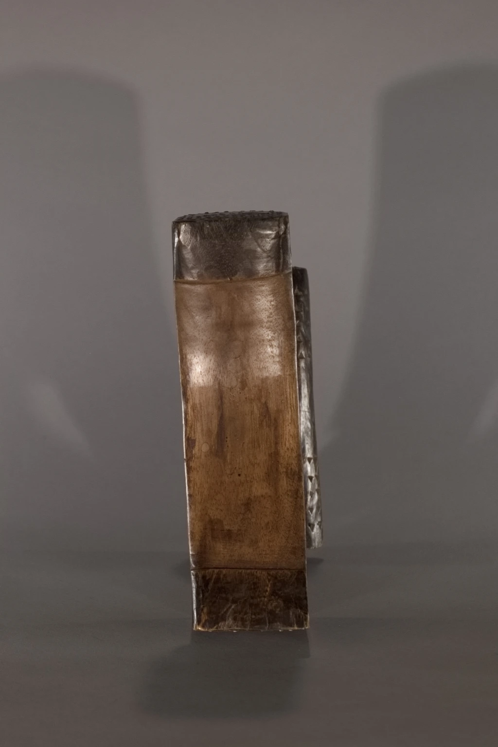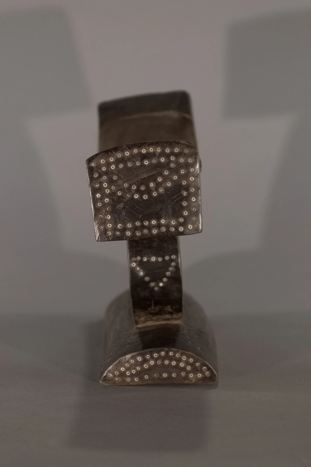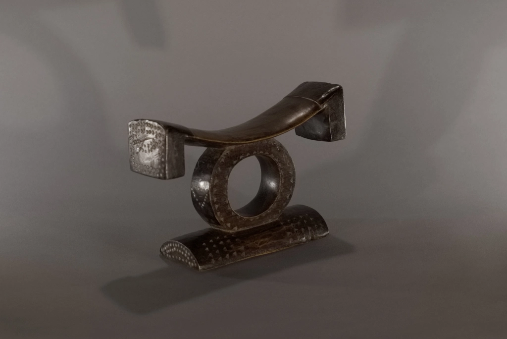Pièce emblématique des appuis-têtes zoulous. Sa délicatesse provient de la succession d’appuis apparemment instables : une barre d’appui incurvée avec ses retombées aux extrémités en équilibre sur un cercle, lui-même posé sur un pied bombé et décoré de pointes de diamants. Son style North Nguni est sous influence Tsonga, avec ses deux ergots aux extrémités de sa barre d’appui. Il a été encensé par les spécialistes que sont Nessa, Leibhammer, Klepper, Nettleton et Rathica. Une pièce quasiment identique a fait l’objet, ces vingt dernières années, de multiples ventes aux enchères à Bruxelles, Londres et New York : estimée entre 5 000 et 7 000 euros, probablement en raison de sa délicatesse et du remarquable travail du sculpteur. Cette pièce, de même facture, ressort d’une collection privée sud-africaine.