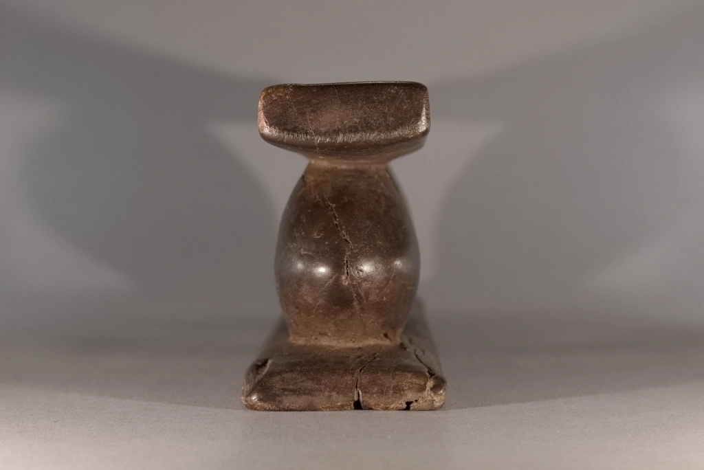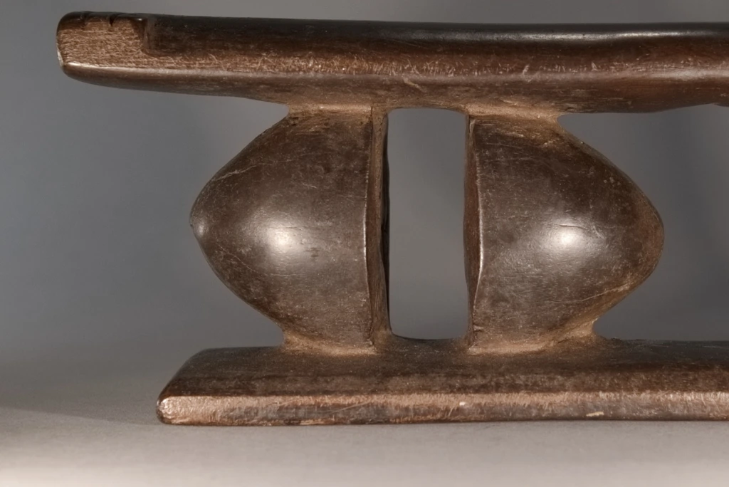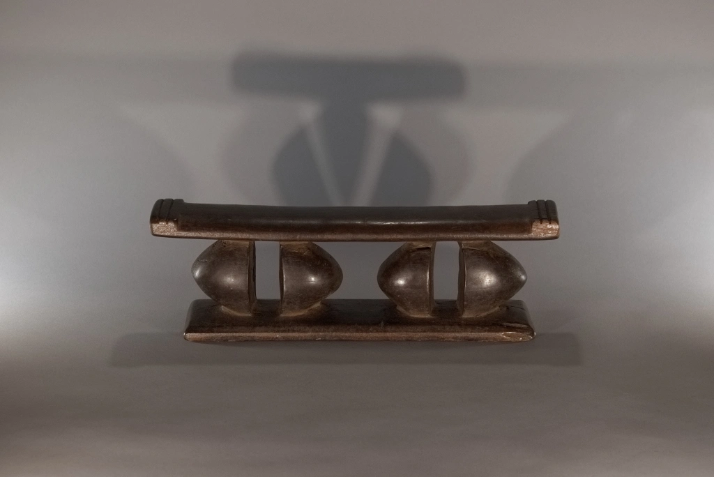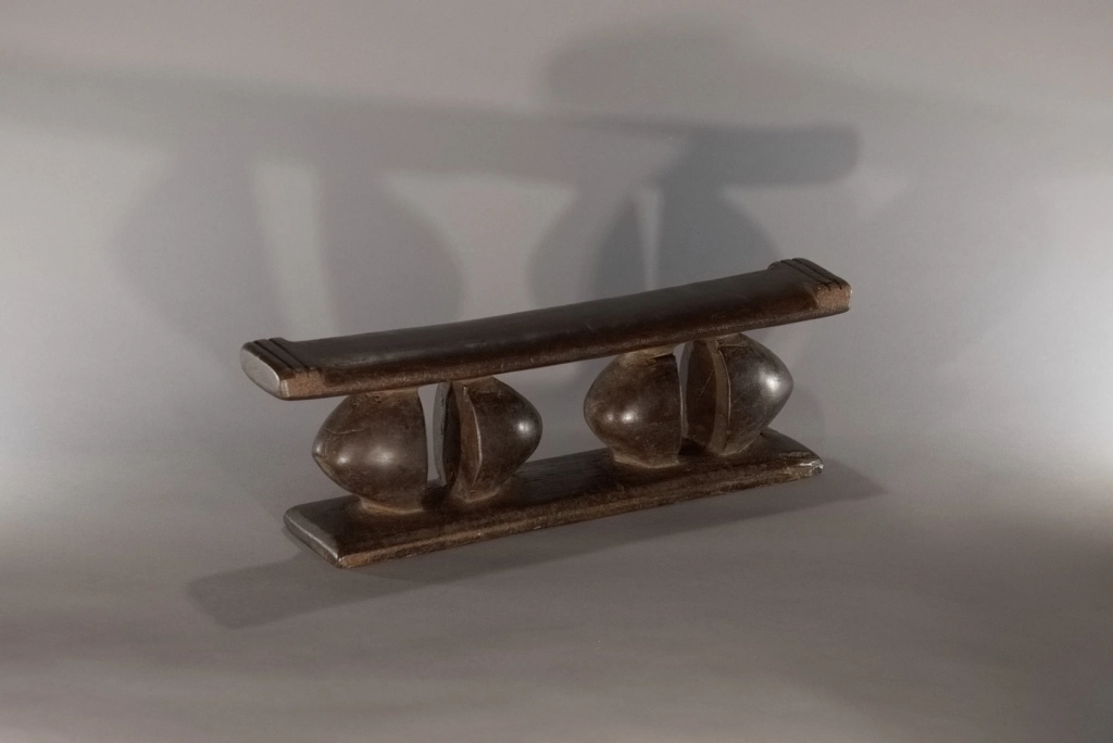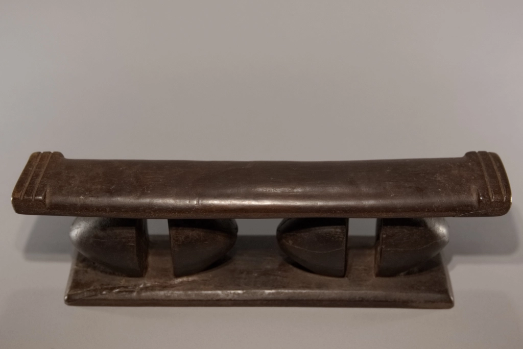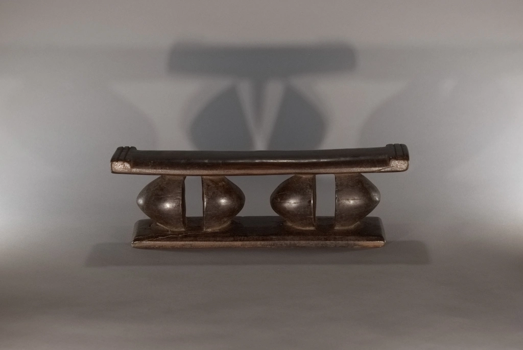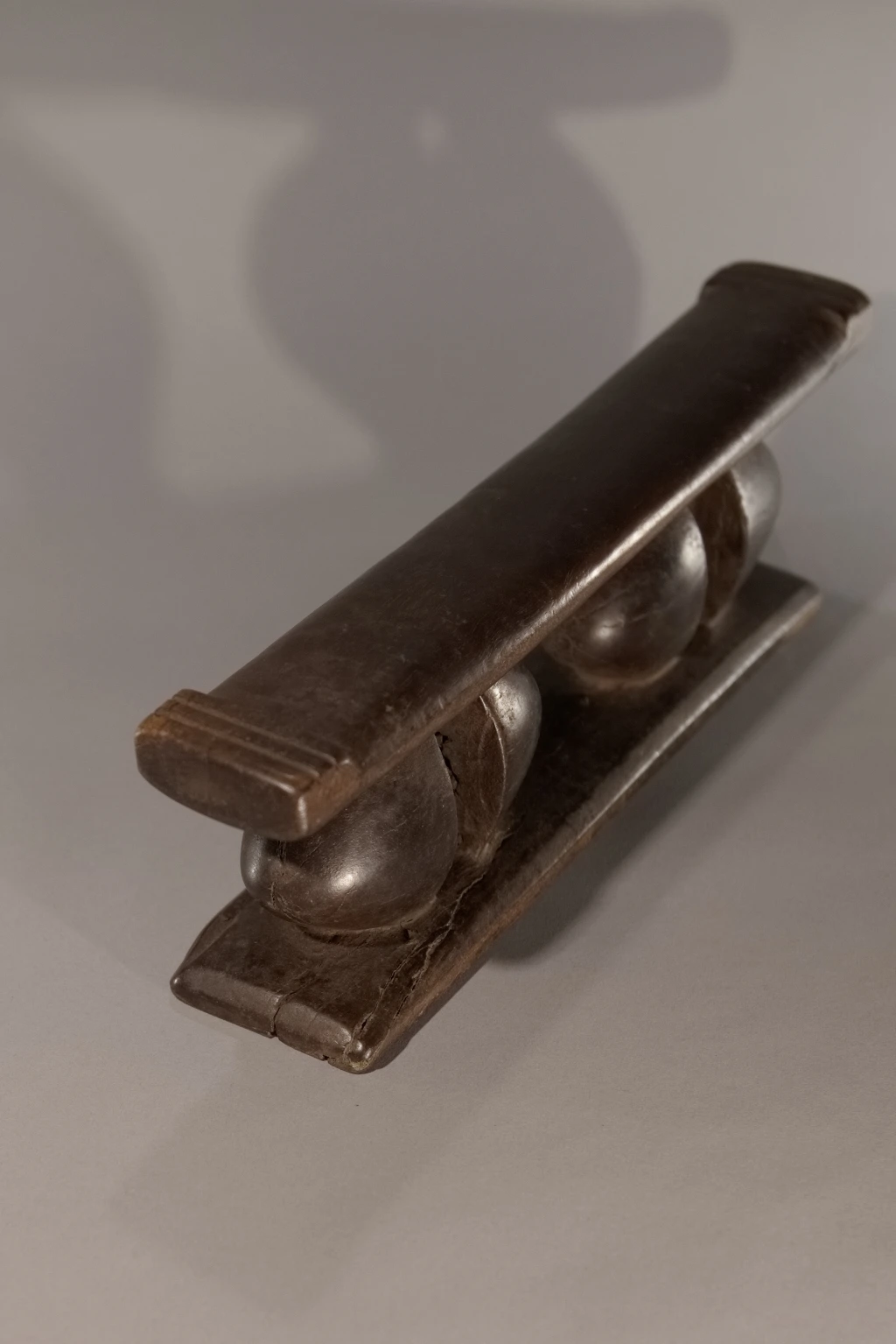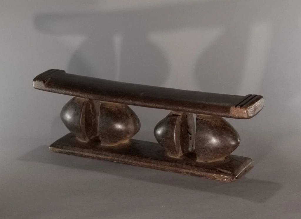 Appuie-tête du milieu du XXe siècle, représentant deux ballons de rugby fracturés en leur milieu. Rappelons que ce sport est le sport national et a participé à l’histoire du pays : la fédération créée en 1889 réussit à rassembler dans la même équipe les « Frères Ennemis « : les Britanniques et les Boers. Deux fédérations sont créées à la fin du XIXe siècle et fracturent les joueurs selon leur couleur de peau, comme cet appuie-tête le représente. Baptisée « Springboks » au début du XXe siècle, l’équipe nationale reste longtemps composée de Blancs qui pratiquent ce sport dans les écoles qui leur sont réservées. Le titre de champion du monde en 1995, avec une équipe multiculturelle sous la houlette de Nelson Mandela, sera le symbole de la fin (apparente) de l’apartheid.