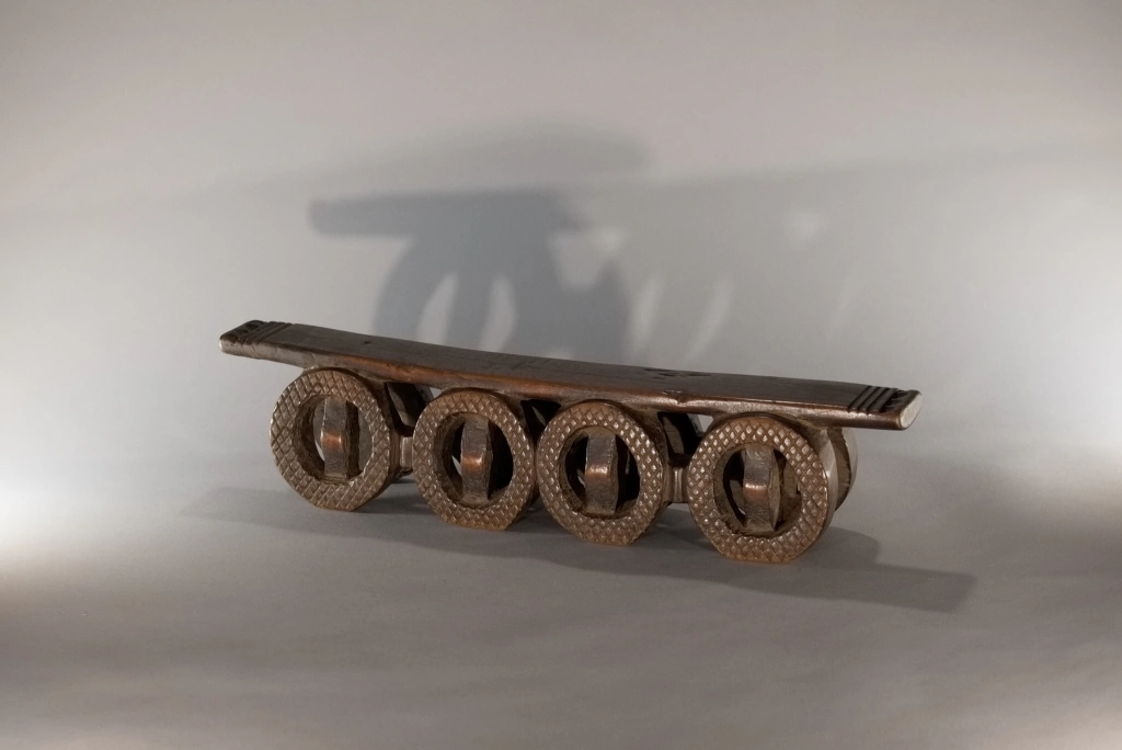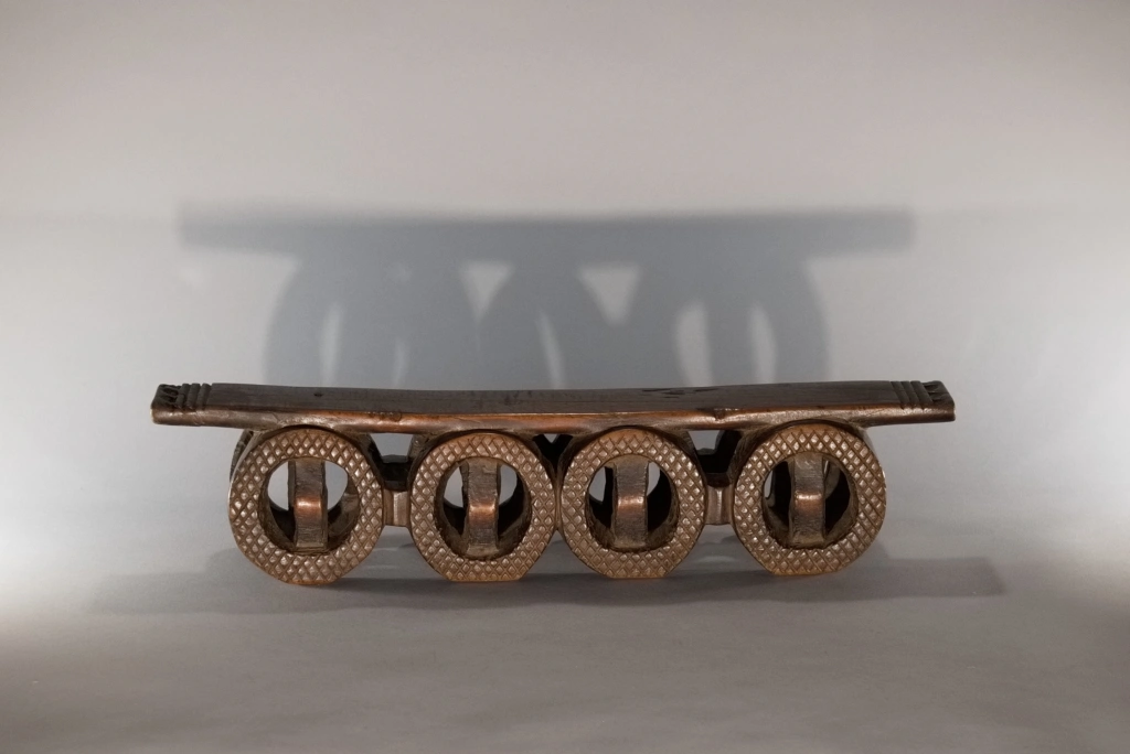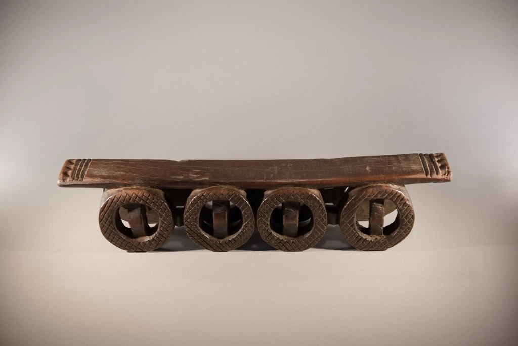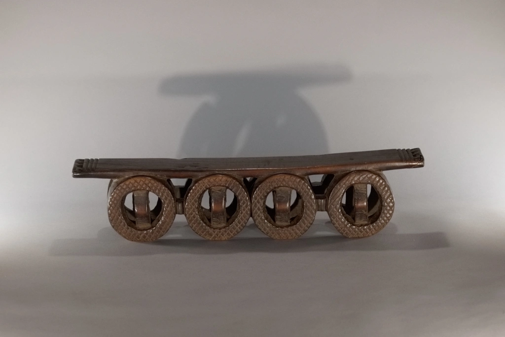 Superbe pièce muséale, dans la même veine que la célèbre pièce du MET Museum, composée de trois roues doubles décorées de cannelures. Cet appui-tête se distingue par donc ses quatre roues doubles ornées d’amasumpa, un élément extrêmement rare sur des pièces de cette nature, celles représentant des chariots/wagons. On peut également noter la présence d’essieux verticaux au centre des roues, ajoutant en originalité. Pièce unique et esthétique, elle figure parmi les appuie-têtes phares de toute collection.