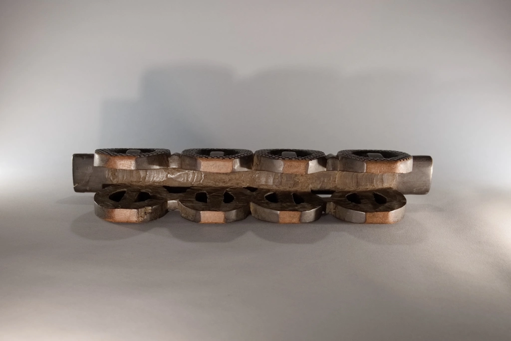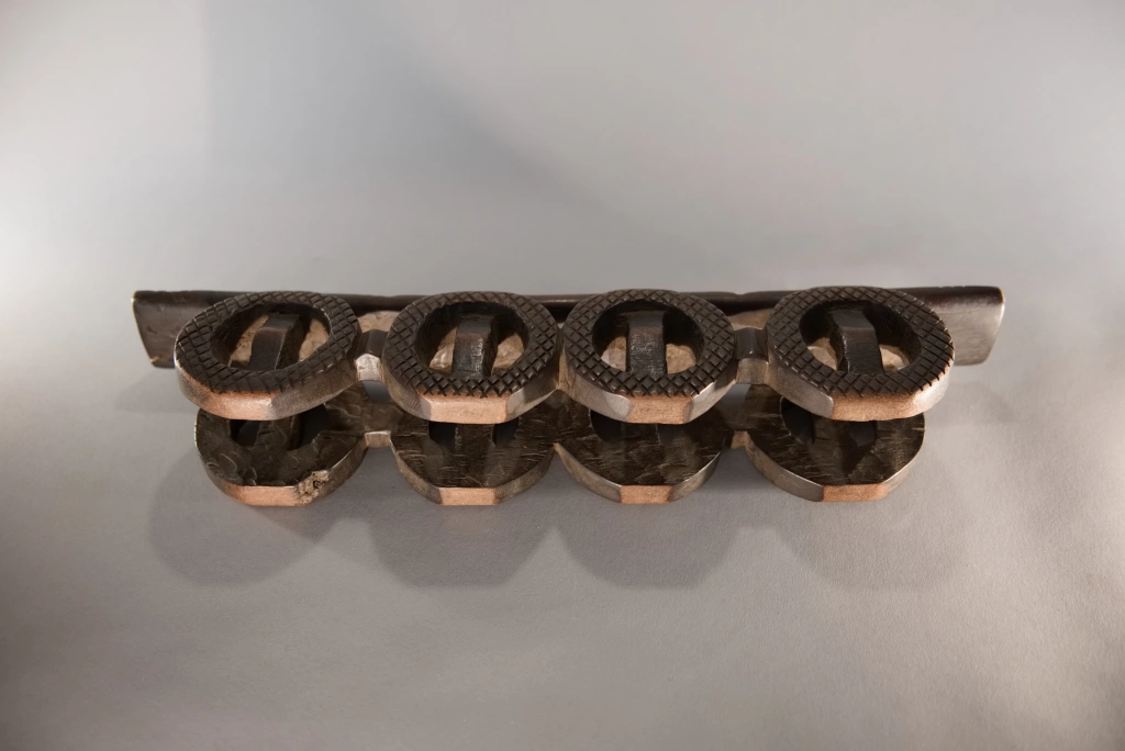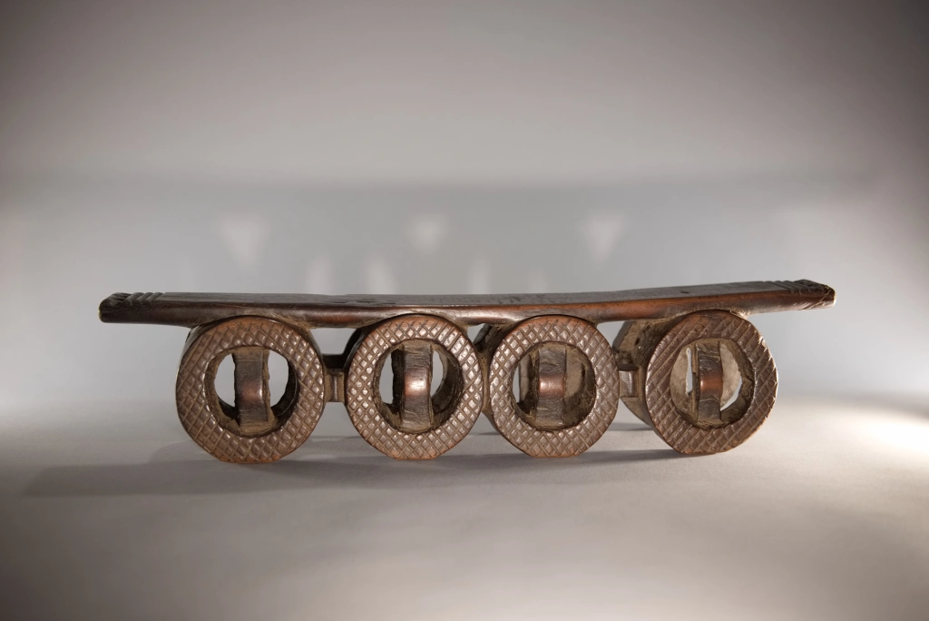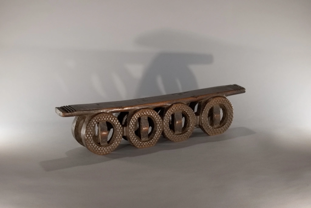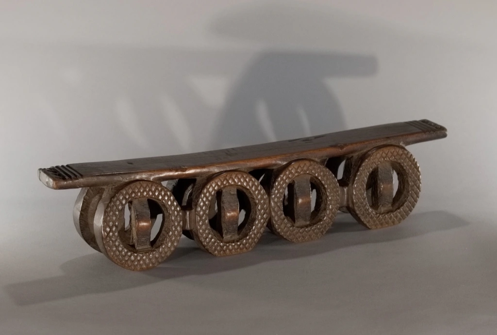 Superbe pièce muséale, dans la même veine que la célèbre pièce du MET Museum, composée de trois roues doubles décorées de cannelures. Cet appui-tête se distingue par donc ses quatre roues doubles ornées d’amasumpa, un élément extrêmement rare sur des pièces de cette nature, celles représentant des chariots/wagons. On peut également noter la présence d’essieux verticaux au centre des roues, ajoutant en originalité. Pièce unique et esthétique, elle figure parmi les appuie-têtes phares de toute collection.