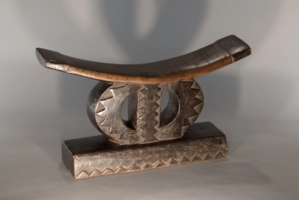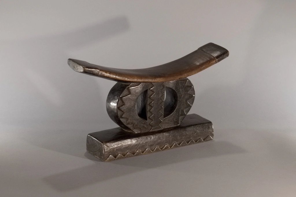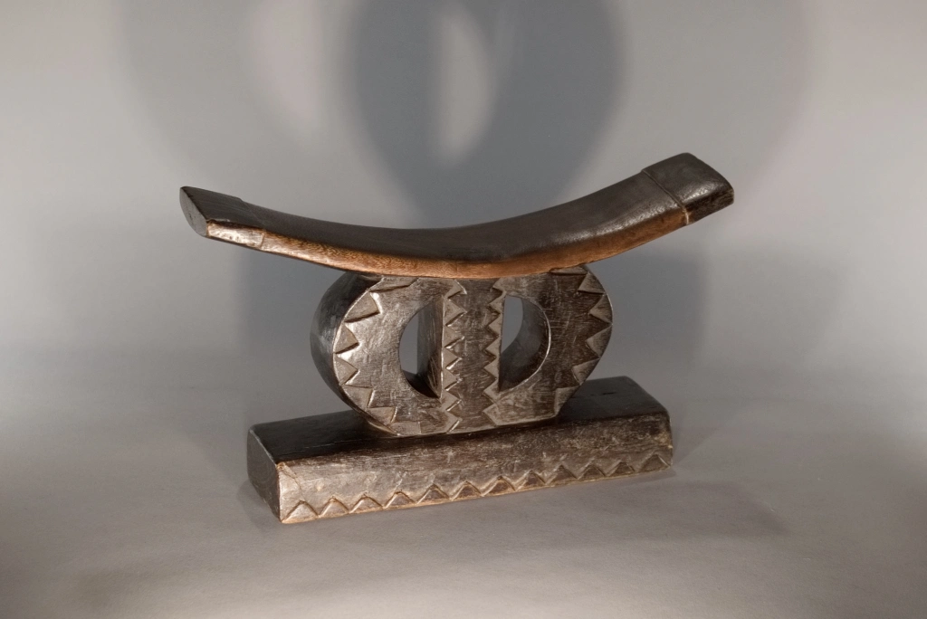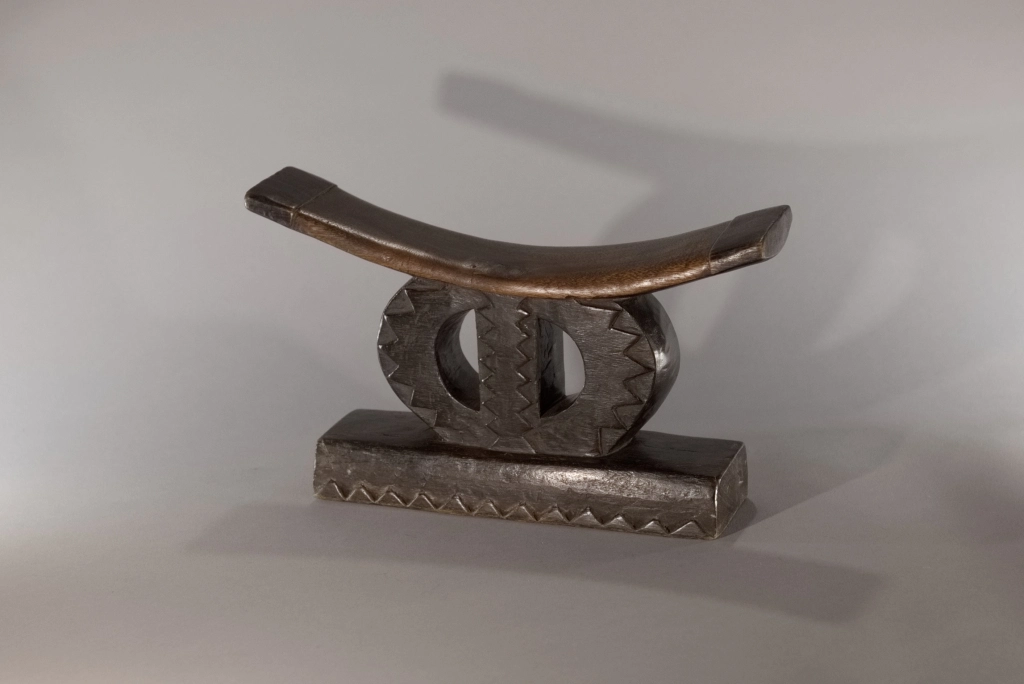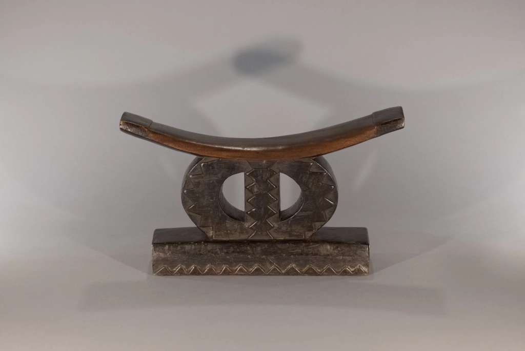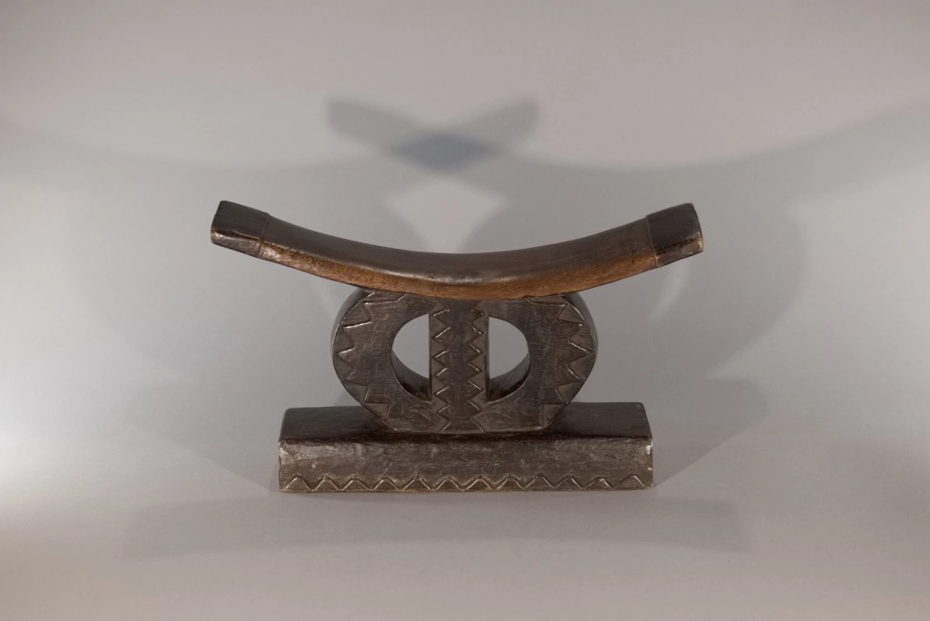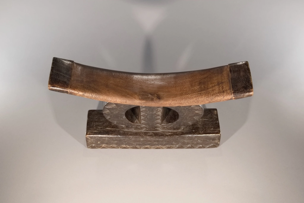 Très beau spécimen de la catégorie « petit appuie-tête zoulou en cercle », coupé par une barre verticale, le classant dans la sous-catégorie des formes au symbole de l’infini. Il diffère de la pièce Z257 par son absence d’ergot au style Tsonga et par la présence d’un socle surdimensionné, lui conférant une assise conséquente qui participe grandement à la personnalité de l’objet. Sa barre d’appui, courbe et fine, en ressort de ce fait comme extrêmement légère.