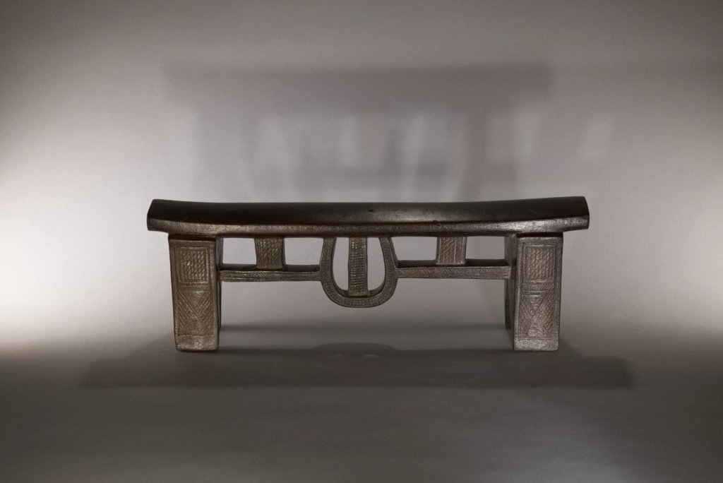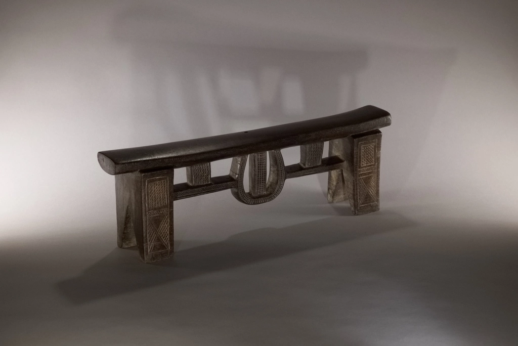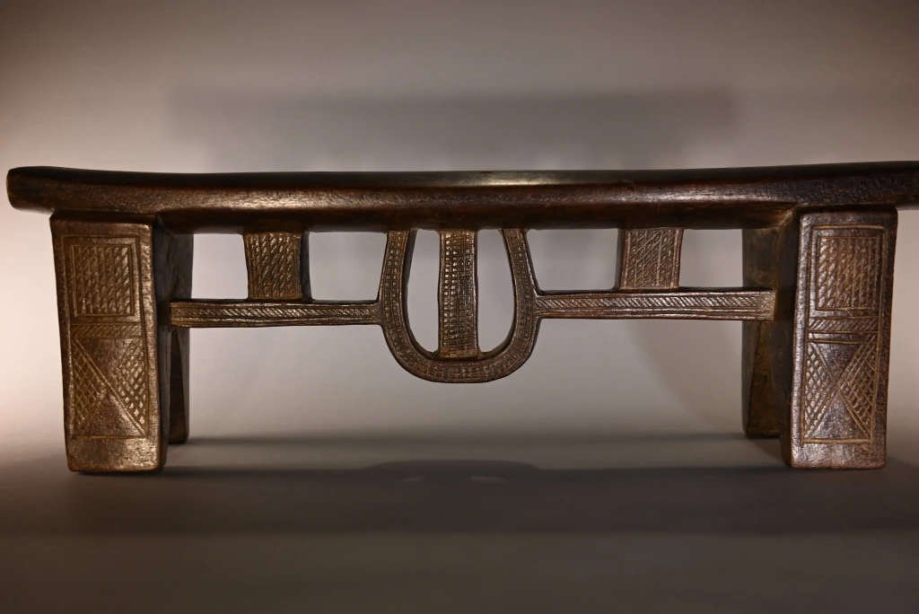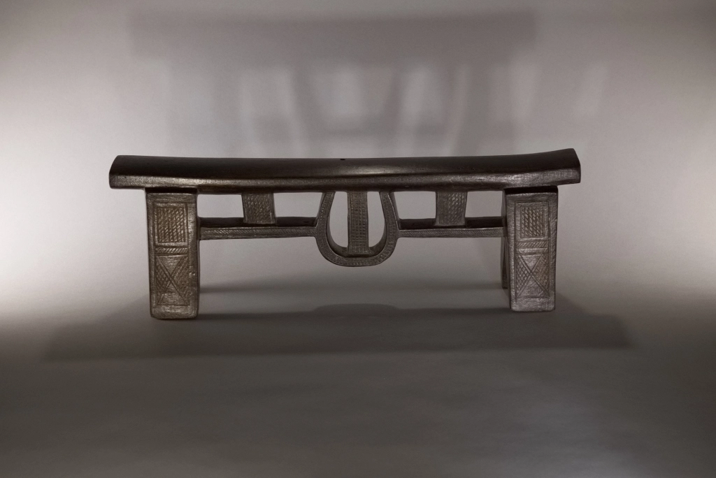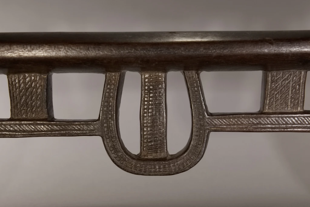 Une superbe pièce architecturale de très haute qualité technique. Elle allie complexité du design et précision de son exécution. On la retrouve parfois dans les collections de musées comme le JAG (Johannesburg Art Gallery). Cette forme complexe comprend une barre de renfort accrochée par des suspentes verticales, mais aussi une suspente centrale arrondie, entièrement décorée d’amasumpa finement ciselés.