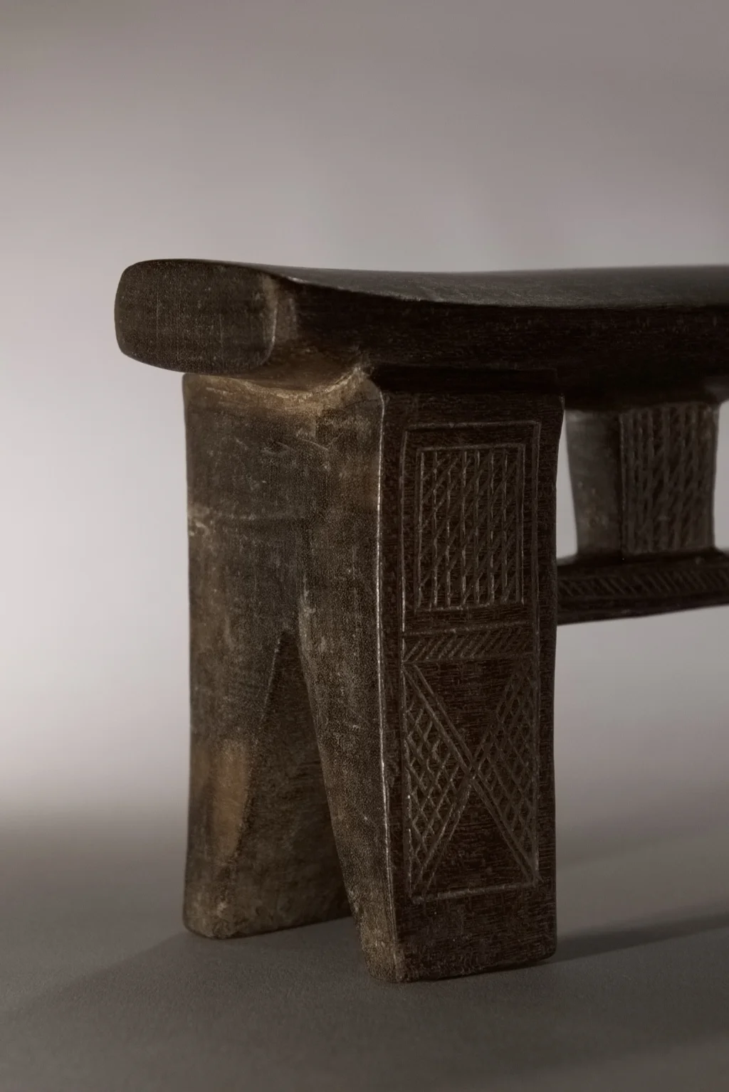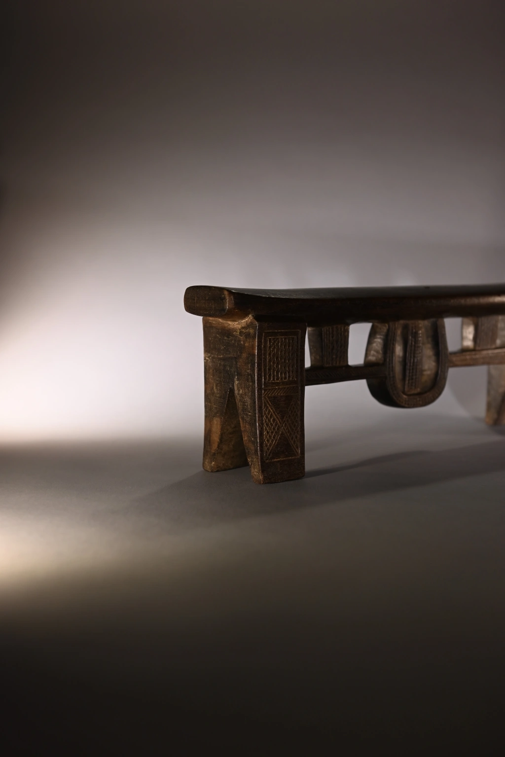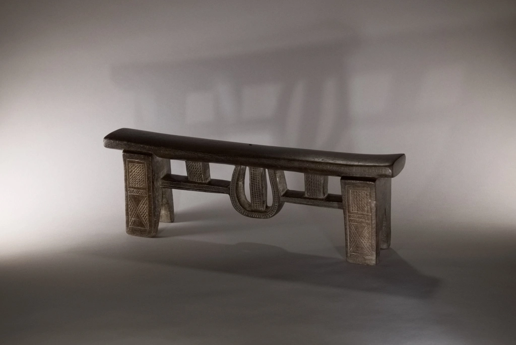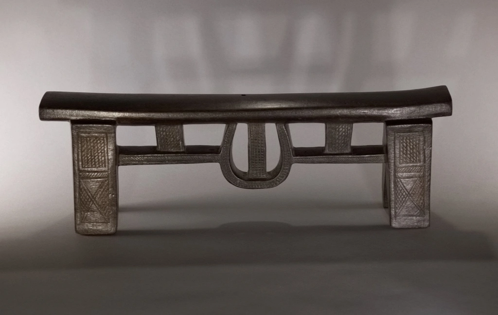 Une superbe pièce architecturale de très haute qualité technique. Elle allie complexité du design et précision de son exécution. On la retrouve parfois dans les collections de musées comme le JAG (Johannesburg Art Gallery). Cette forme complexe comprend une barre de renfort accrochée par des suspentes verticales, mais aussi une suspente centrale arrondie, entièrement décorée d’amasumpa finement ciselés.