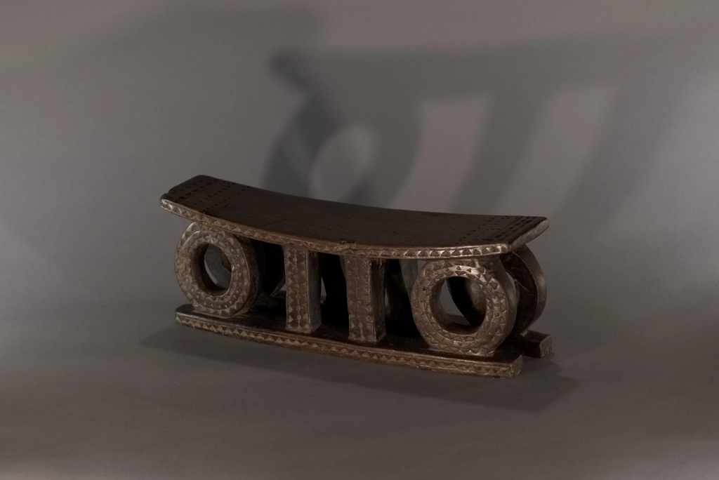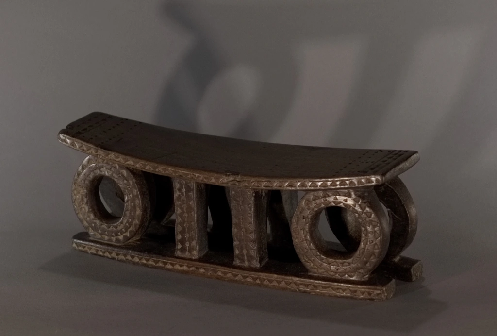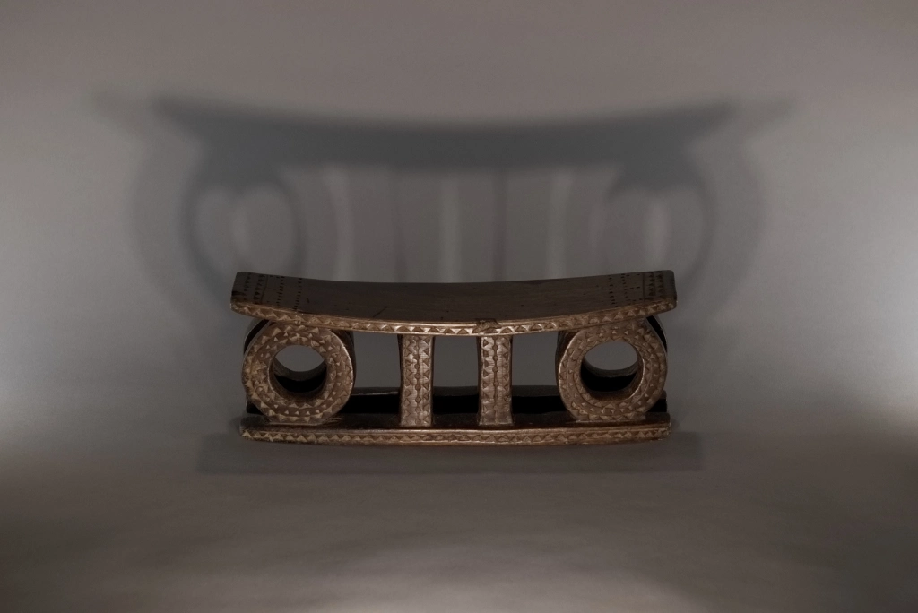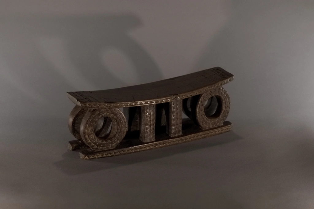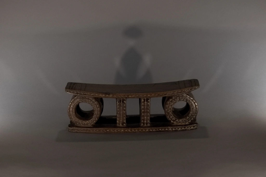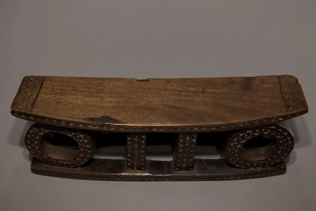 Un appuie-tête du XIXe siècle remarquable de délicatesse en raison de sa petite taille (seulement 11 centimètres de hauteur). Son design symbolise le soleil levant et le soleil couchant, orné d’engravures en formes de triangles, caractéristiques de la fin du XIXe et du début du XXe siècle. Une pièce fortement ressemblante aux œuvres du musée d’Ackland ou à celles collectées par la Johannesburg Art Gallery