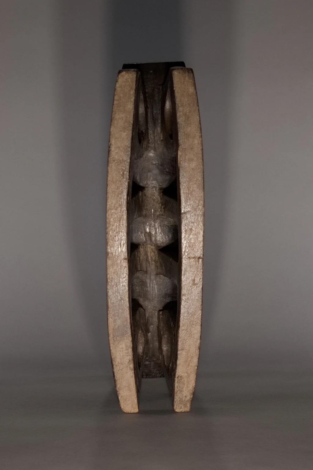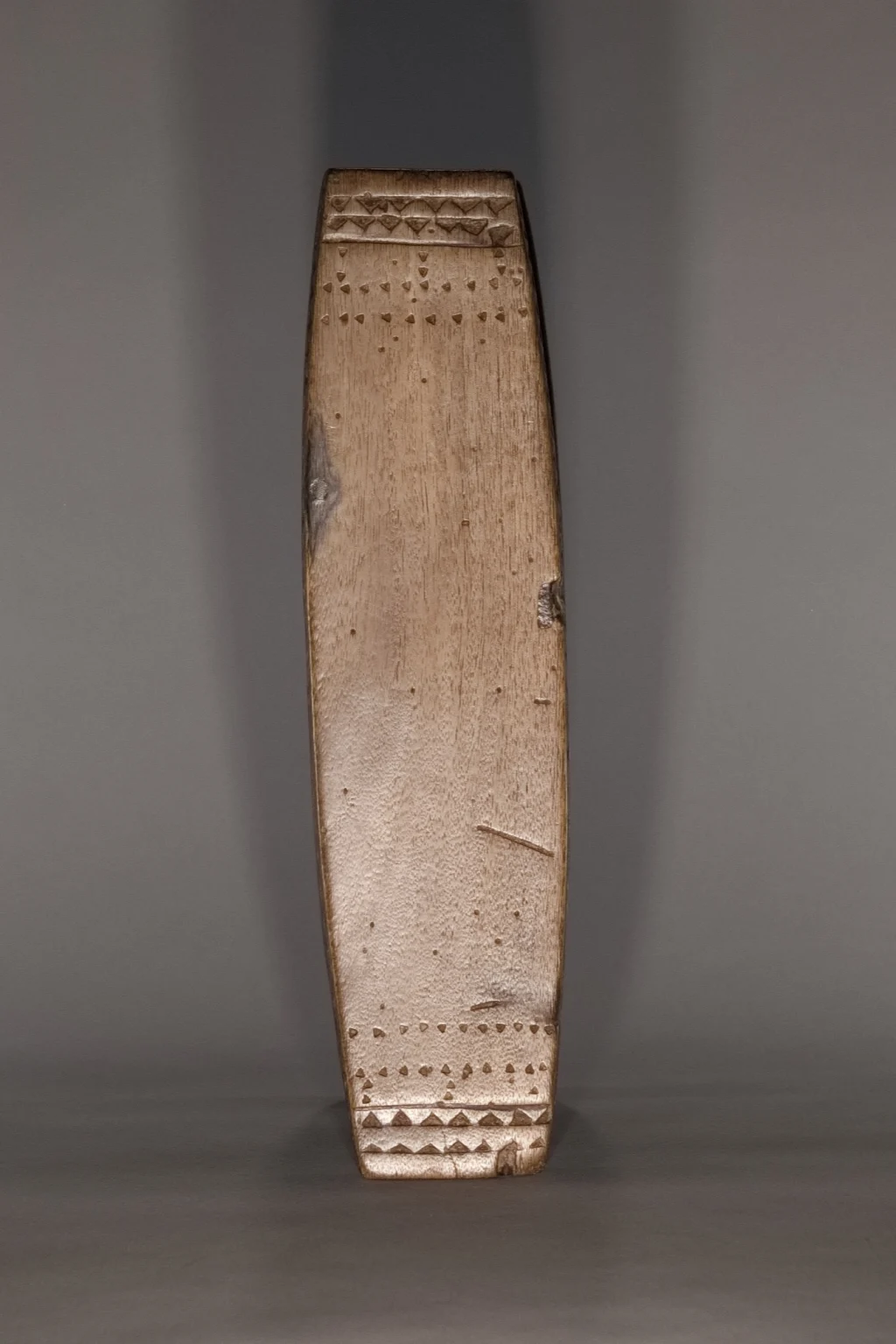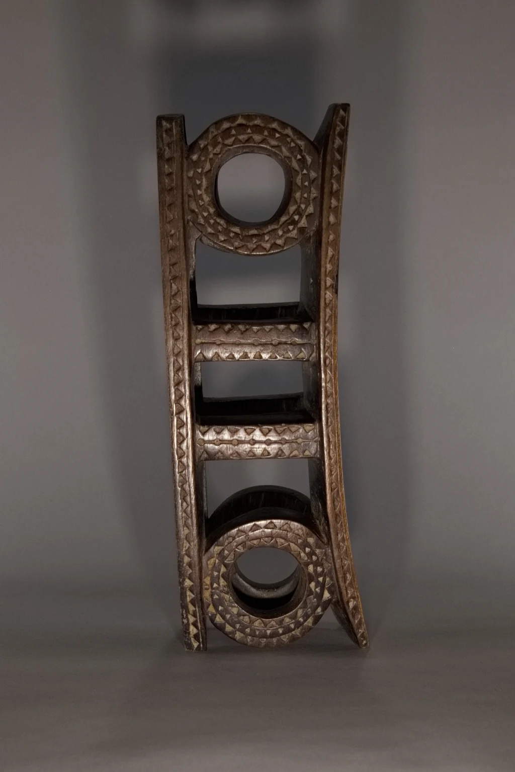 Un appuie-tête du XIXe siècle remarquable de délicatesse en raison de sa petite taille (seulement 11 centimètres de hauteur). Son design symbolise le soleil levant et le soleil couchant, orné d’engravures en formes de triangles, caractéristiques de la fin du XIXe et du début du XXe siècle. Une pièce fortement ressemblante aux œuvres du musée d’Ackland ou à celles collectées par la Johannesburg Art Gallery