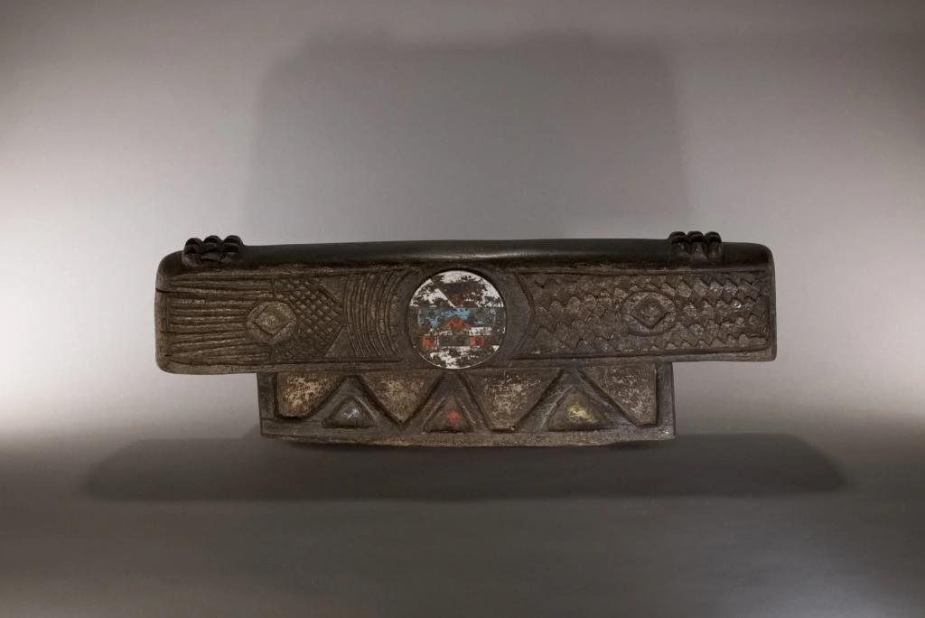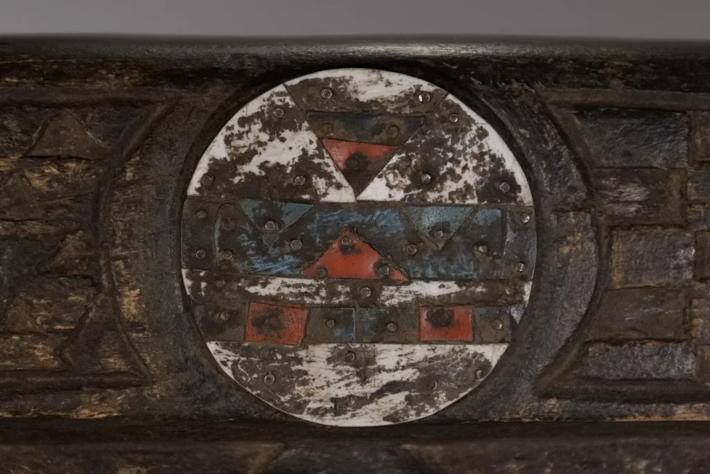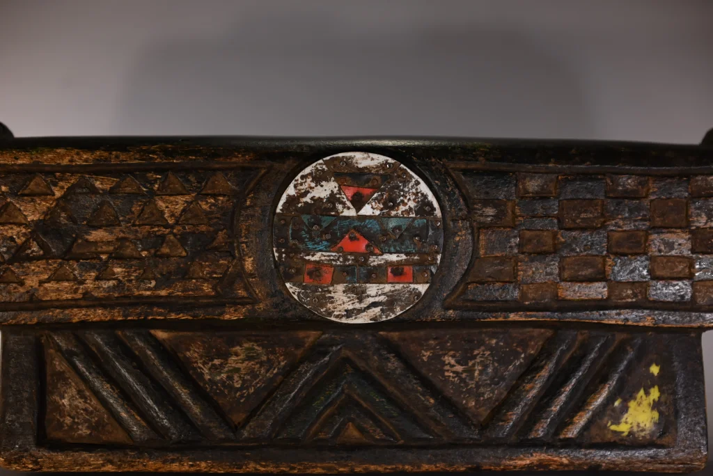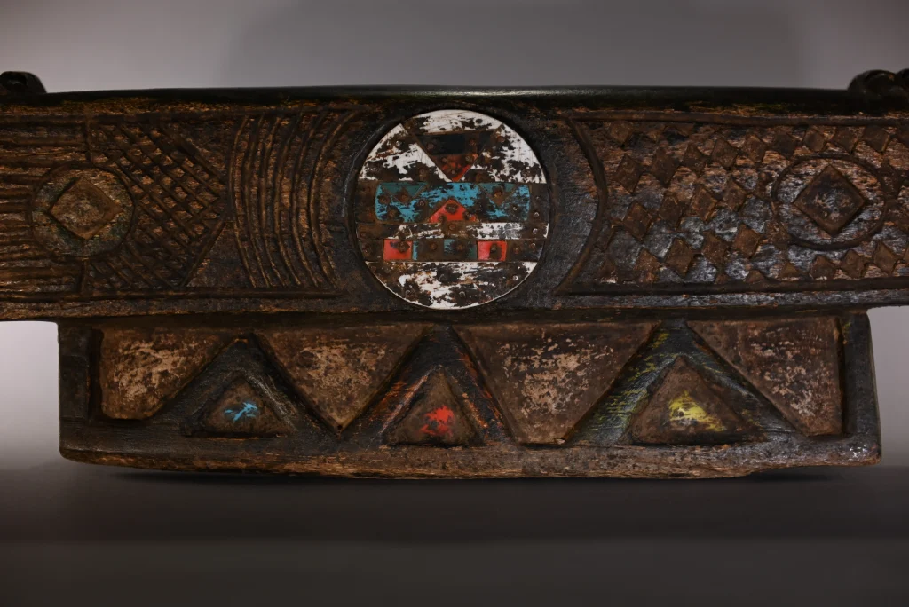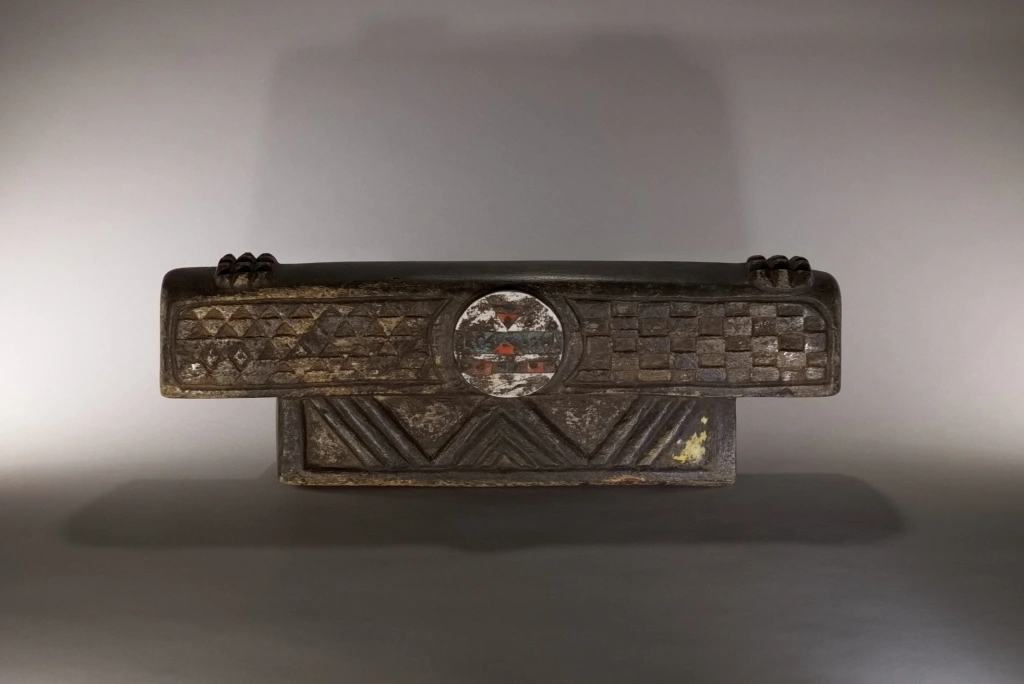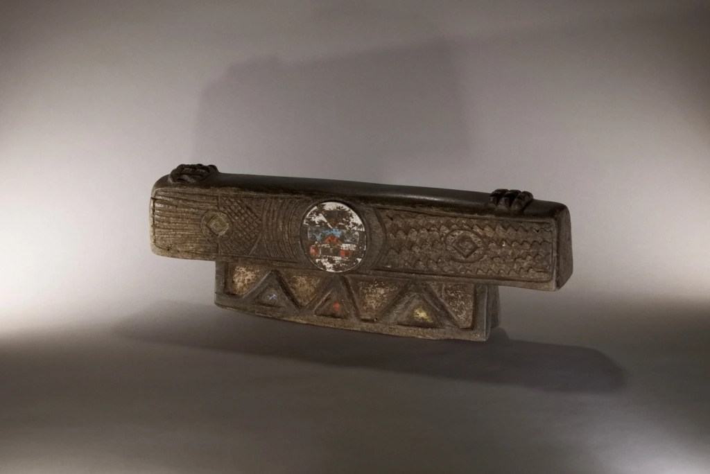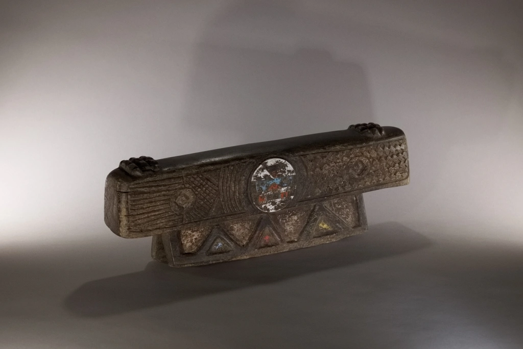 Belle pièce, peu habituelle et patinée par le temps. Sa barre d’appui est extrêmement intéressante, car très épaisse et bien plus longue que l’assise au sol. On notera que, pour éviter que le dormeur ne s’appuie sur le bord et ne fasse basculer son oreille, le sculpteur a positionné des points de diamant en relief. Les colorations de la barre d’appui, ornée d’un motif de boucle d’oreille, et du socle, décoré de sept triangles colorés, égayent cet appuie-tête, même si plus d’un siècle a commencé à en estomper les décorations.