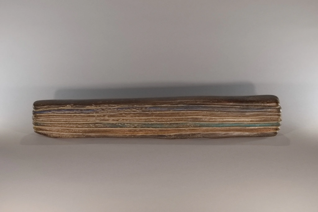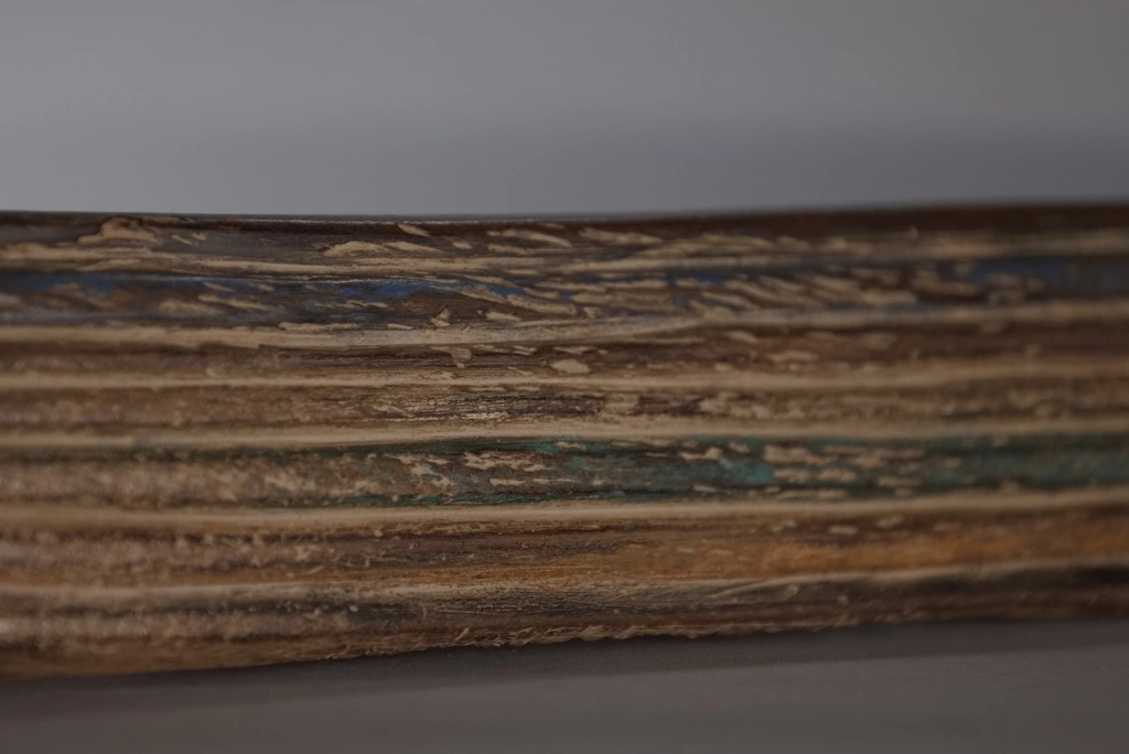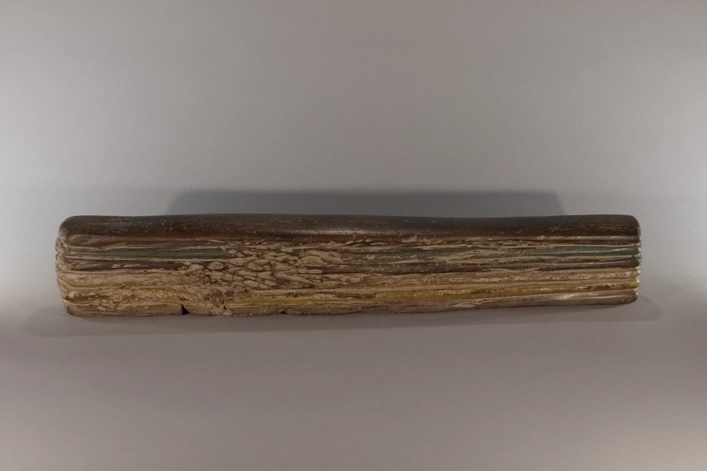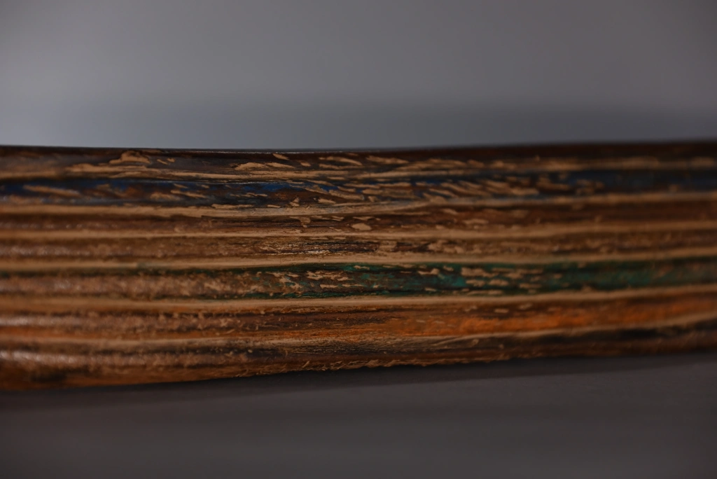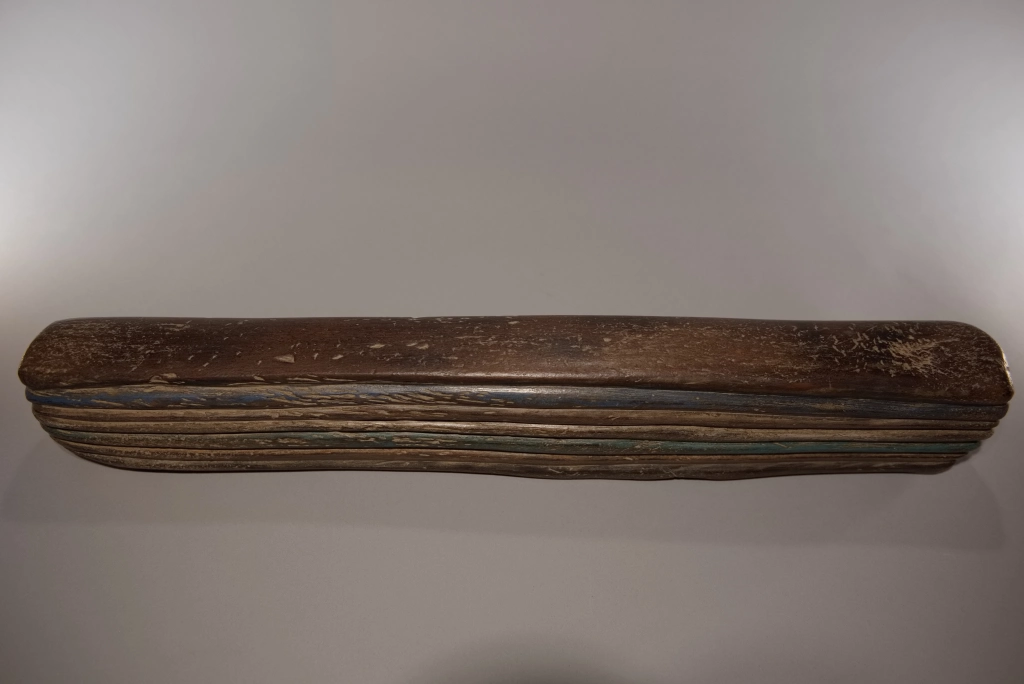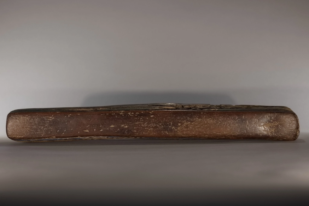Un appuie-tête utilitaire, comme cela arrive parfois. Outre sa fonction d’oreiller, ses propriétaires lui ont attribué un second usage. Cette pièce cumule également la fonction de planche à découper, comme en témoignent les traces de couteau visibles sur ses faces supérieures et inférieures. Mais son originalité réside encore ailleurs : il servait aussi de présentoir à cigarettes, grâce aux rainures sculptées sur ses faces latérales. En Afrique du Sud, comme dans de nombreux pays africains, les vendeurs de cigarettes au détail sont légion. Les six rainures, peintes aux couleurs du drapeau sud-africain, permettaient ainsi de présenter six sortes de cigarettes aux acheteurs.