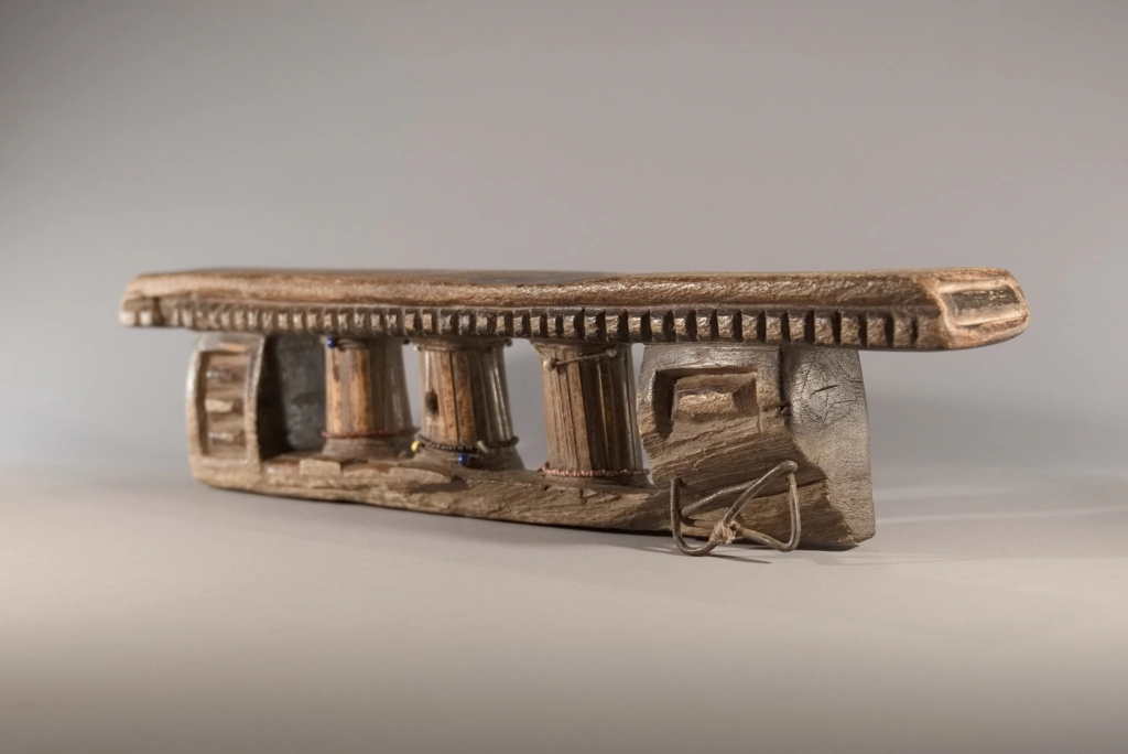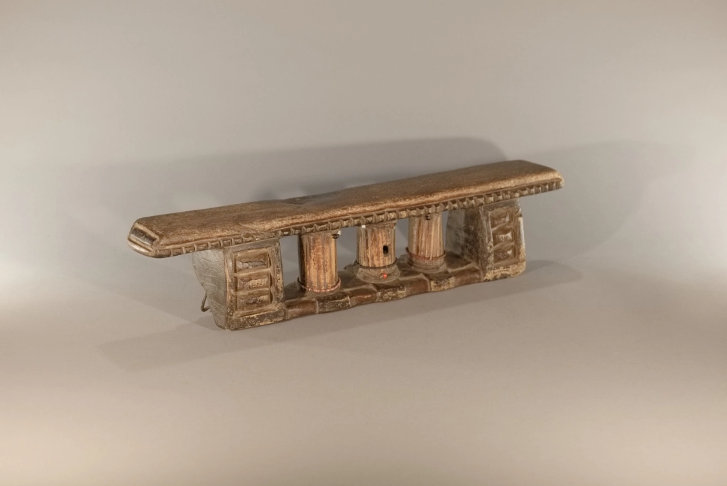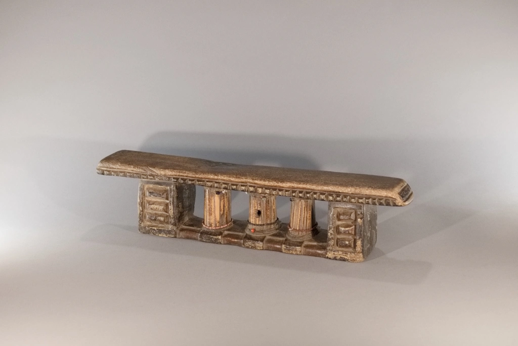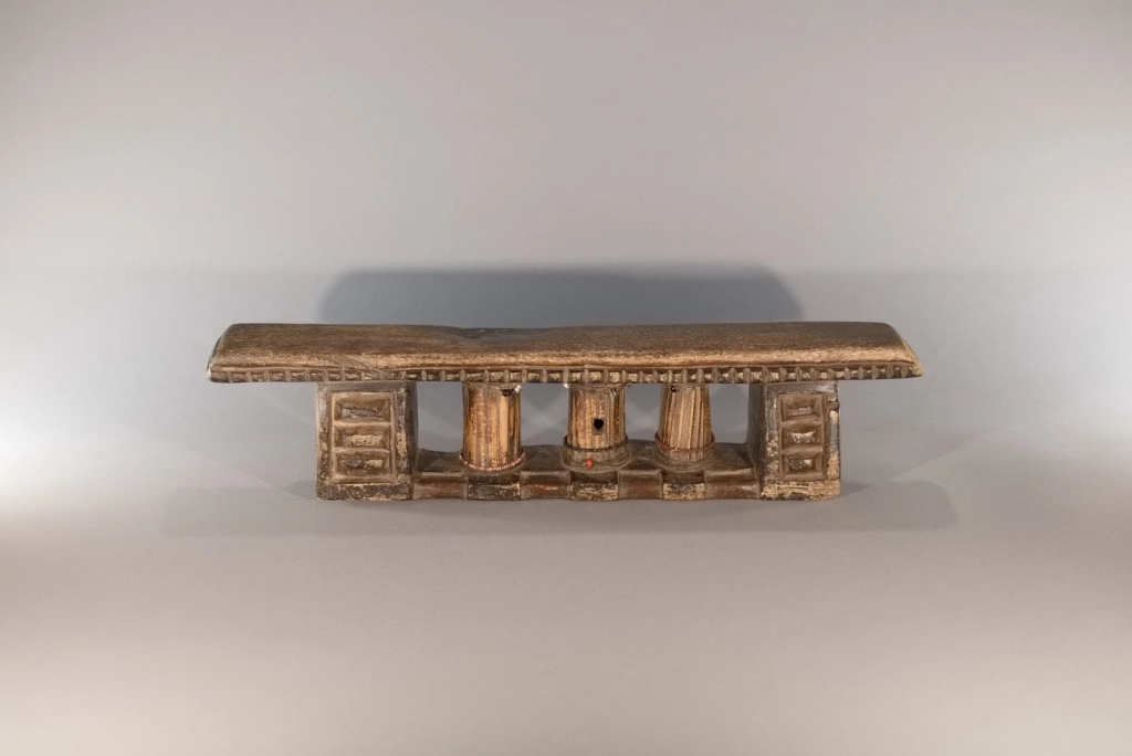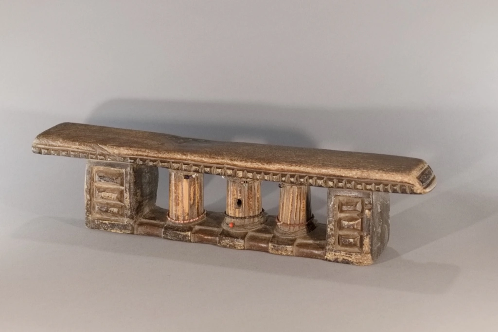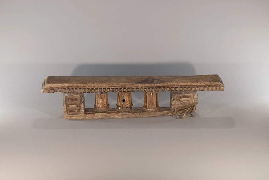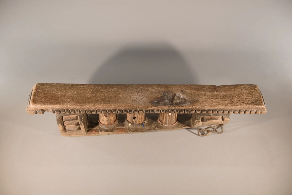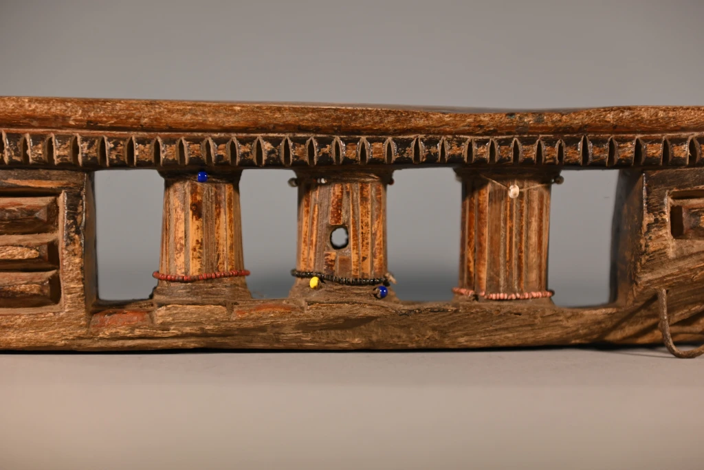 Une superbe pièce extrêmement ancienne, probablement de la mi-XIXe siècle. Ses trois petites colonnes centrales à facettes sont tellement patinées qu’elles ont acquis, au fil des siècles, un aspect d’ivoire absolument magnifique. On notera que ces trois colonnes sont cerclées d’un bracelet de perles coloré, ajouté par l’un des descendants propriétaires de l’objet au cours du XXᵉ siècle, ces décorations étant apparues à partir de la mi-XXe siècle. Les chocs et éclats visibles sur la base et la barre d’appui, stigmates du temps, n’altèrent en rien l’équilibre entre force et finesse de cette pièce exceptionnelle.