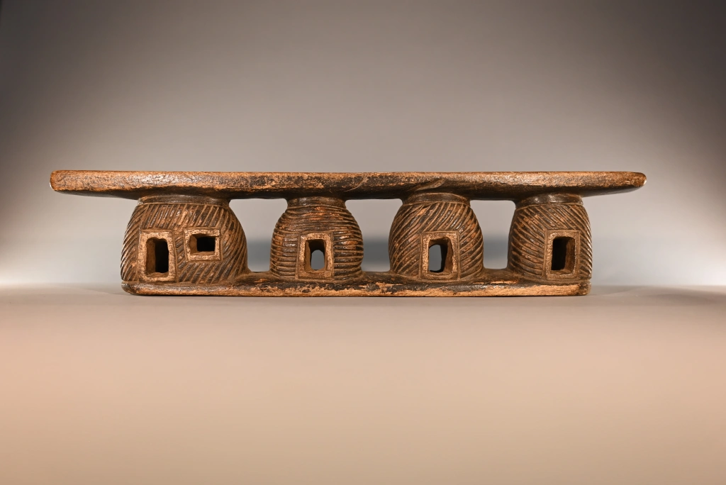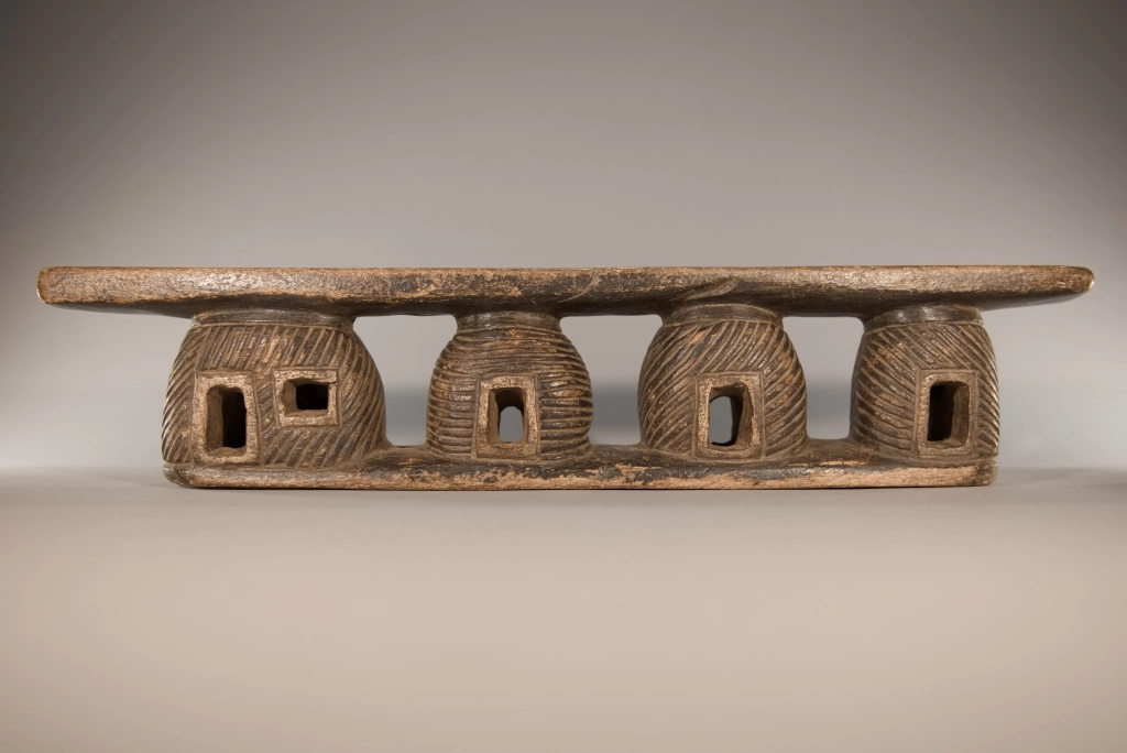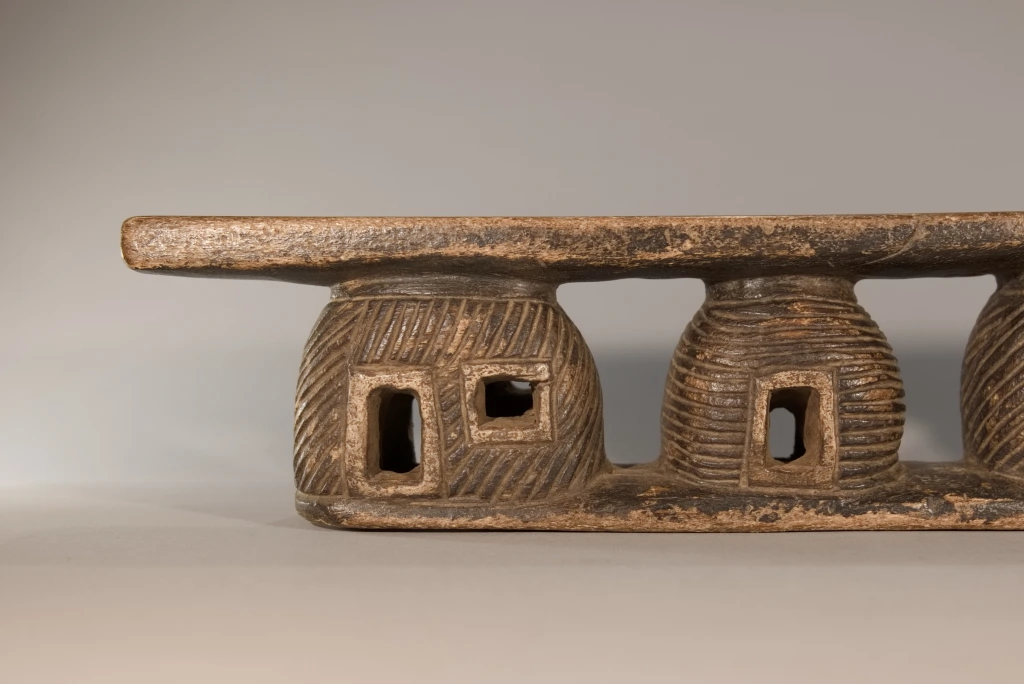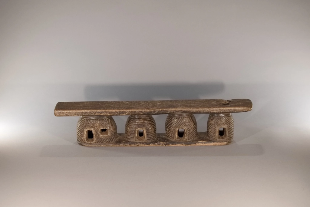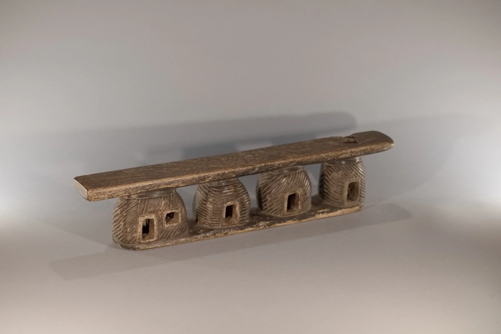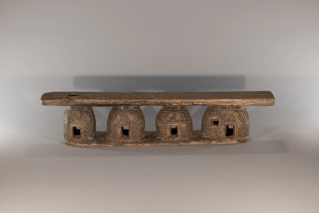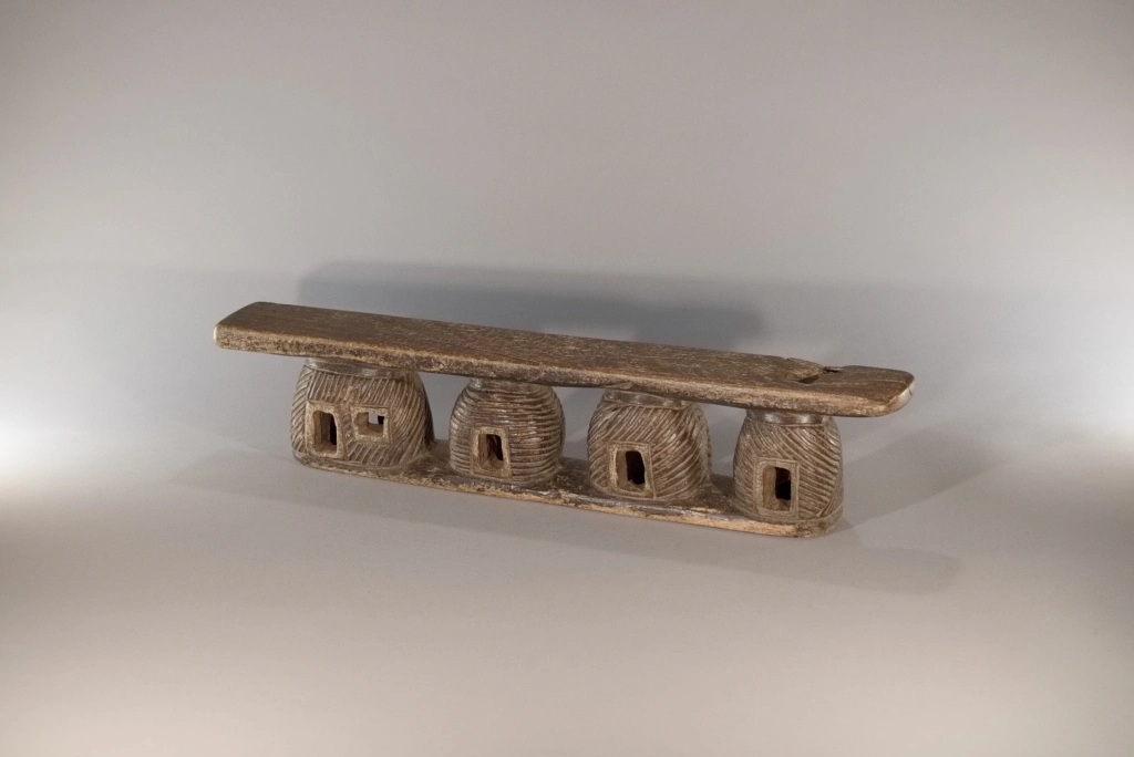 Divers appuie-têtes sont inspirés ou représentent l’habitat zoulou, qu’il s’agisse de maisons ou, comme ici, de cases typiques. Le design très stylisé confère à cette pièce une forte esthétique et une symbolique marquée : la case des parents, plus spacieuse, contraste avec celles des trois enfants, dont l’agencement reste plus ambigu. Le travail du sculpteur s’exprime aussi bien dans le revêtement des cases, strié de manière régulière, que dans l’idée d’avoir évidé les cases au niveau des portes et sous l’appui-tête. À noter que cette pièce a appartenu, sur plusieurs générations, aux souverains du peuple Tinyiko, constitué essentiellement de Tsongas ayant immigré du KwaZulu-Natal vers le Limpopo.
