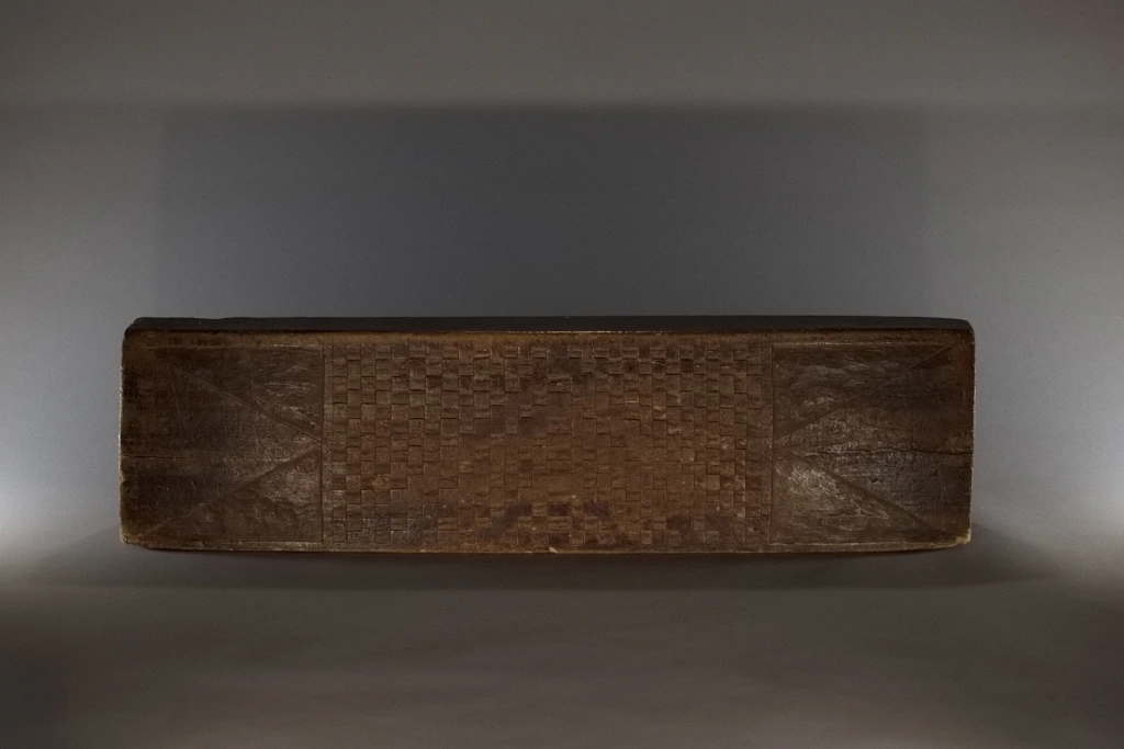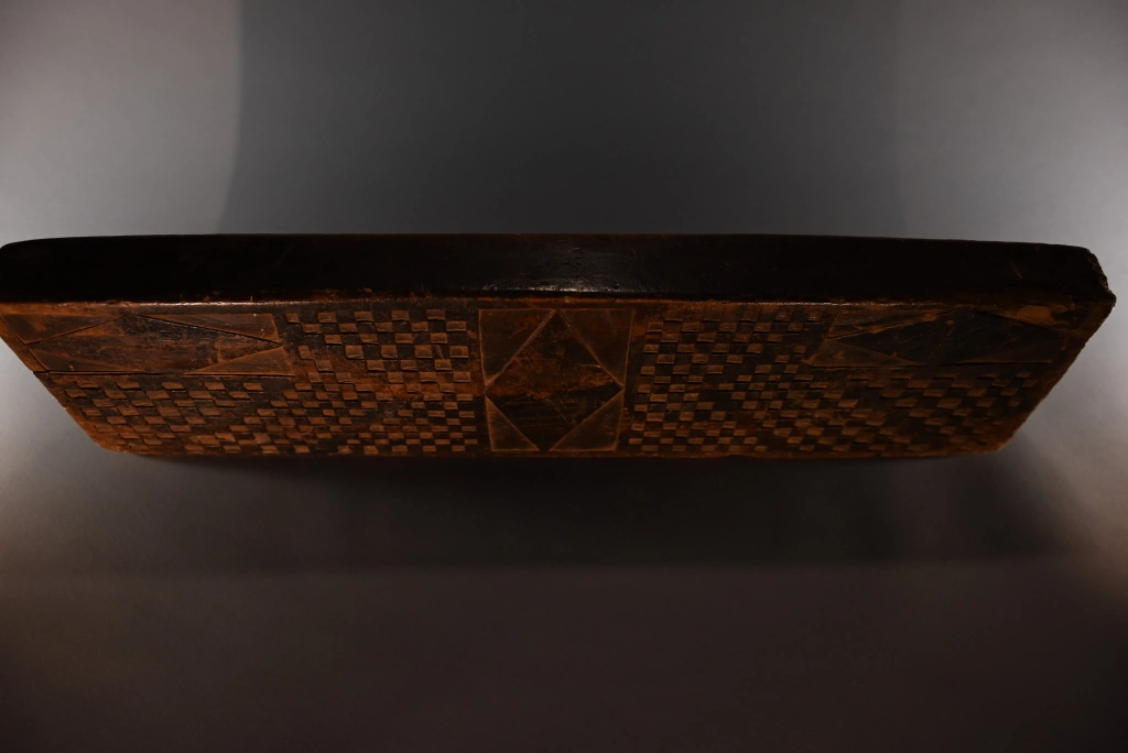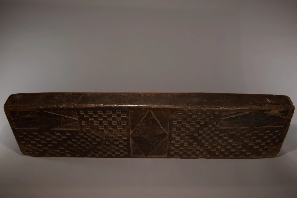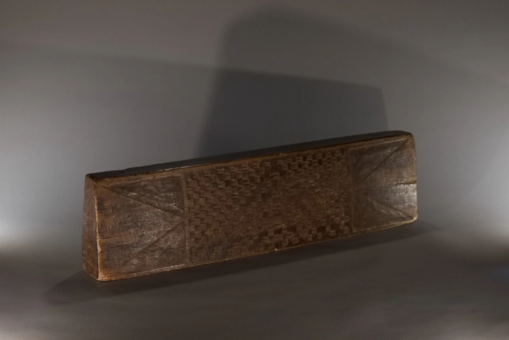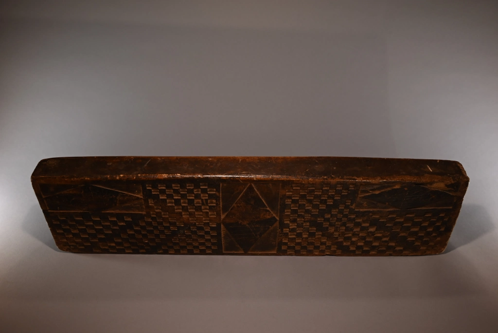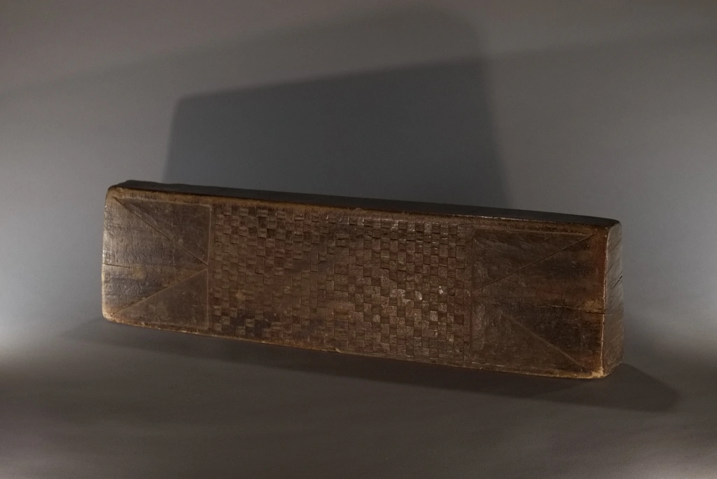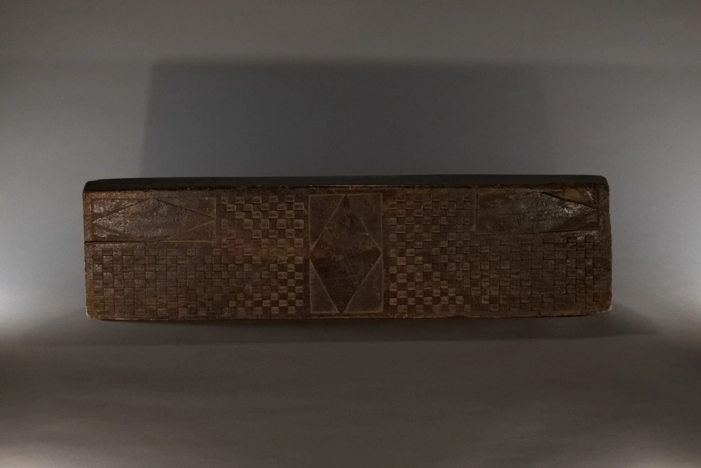 Bloc en bois léger, décoré de damiers, losanges et pointes de diamants. Les damiers, savamment sculptés, forment des figures asymétriques (croix et triangles) lorsqu’ils sont observés avec du recul. Cette pièce, à la fois classique et captivante par sa patine miel chatoyante, a appartenu à Roger Orchard, un collectionneur sud-africain bien connu.