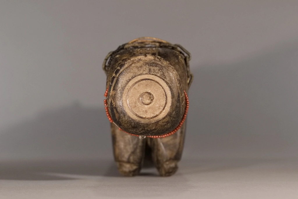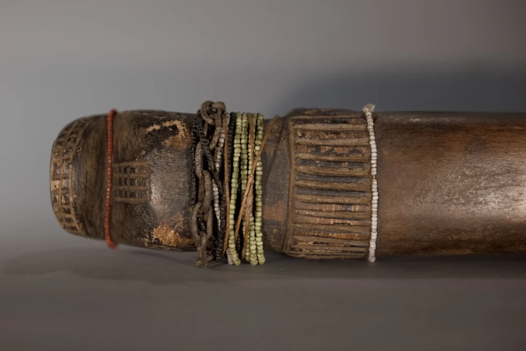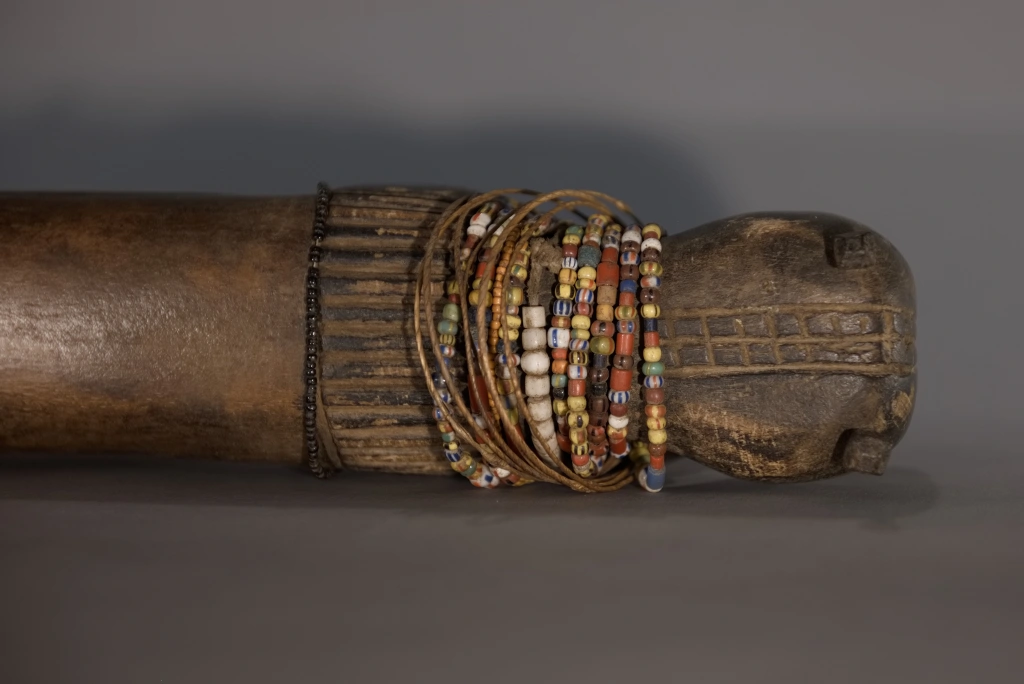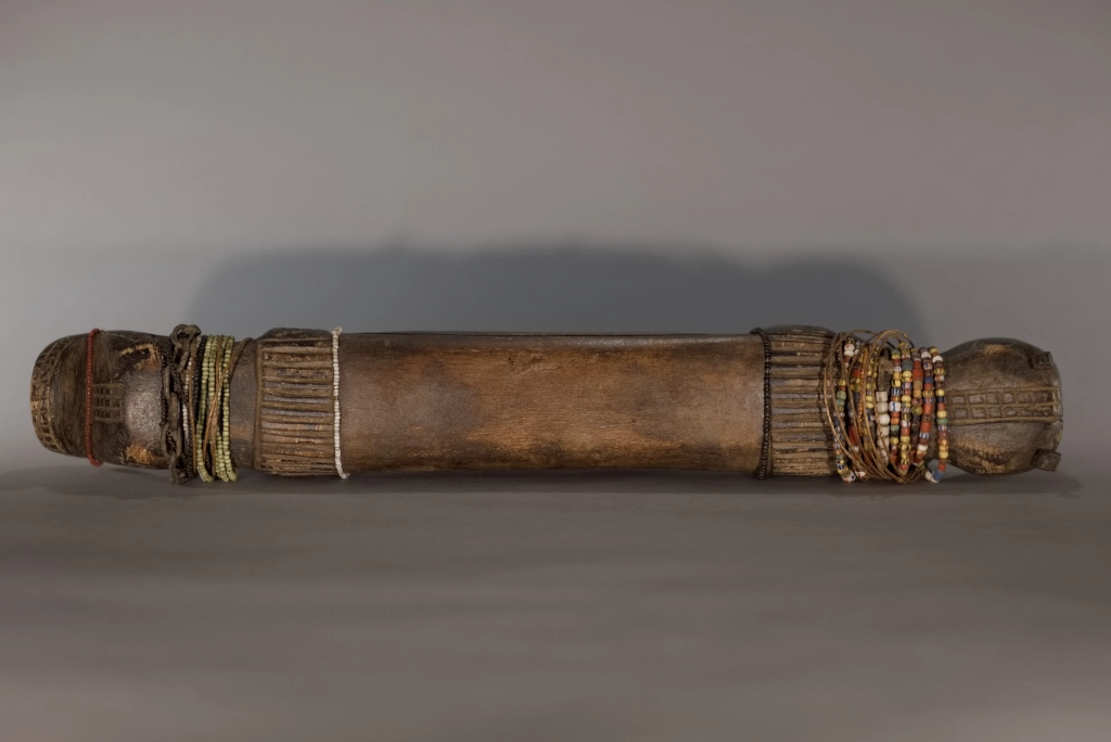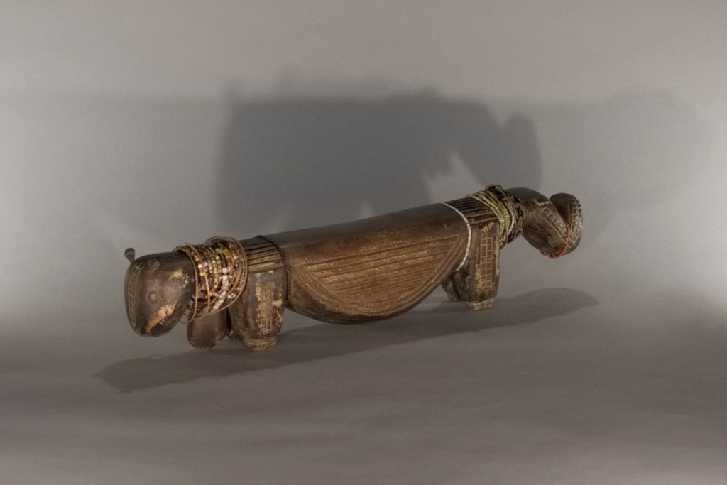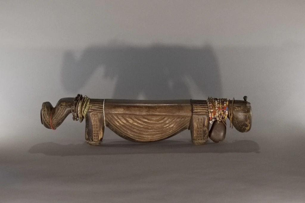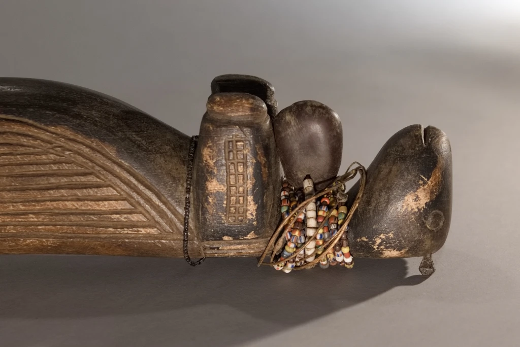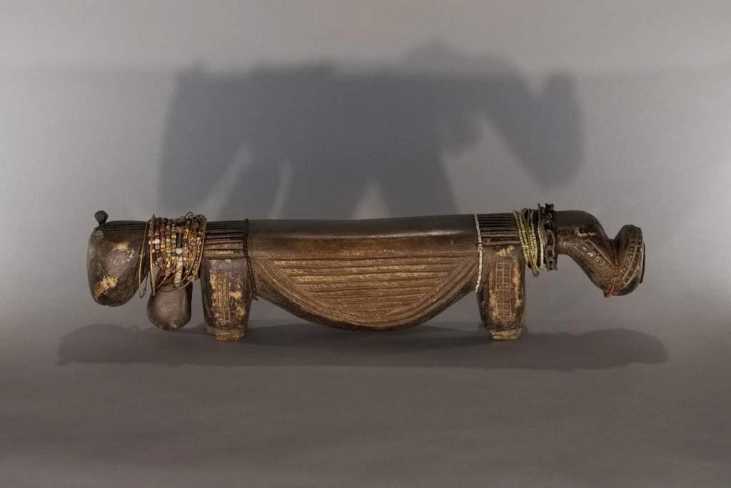 La province de Mpumalanga, qui signifie « lieu où se lève le soleil » en zoulou, xhosa ou ndebele, regorgeait d’appuis-tête originaux, comme cette pièce. De forme zoomorphe, il représente un bovin dont la panse frôle le sol. Le sculpteur a stylisé la tête, surmontée de deux oreilles fines et délicates, ainsi qu’une queue conséquente, aussi volumineuse que la tête. Outre sa forme originale, cet appuie-tête extrêmement bas (moins de 10 cm) a été personnalisé par sa propriétaire originelle, qui l’a orné de multiples bracelets de perles lui ayant appartenu, ce qui confère à cette pièce une double vitalité.