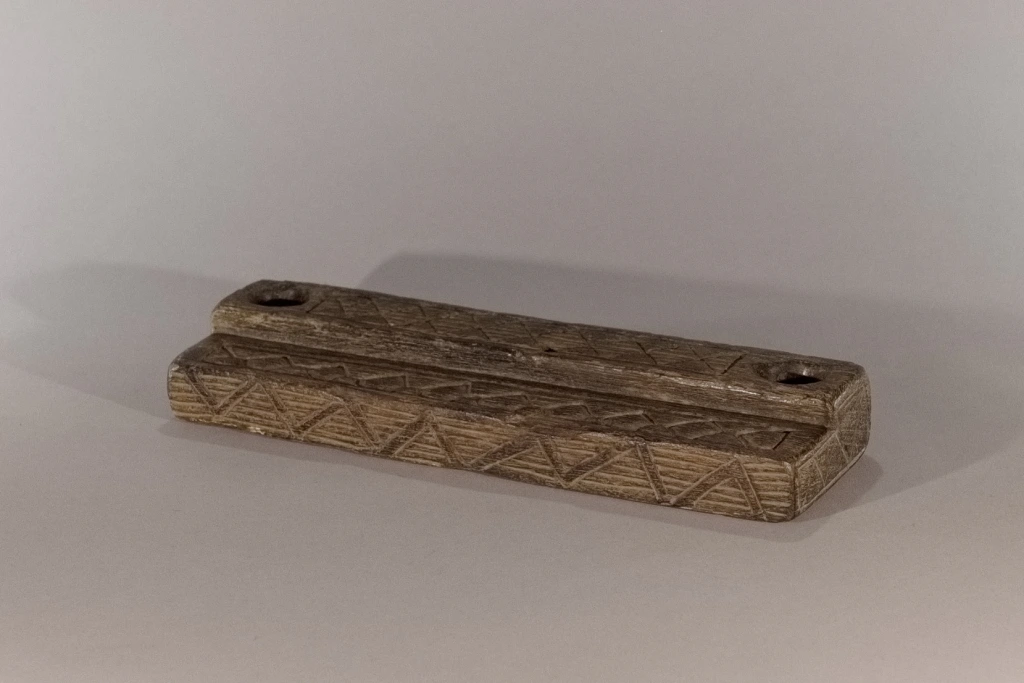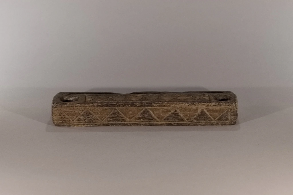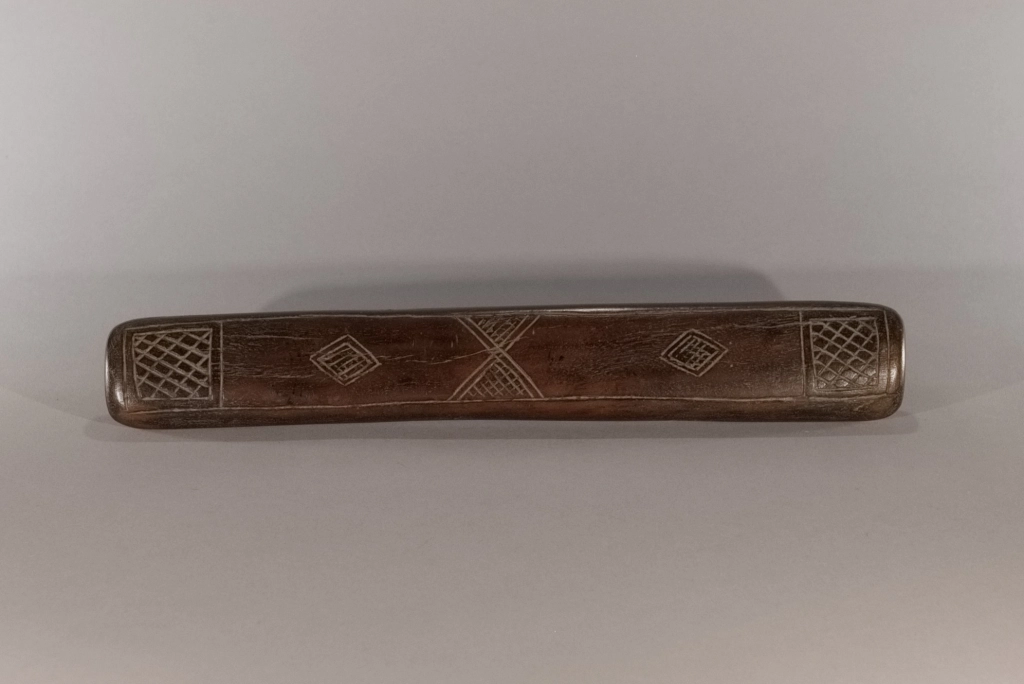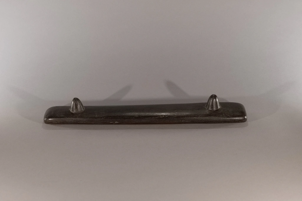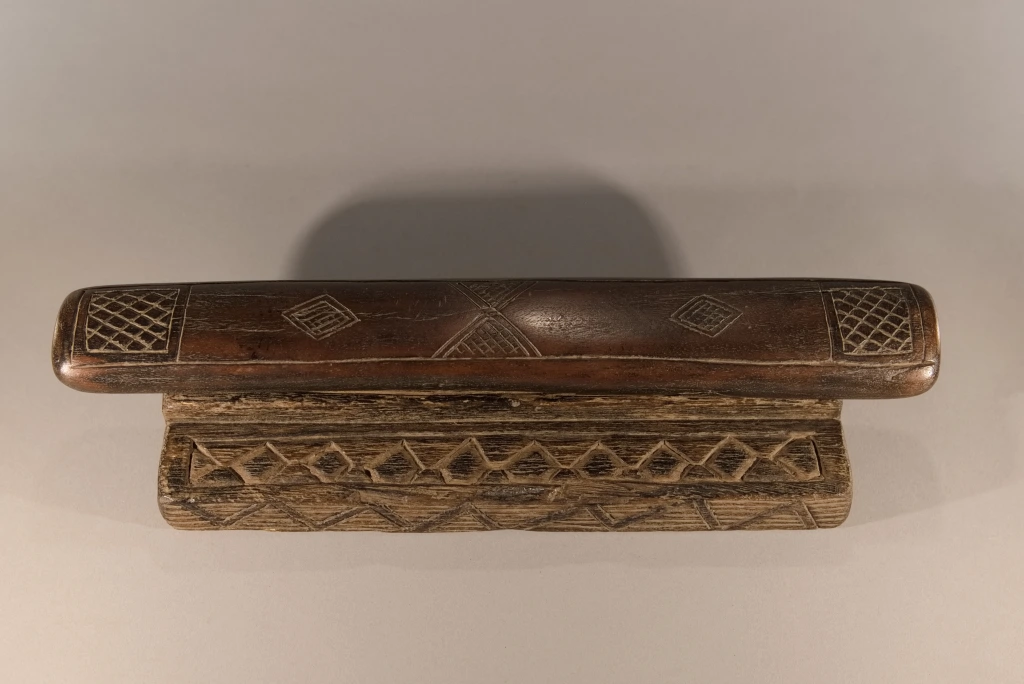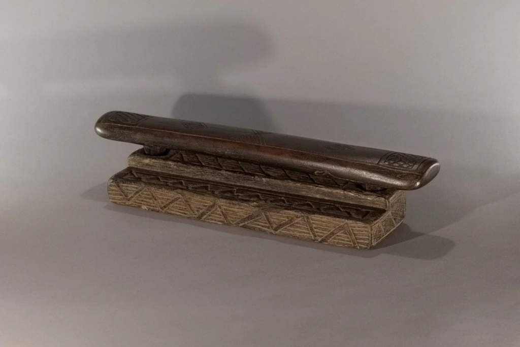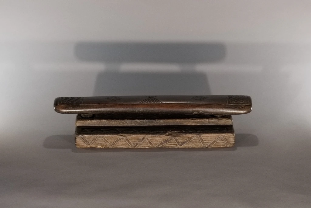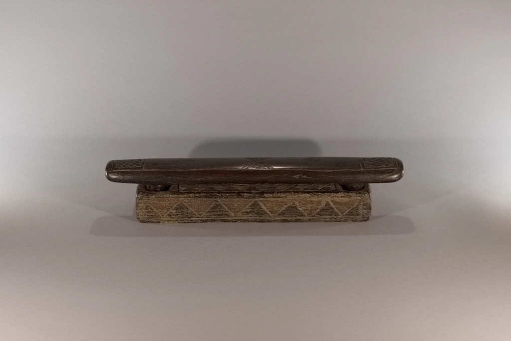 Pièce extrêmement rare, unique dans la collection, et identifiée ailleurs uniquement une fois, au MET Museum. Sa particularité réside dans sa conception en deux parties distinctes : l’assise et la barre d’appui, qui se désolidarisent complètement et s’emboîtent avant utilisation grâce à deux tétons coniques. Ce système assure non seulement la stabilité de l’ensemble, mais permet aussi un certain degré de liberté, offrant la possibilité d’incliner la barre d’appui à volonté pour un confort exceptionnel. Sa décoration, d’une grande simplicité, reposant sur un contraste subtil entre les deux parties : l’une claire, l’autre foncée, conférant à cet appuie-tête un cachet étonnant.