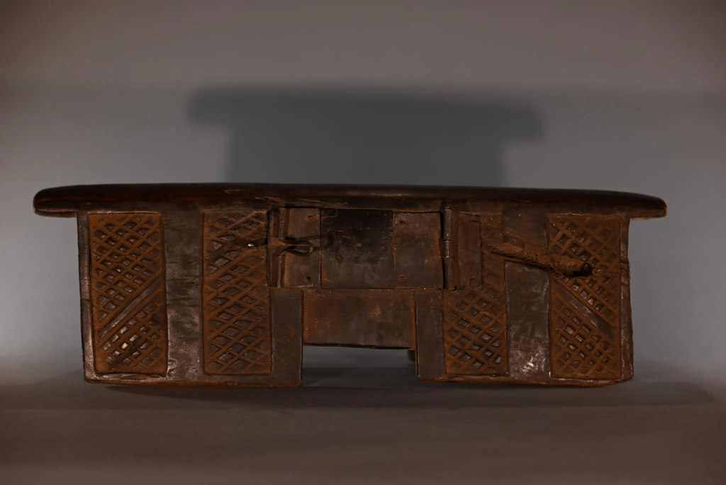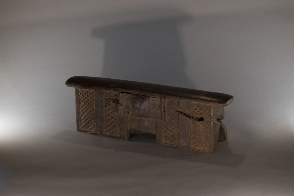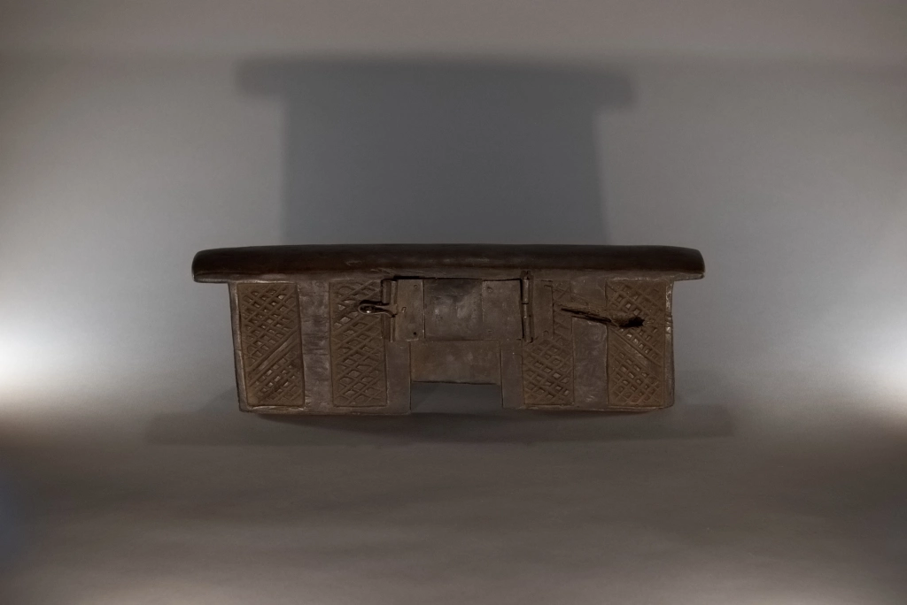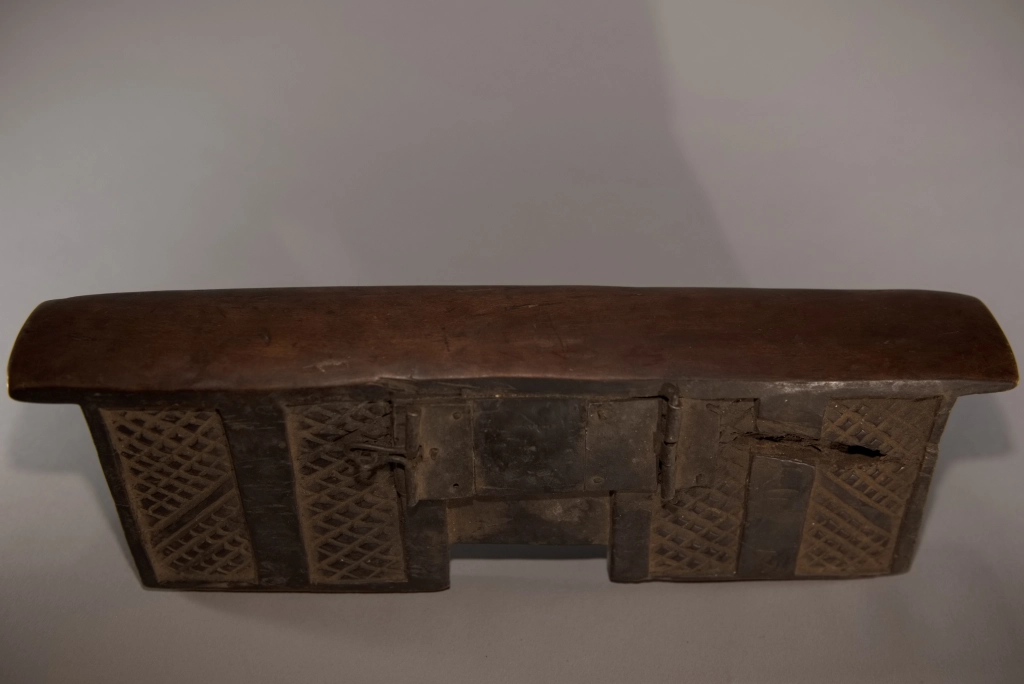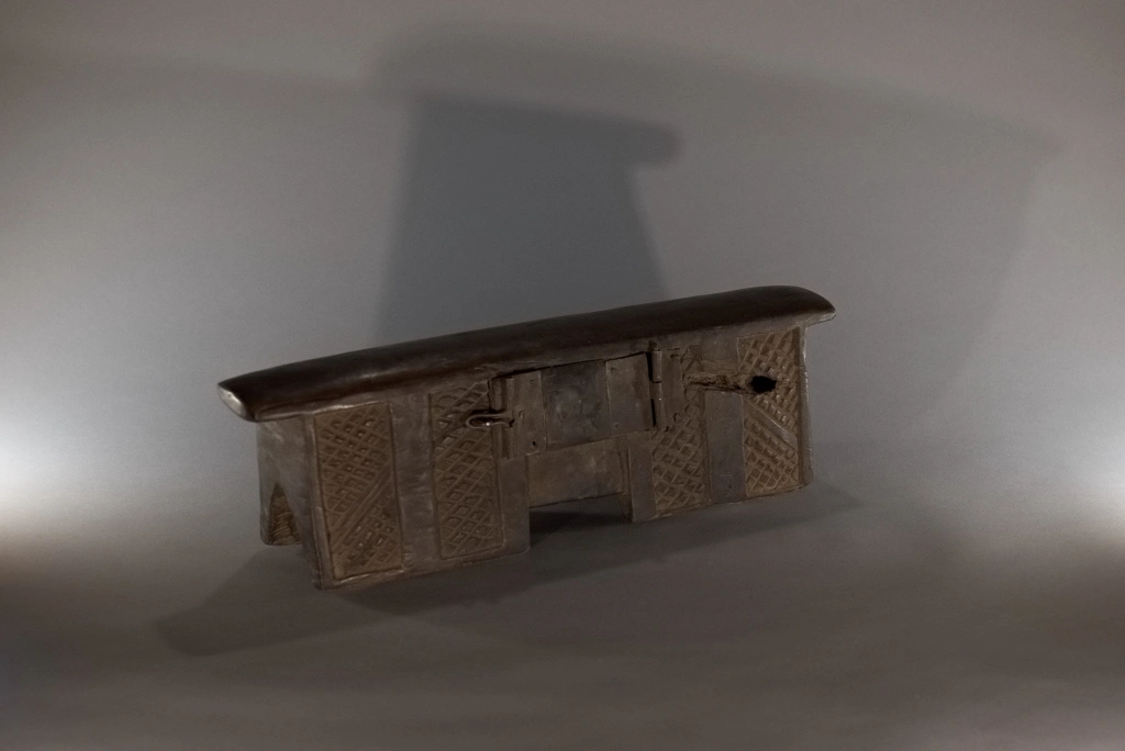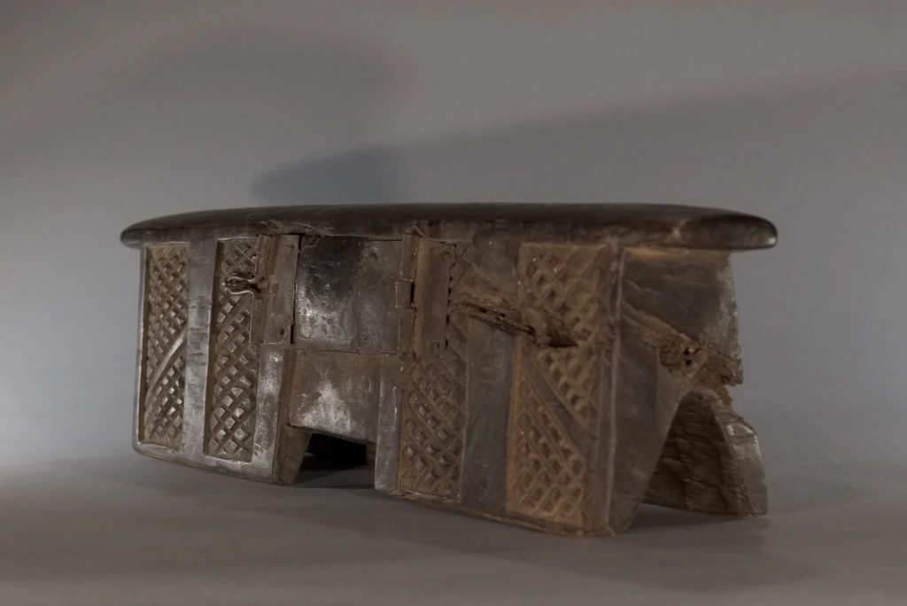 Ce type d’appuis-tête a commencé à apparaître au début du XIXᵉ siècle, il y a fort longtemps, et a perduré chez différentes générations de sculpteurs jusqu’au début du XXᵉ siècle. Solide et fonctionnel grâce à sa boîte centrale fermée par une porte et un loquet, il a été très prisé au fil des siècles. Nvuyo a longtemps conservé son appuie-tête avec elle, non seulement parce qu’il était dans sa famille depuis trois ou quatre générations, mais aussi parce qu’elle y gardait son argent et ses bijoux. Une véritable forme de coffre-fort personnel.